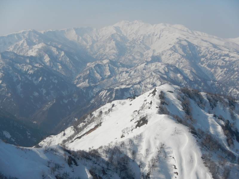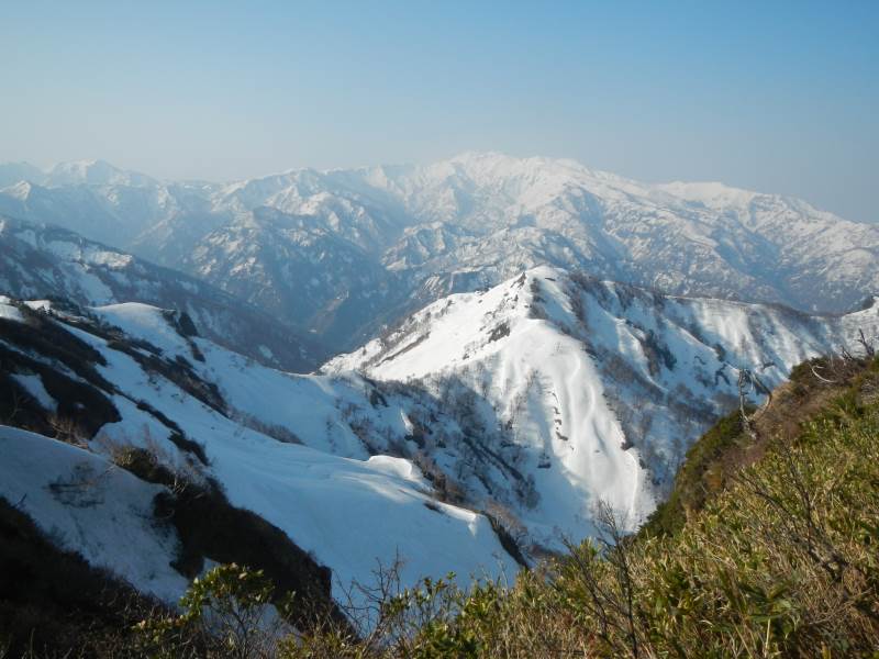 山頂から雄大な白山などの残雪の山々の景色を楽しみました。テントに戻って撤収、下山途中、左の尾根に行くべき所を真っ直ぐ行ってしまいましたが、すぐに間違いに気づき正しいルートに復帰しました。下山の藪漕ぎはちょっとだけ登りより楽でした。下山後、道の駅「禅の里」で入浴し帰京しました。