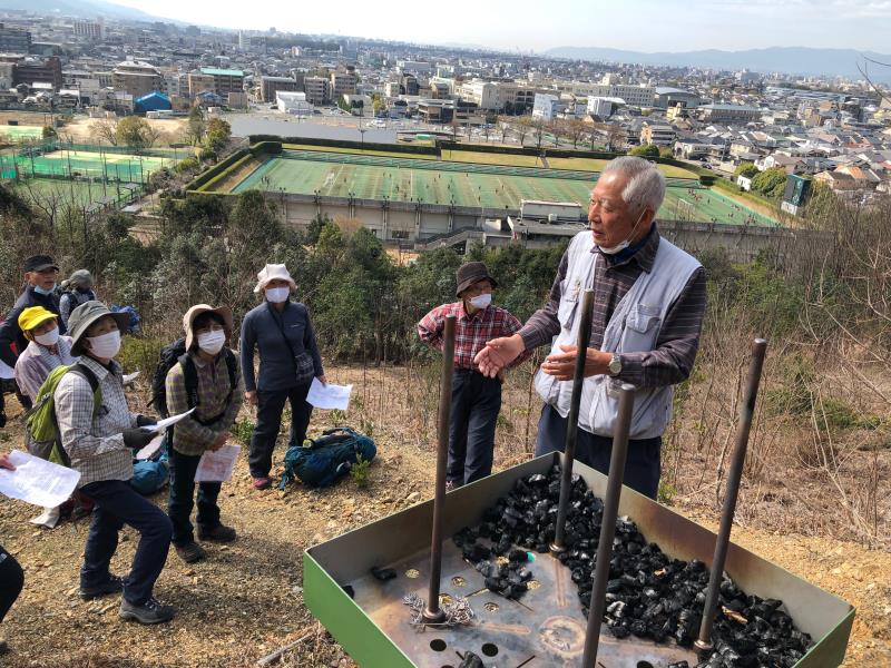 地元松ヶ崎出身の会員M.Yさんが、保存会(公益財団法人松ヶ崎立正会)にお願いをして下さって、特別に火床の見学許可を得てくださったのです。普段立ち入ることのできない火床に入らせていただきました。資料も作ってくださり、送り火の歴史や火床維持整備のご苦労などをお聞きすることができました。ありがとうございました。