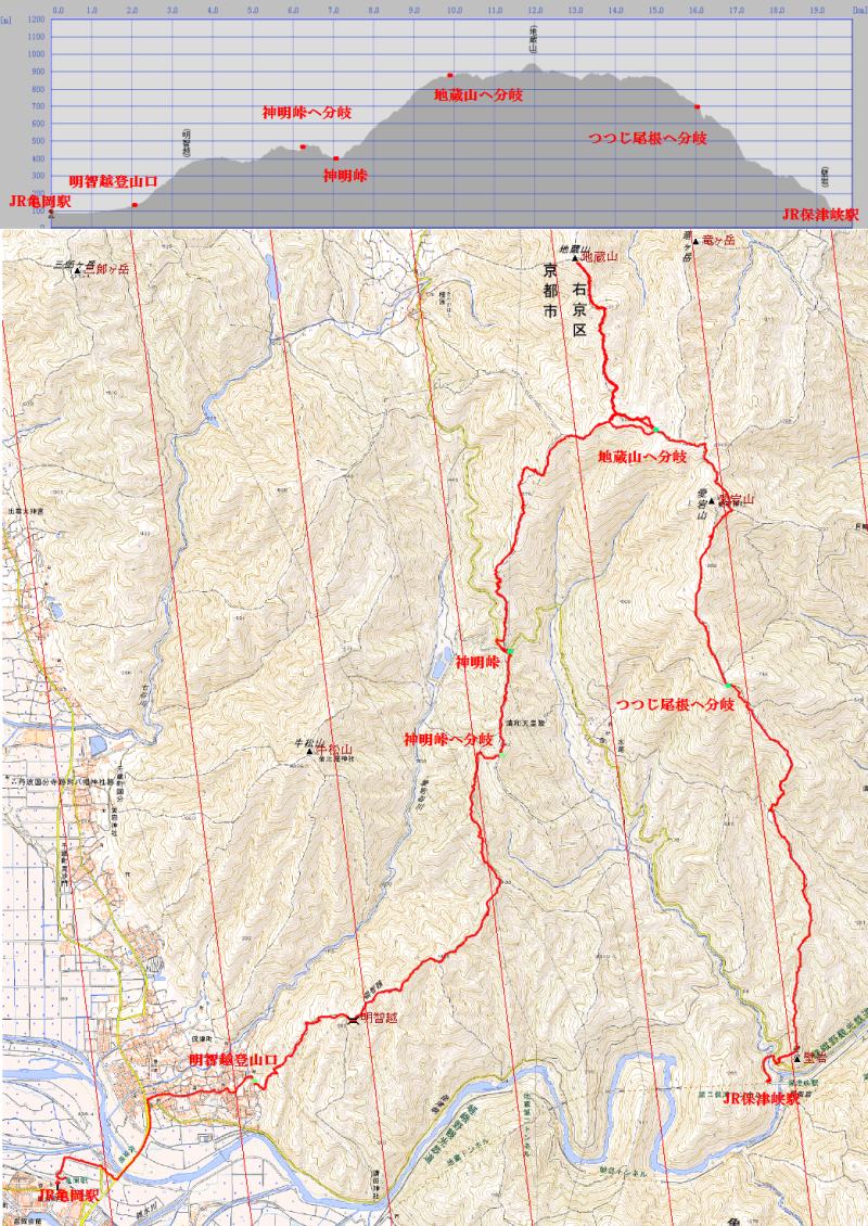 JR亀岡駅~明智越~神明峠~地蔵山~愛宕山~ツツジ尾根~JR保津峡駅のやや長めのあまり一般的でないルート(距離は約21km)を歩きました。予想外の大人数での山行になりましたが、山田さんに最後をお願いでき、安心して歩けました。途中、地蔵山への分岐を見落としてメンバーにルートを探してもらい、少し戻ったりもしながら山頂に着きました。休憩後、下山は愛宕山三角点や愛宕神社には寄らず、ツツジ尾根を通って予定より少し早くJR保津峡駅に到着、ここで解散としました。