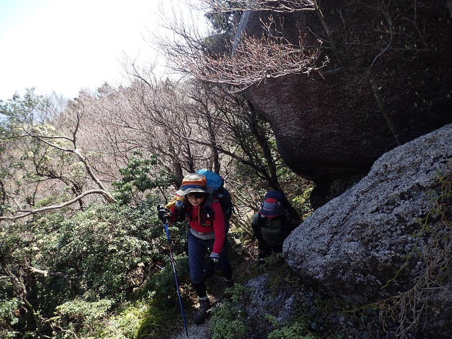 登山口から直登・トラバース・ガレ場の急登が続く。やっと山歩きに体が馴染んできた頃には、樹林帯に入り小さな渡渉を繰り返しながら更に進む。目印のテープを辿り、道迷いする事も無く入道ヶ岳に到着。