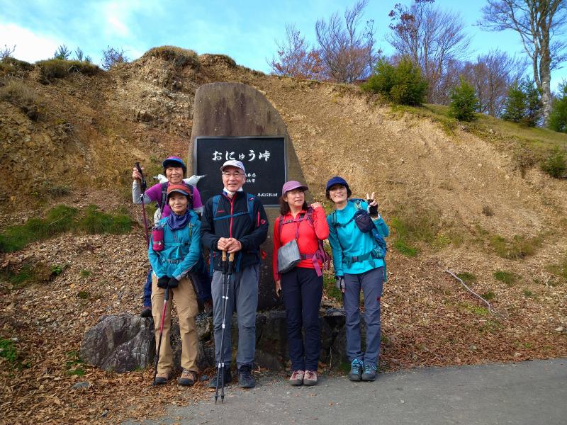 リーダーはこの百里ヶ岳の例会は過去にも何度かされているそうですが、今回の登山口の”おにゅう峠”は滋賀と福井の県境にある峠で、若狭から京都の出町柳をつなぐ鯖街道の一つの道中にあり、この時期は小入谷に架かる雲海と紅葉が有名だそうです。