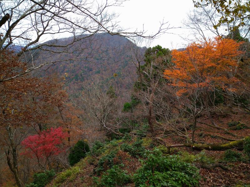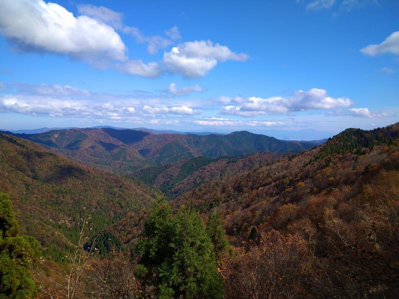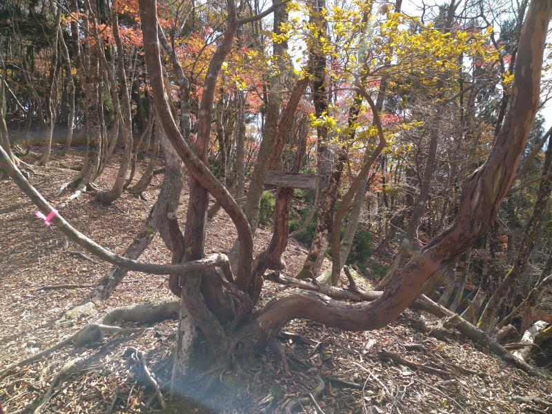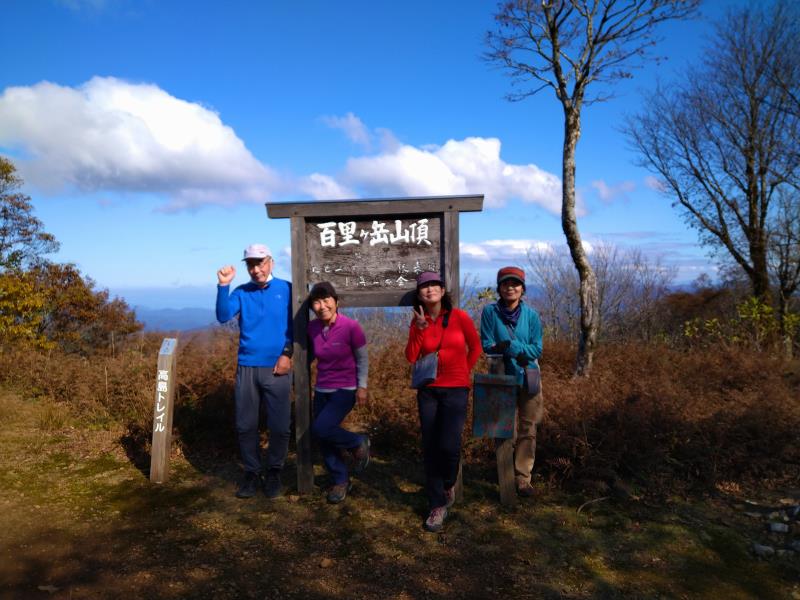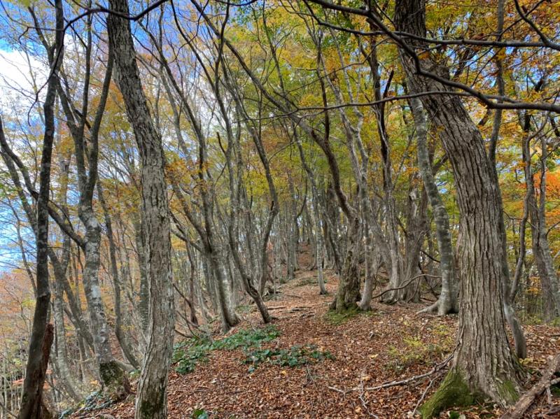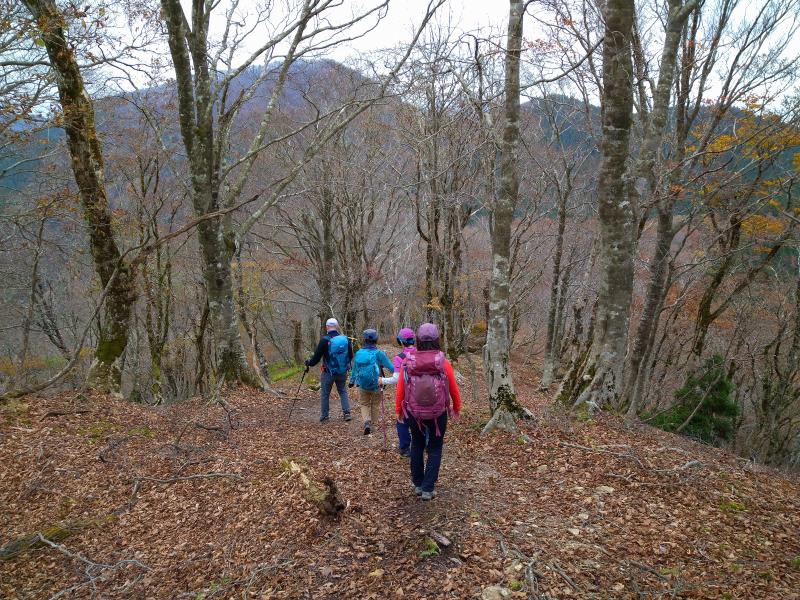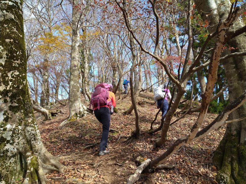 帰り道はピストンの予定でしたがリーダーのご厚意で、根来坂峠の分岐から先は参加者の私達のみで百里新道の尾根道を縦走させていただきました。私達が下山中の青空と紅葉を楽しんでいる間にピストンで下山し、百里新道の下山口まで車を回して下さったリーダーに感謝!(K.Y)