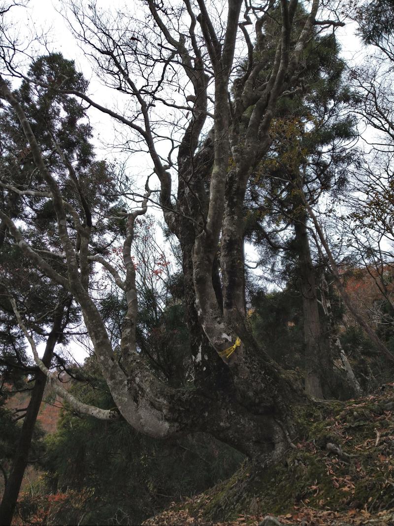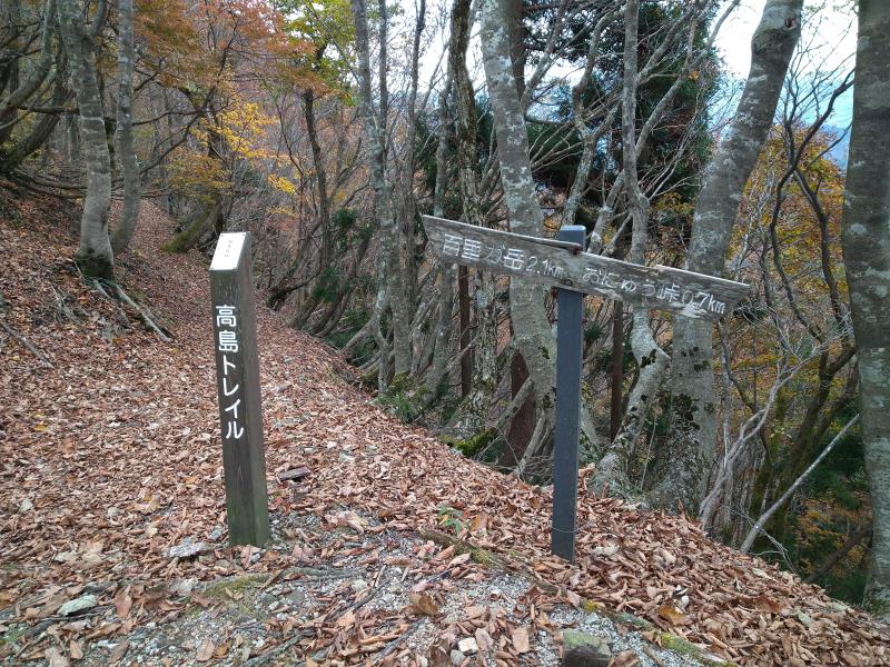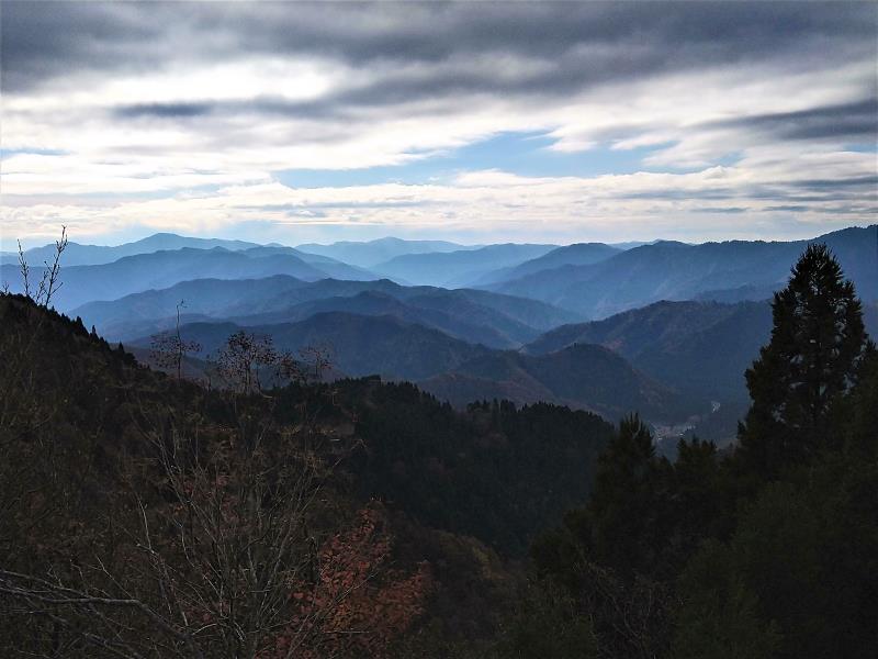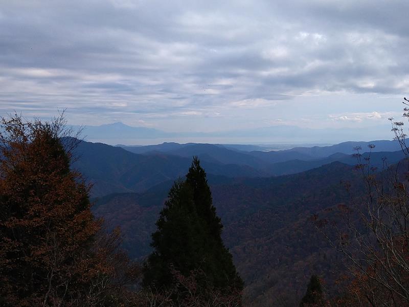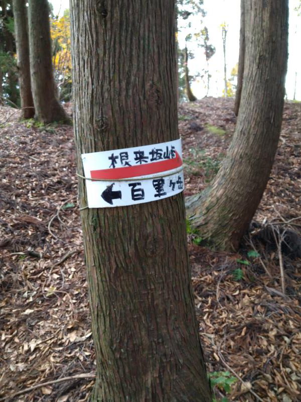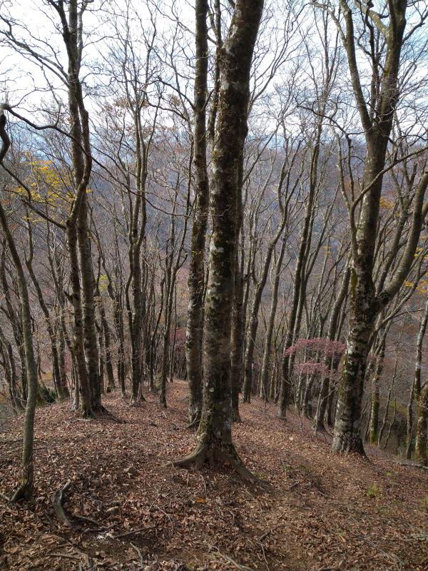 帰り道はピストンの予定でしたがリーダーのご厚意で、根来坂峠の分岐から先は参加者の私達のみで百里新道の尾根道を縦走させていただきました。私達が下山中の青空と紅葉を楽しんでいる間にピストンで下山し、百里新道の下山口まで車を回して下さったリーダーに感謝!(K.Y)