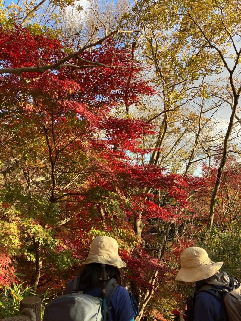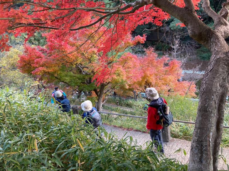 秋晴れのもと、会員6人で王子公園から出発。青谷道に入いると川沿いのもみじは彩りあざやか。