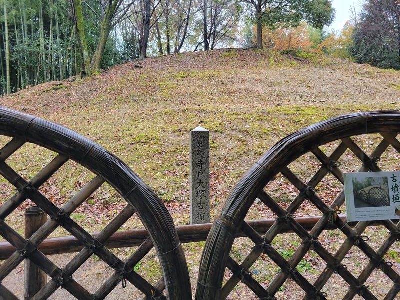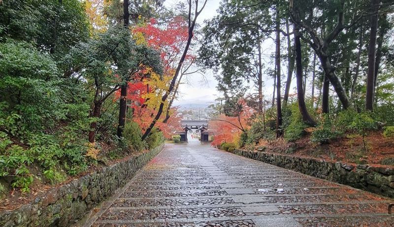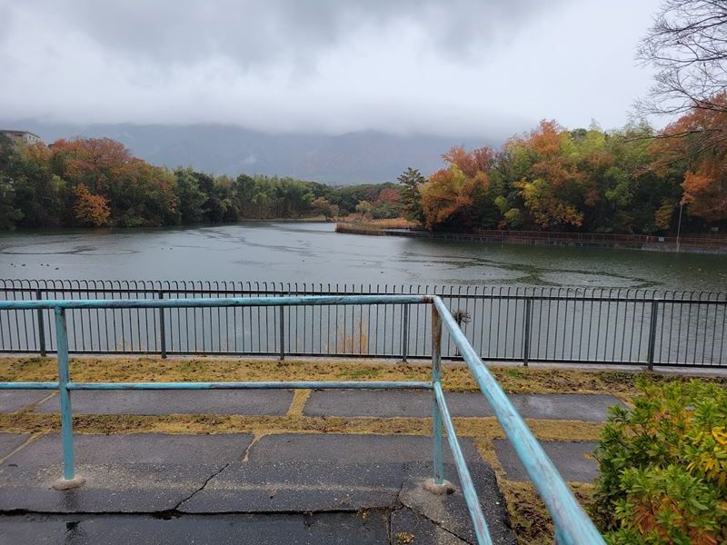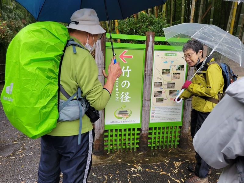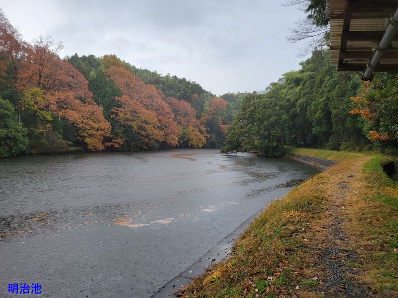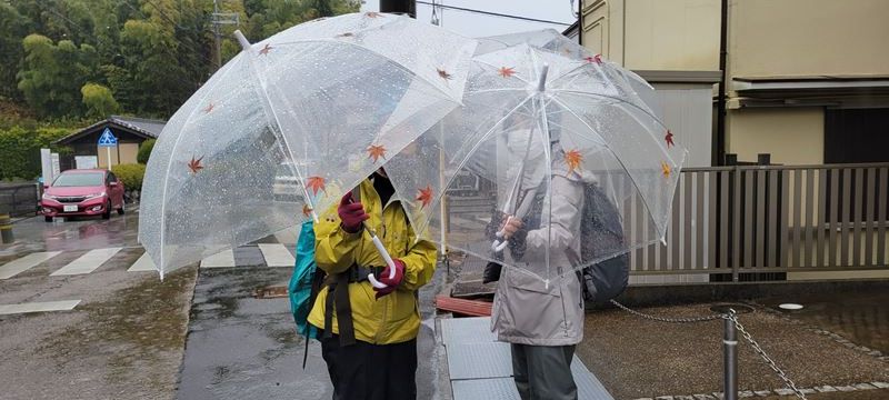 雨の光明寺は静かで、名残の紅葉もまだまだ素敵、参道の散り紅葉はしっとりと、一瞬比叡山が東の方に姿を現しました。もみじ参道を通り抜けた後の傘には、紅葉がきれいな模様となっていました。→さらに西山の山裾を歩いて、子守勝手神社、ジャブジャブ池、西山公園体育館新池→今里大塚古墳(乙訓最大級で、乙訓の石舞台とか)で終了→阪急長岡天神駅へ。周りの山々のお姿は見ることはできませんでしたが、各施設のスタッフの方が、雨の日にようこそと暖かく迎えてくださいました。次は晴れの日に。どんな景色が見えることでしょうか。(M・T) 画像・軌跡はM・NさんとH・Kさんです。