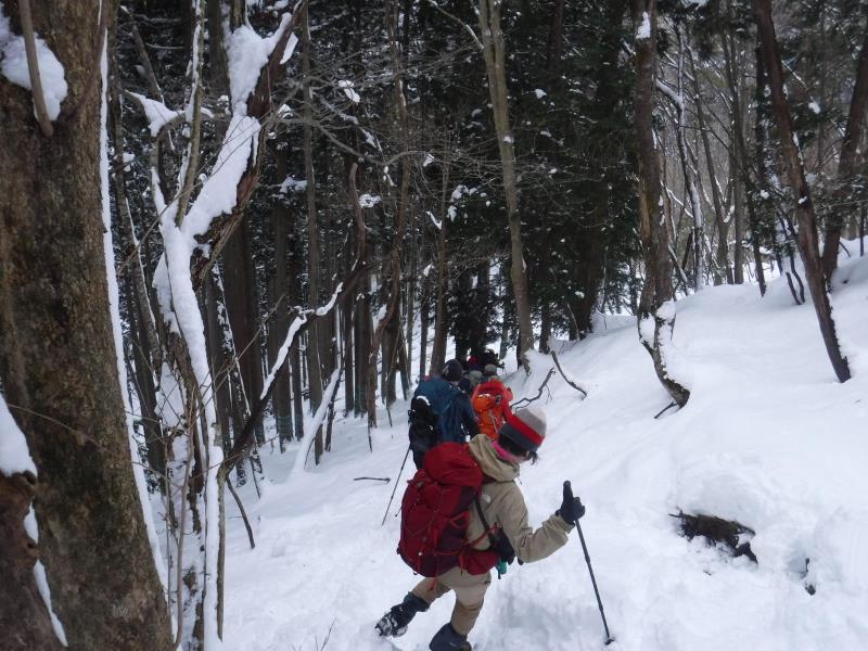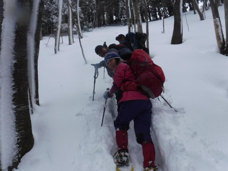アラキ峠の手前のトラバ-スをせずに、尾根に直登し、急登深雪を各自ラッセル体験してもらいました。