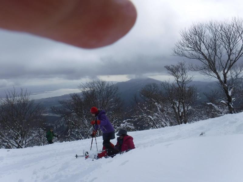 権現山で昼食をとりザックをデポしホッケ山手前のコルまであえてトレ-スをはずして各自自由に歩き回るとスノ-シュ-のメンバ-でさえ腰まで踏み抜き足を取られ転倒。