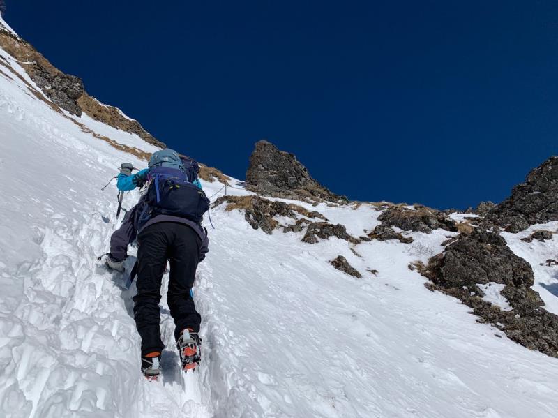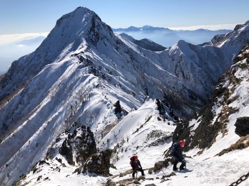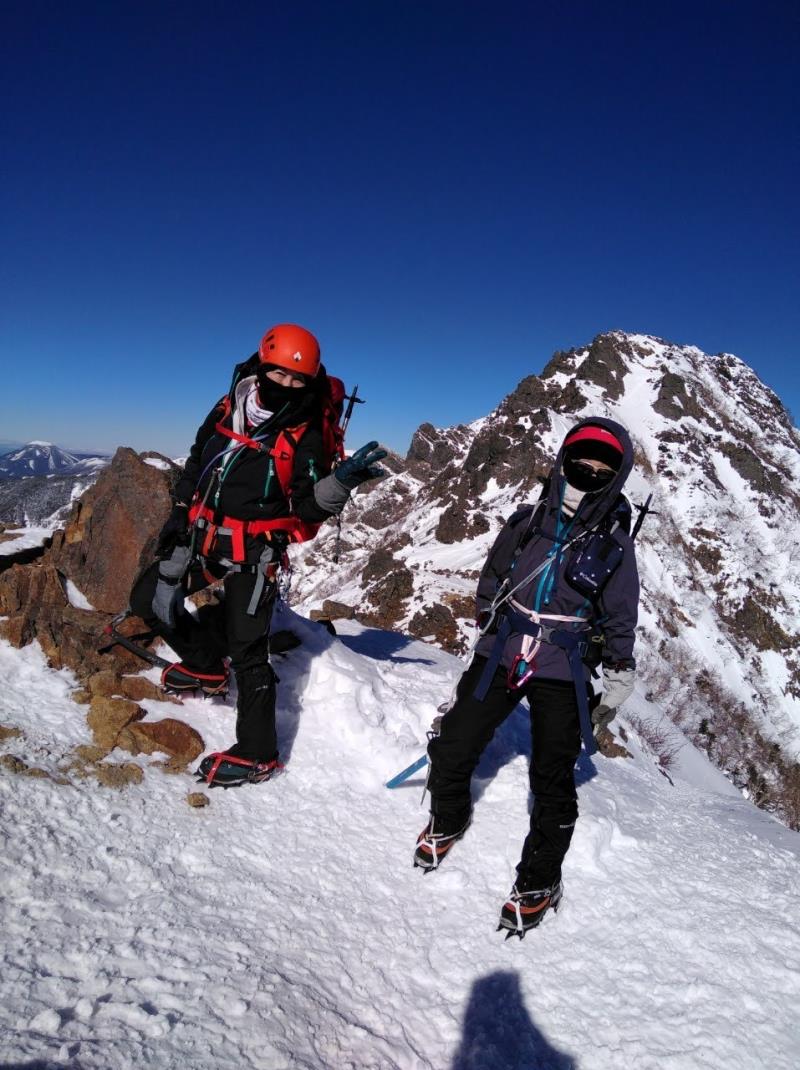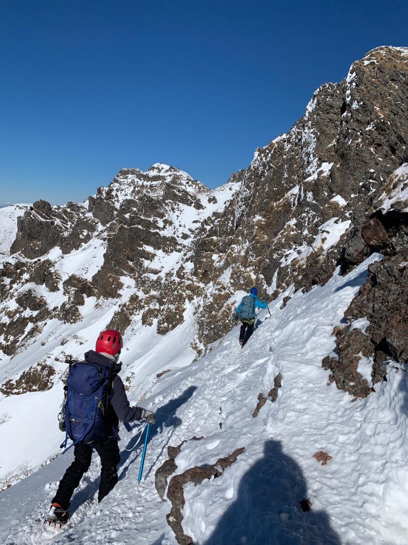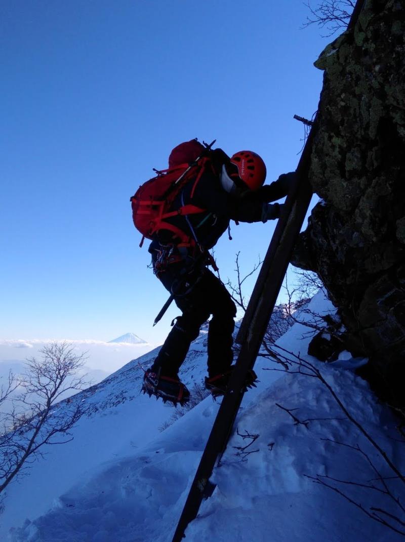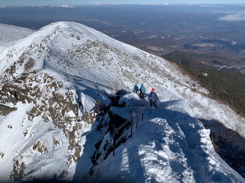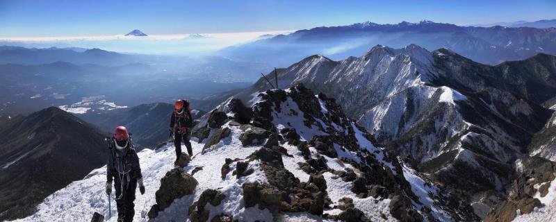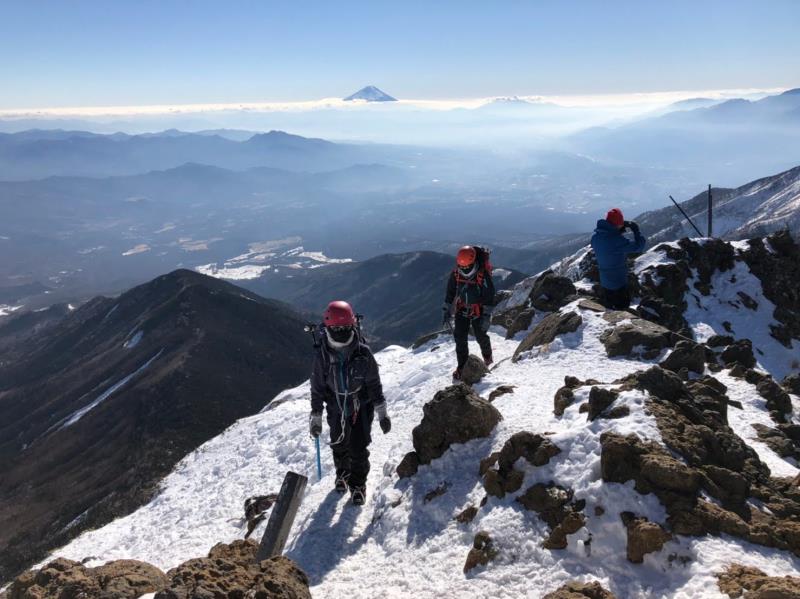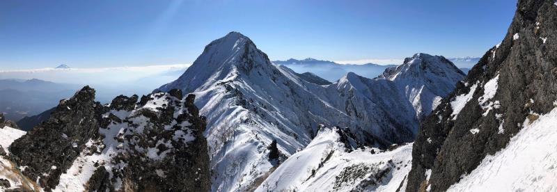 昨年3月に吹雪で撤退のリベンジ山行。まさにリベンジに相応しい天候でその日を迎えた。スタートから赤岳鉱泉までの道は圧雪され歩きやすい。チェーンアイゼンの心地良さが、長い道のりの成功を予感させる。赤岳鉱泉でアイゼン他装着、身も心も整え、いざ出発。群青色の八ヶ岳ブルーが歩みを支えてくれ、空に浮かぶ富士山や北アルプス、南アルプス、北八ヶ岳、全ての山々がリベンジを祝福してくれている様だ。赤岳展望荘でほっこりタイムを過ごした後は、縦走の核心部である横岳へ。大同心、小同心の岩壁を持つ横岳は厳冬期は難易度が高いが、岩場も雪渓のトラバースもアイゼンでの梯子も、4人で息を合わせ難なく歩を進めた。赤岳展望荘を過ぎてからは、ほぼ4人の貸し切りで大絶景を心に刻む事が出来た。(Y.F)