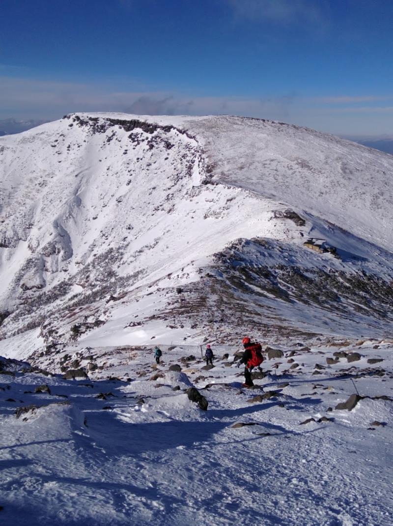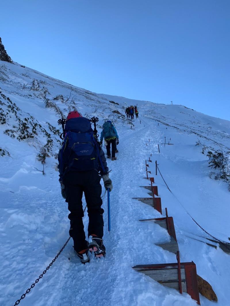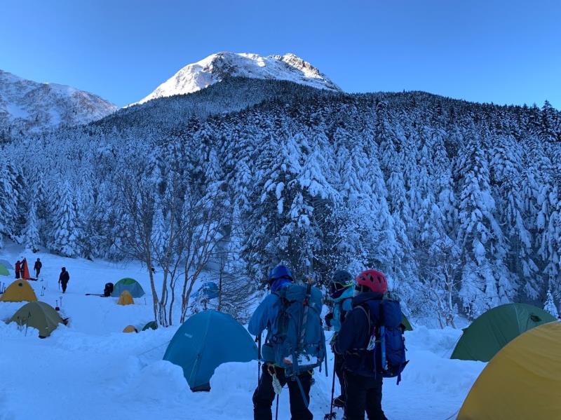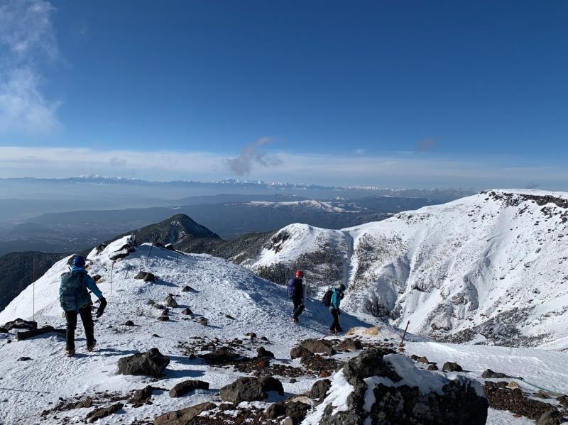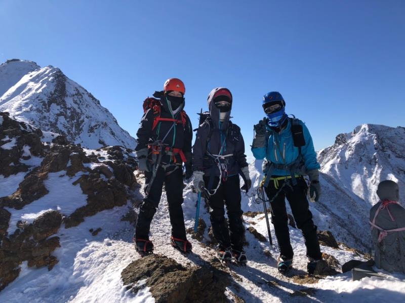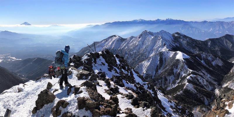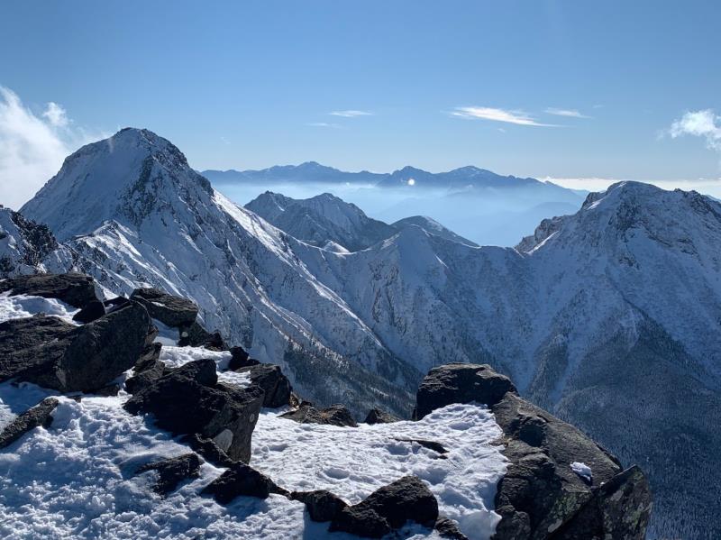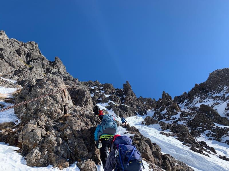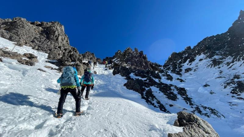 昨年3月に吹雪で撤退のリベンジ山行。まさにリベンジに相応しい天候でその日を迎えた。スタートから赤岳鉱泉までの道は圧雪され歩きやすい。チェーンアイゼンの心地良さが、長い道のりの成功を予感させる。赤岳鉱泉でアイゼン他装着、身も心も整え、いざ出発。群青色の八ヶ岳ブルーが歩みを支えてくれ、空に浮かぶ富士山や北アルプス、南アルプス、北八ヶ岳、全ての山々がリベンジを祝福してくれている様だ。赤岳展望荘でほっこりタイムを過ごした後は、縦走の核心部である横岳へ。大同心、小同心の岩壁を持つ横岳は厳冬期は難易度が高いが、岩場も雪渓のトラバースもアイゼンでの梯子も、4人で息を合わせ難なく歩を進めた。赤岳展望荘を過ぎてからは、ほぼ4人の貸し切りで大絶景を心に刻む事が出来た。(Y.F)