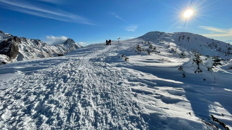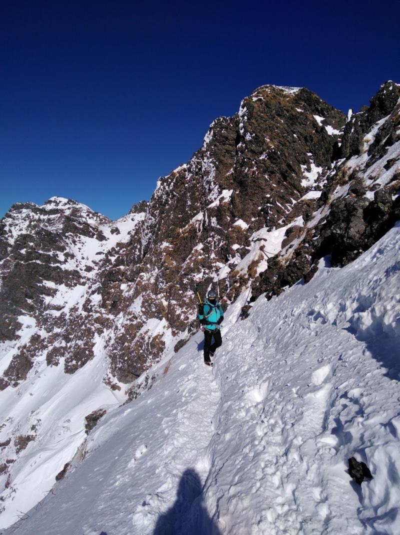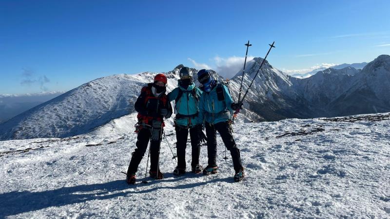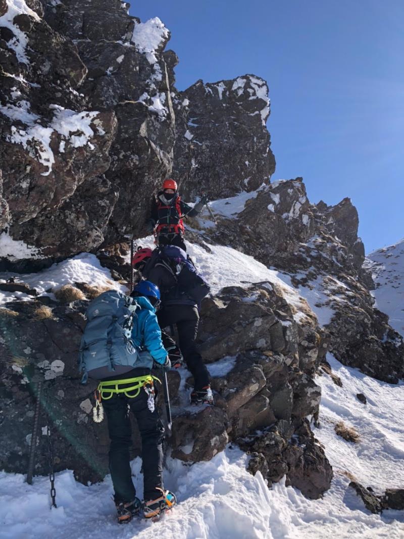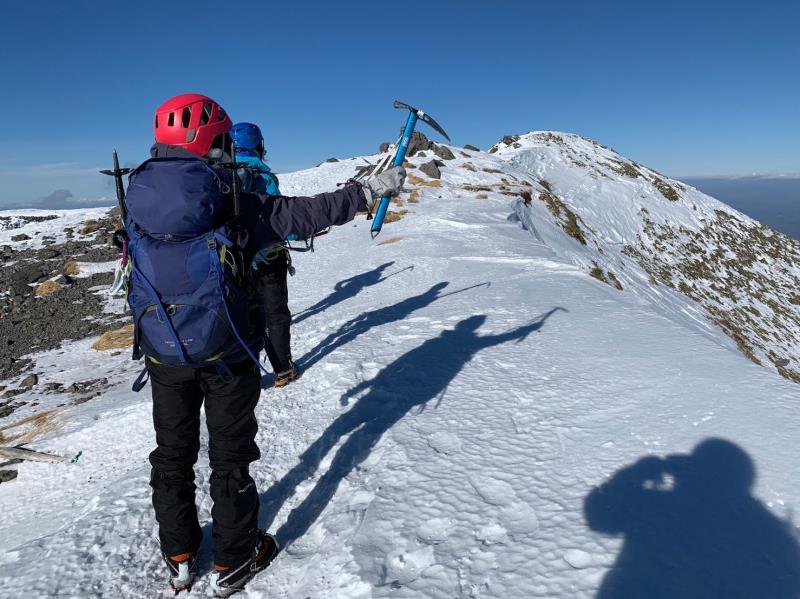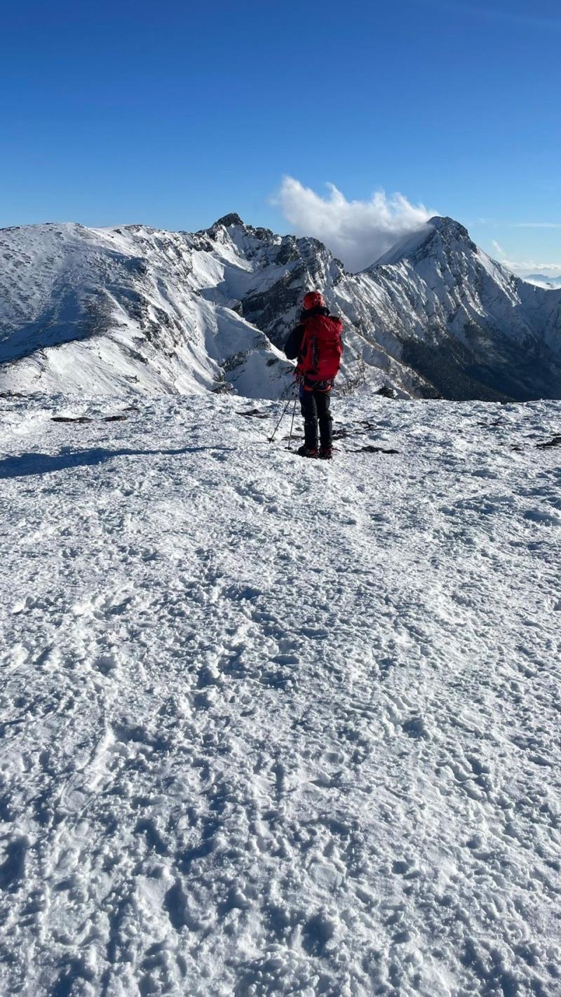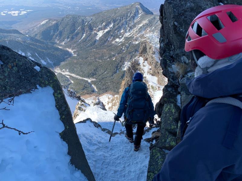 昨年3月に吹雪で撤退のリベンジ山行。まさにリベンジに相応しい天候でその日を迎えた。スタートから赤岳鉱泉までの道は圧雪され歩きやすい。チェーンアイゼンの心地良さが、長い道のりの成功を予感させる。赤岳鉱泉でアイゼン他装着、身も心も整え、いざ出発。群青色の八ヶ岳ブルーが歩みを支えてくれ、空に浮かぶ富士山や北アルプス、南アルプス、北八ヶ岳、全ての山々がリベンジを祝福してくれている様だ。赤岳展望荘でほっこりタイムを過ごした後は、縦走の核心部である横岳へ。大同心、小同心の岩壁を持つ横岳は厳冬期は難易度が高いが、岩場も雪渓のトラバースもアイゼンでの梯子も、4人で息を合わせ難なく歩を進めた。赤岳展望荘を過ぎてからは、ほぼ4人の貸し切りで大絶景を心に刻む事が出来た。(Y.F)