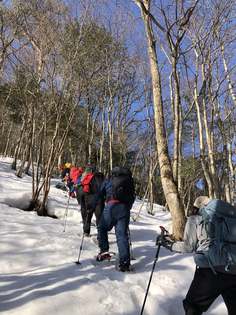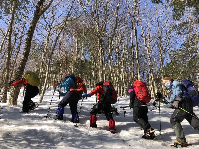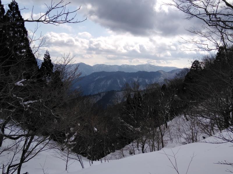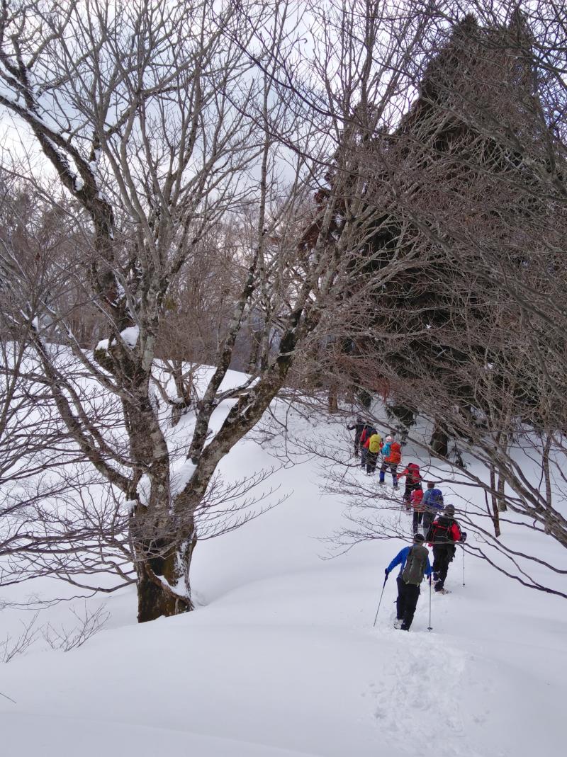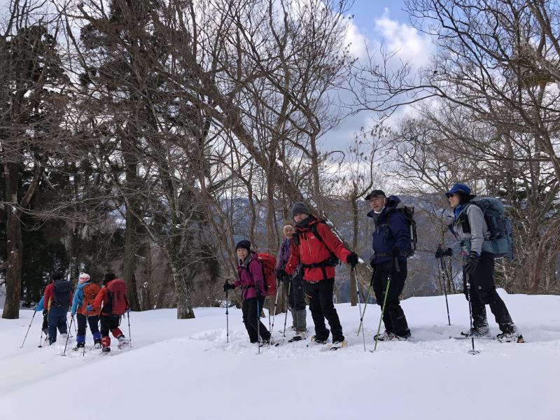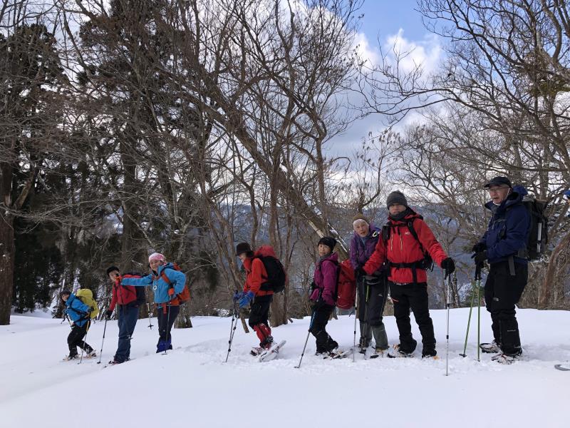 駐車地よりワカン装着しオキナ谷右岸尾根を登る。トレースの無い杉林の急登を交代しながら歩く。稜線に出ると秋の例会で紅葉を楽しんだ木々はすっかり落葉し雪景色の別世界になっていた。P909カラ滝山頂付近は真っ白な雪稜が続きそこからは比良山系武奈ヶ岳や峰床山等の峰々の眺めることができました。少し戻るようにしてイチゴ谷山へ向かい下山には北東尾根をルーフアイしながら進み、股下程の踏み抜き、激下りに悪戦苦闘しながら駐車地に近い所に何とか無事下山。雪の中をワカン歩きで充分楽しむことが出来ました。