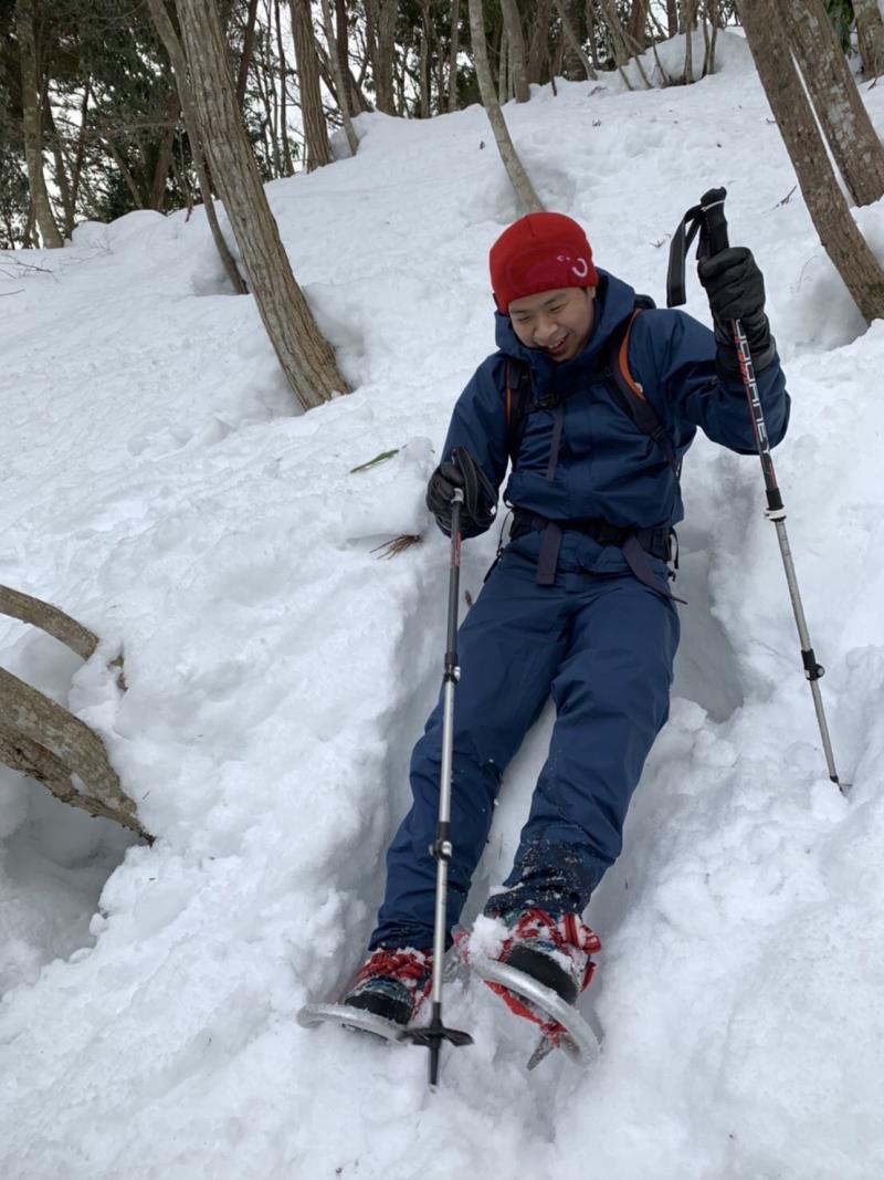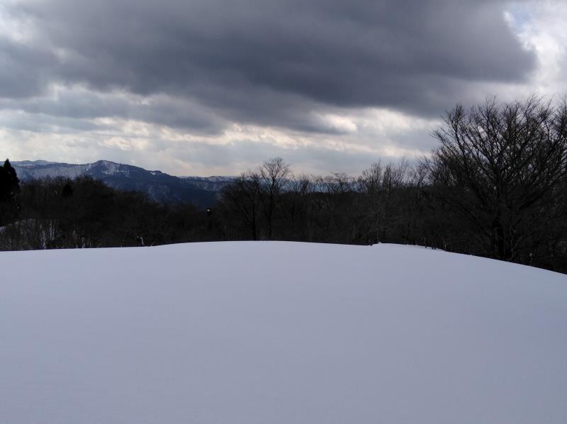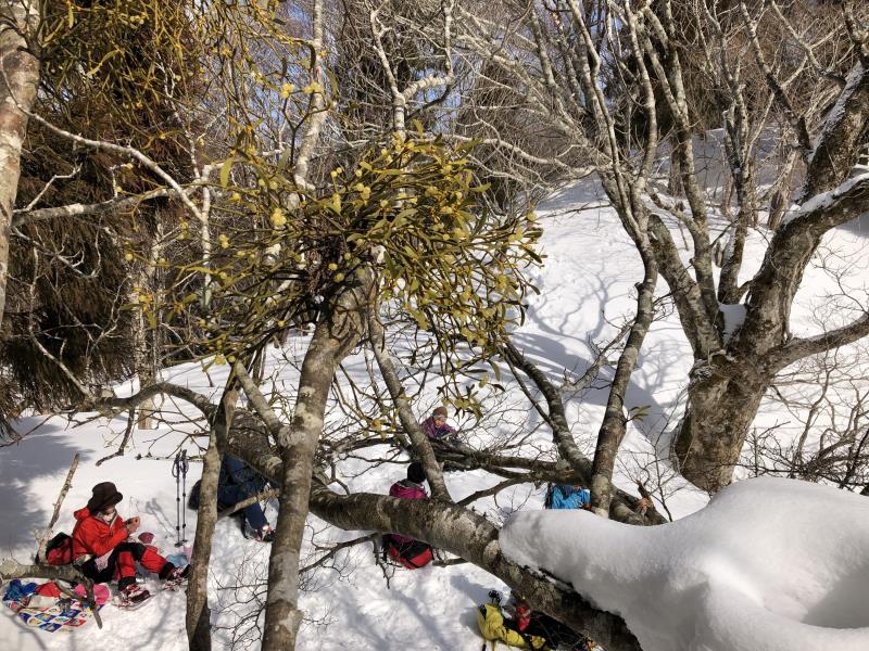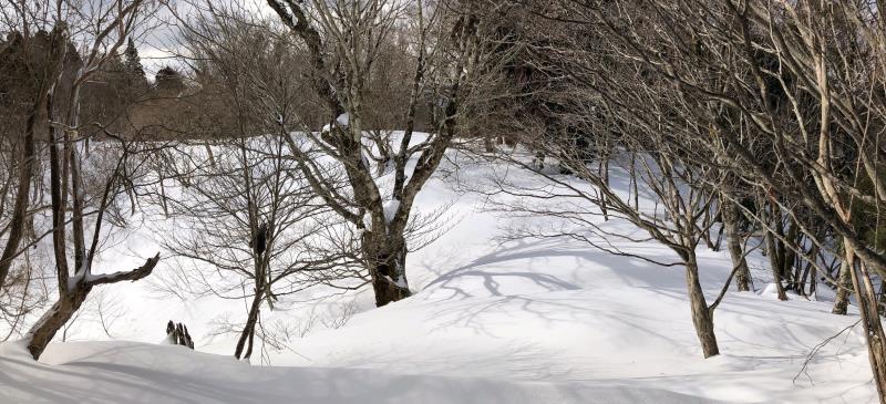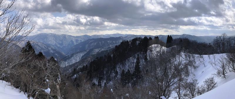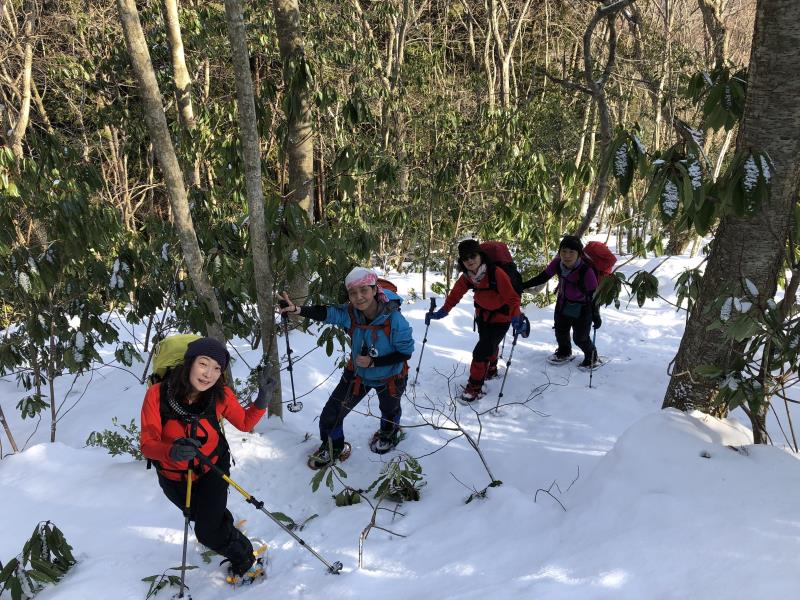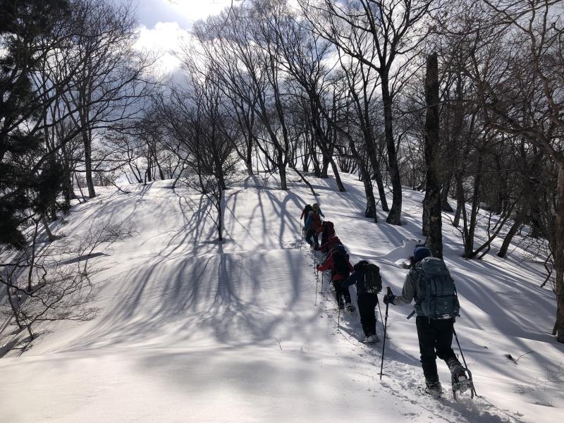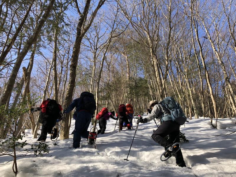 駐車地よりワカン装着しオキナ谷右岸尾根を登る。トレースの無い杉林の急登を交代しながら歩く。稜線に出ると秋の例会で紅葉を楽しんだ木々はすっかり落葉し雪景色の別世界になっていた。P909カラ滝山頂付近は真っ白な雪稜が続きそこからは比良山系武奈ヶ岳や峰床山等の峰々の眺めることができました。少し戻るようにしてイチゴ谷山へ向かい下山には北東尾根をルーフアイしながら進み、股下程の踏み抜き、激下りに悪戦苦闘しながら駐車地に近い所に何とか無事下山。雪の中をワカン歩きで充分楽しむことが出来ました。