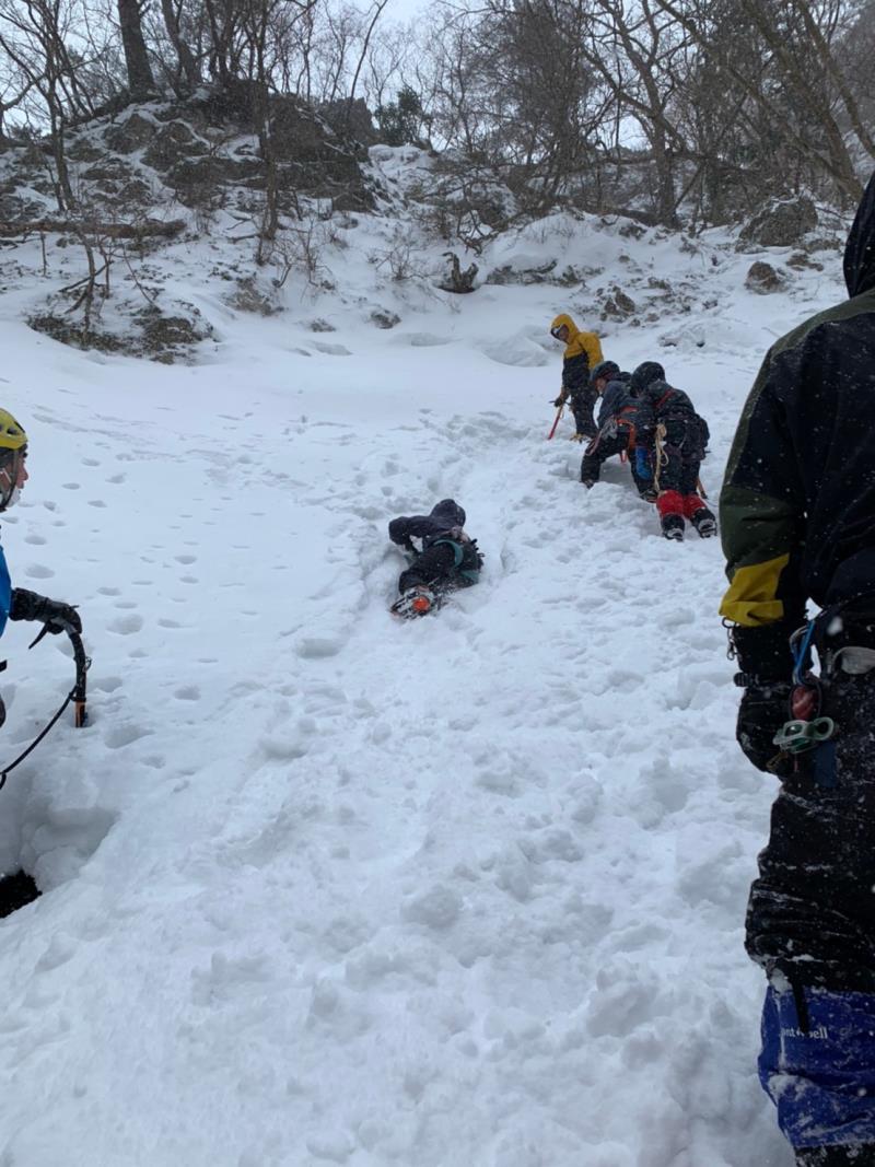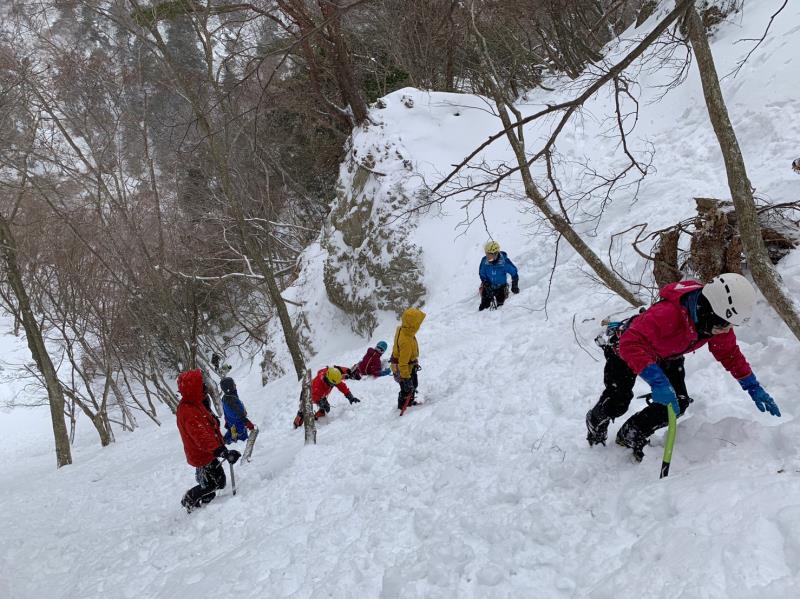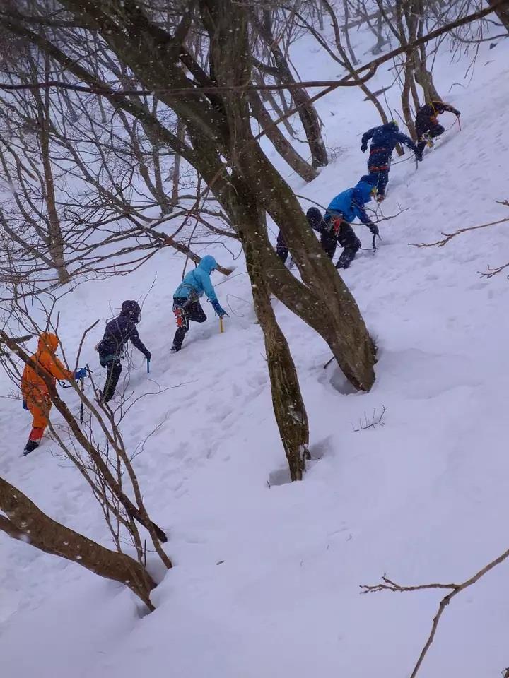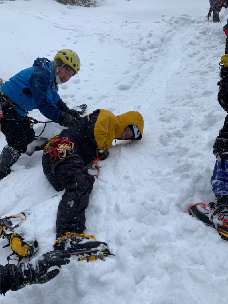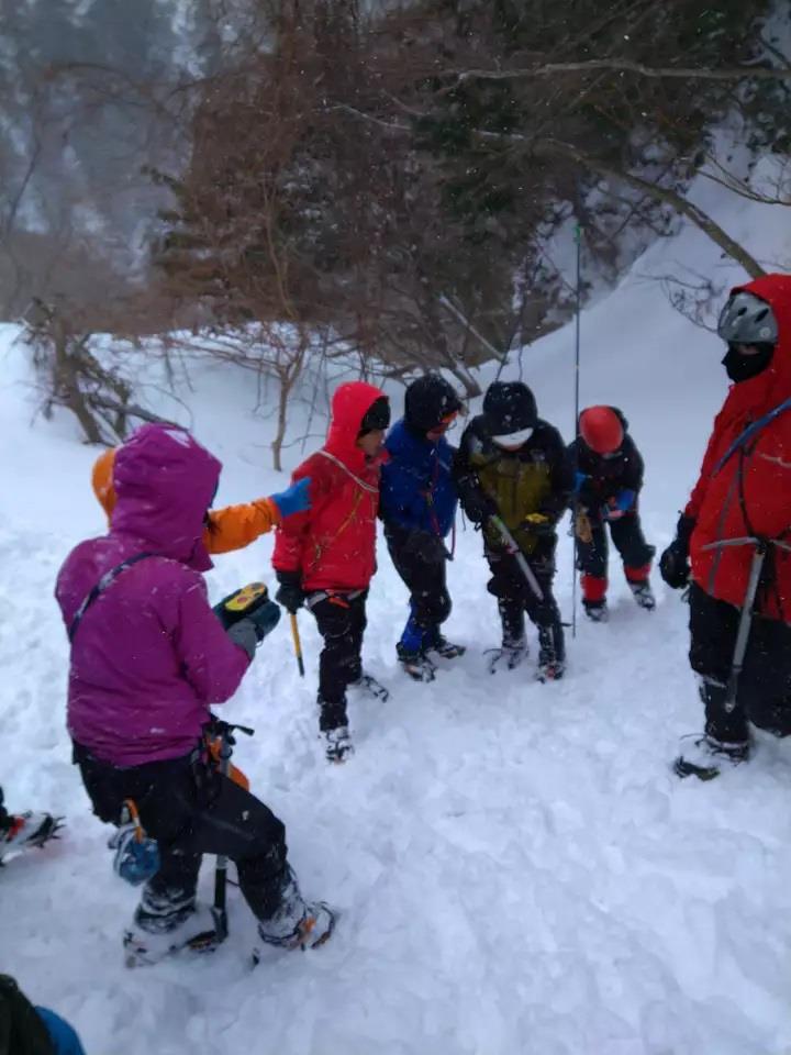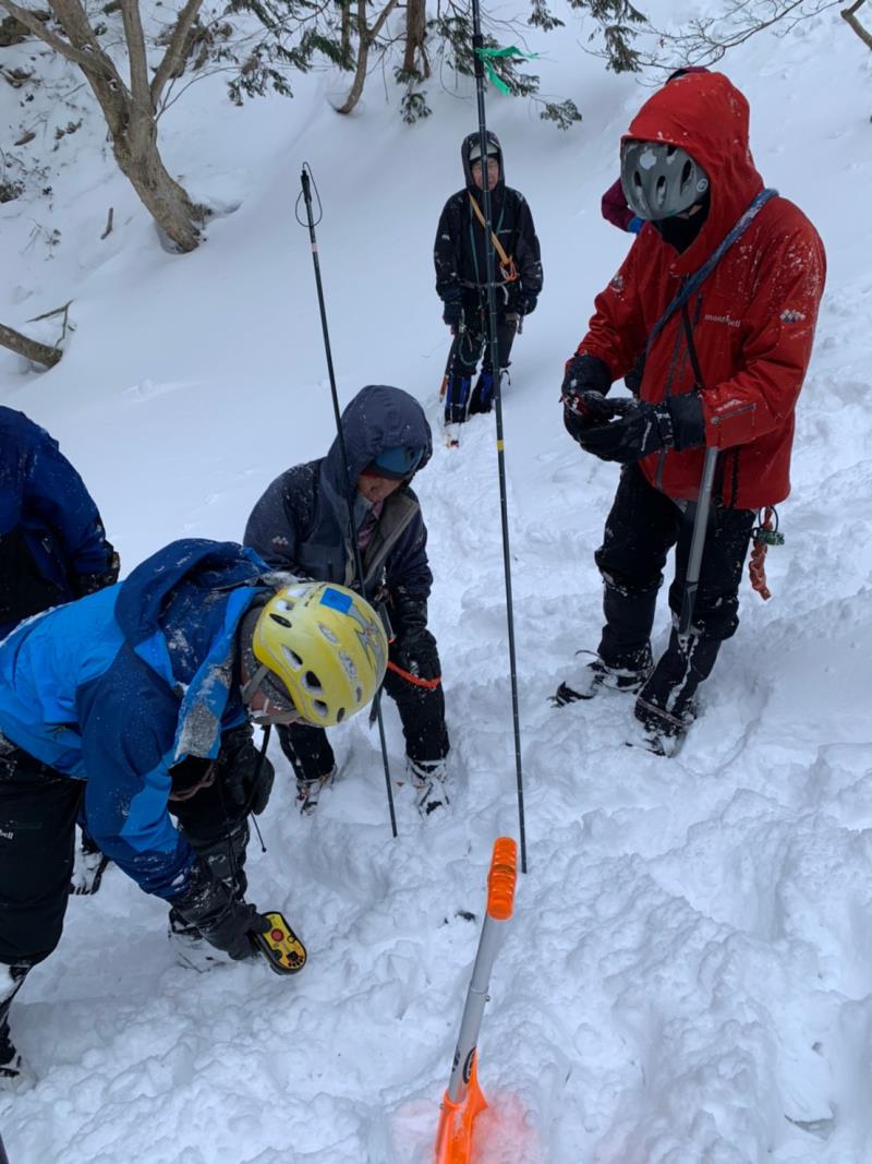 初日は3班に分かれてアイゼン無し・アイゼン有りでの直登下降・傾斜登下降・トラバースの練習。急斜面での登下降、滑落停止、雪上での支点構築法を学んだのち、全員で雪崩時のビーコン・プローブによる捜索の練習を行いました。