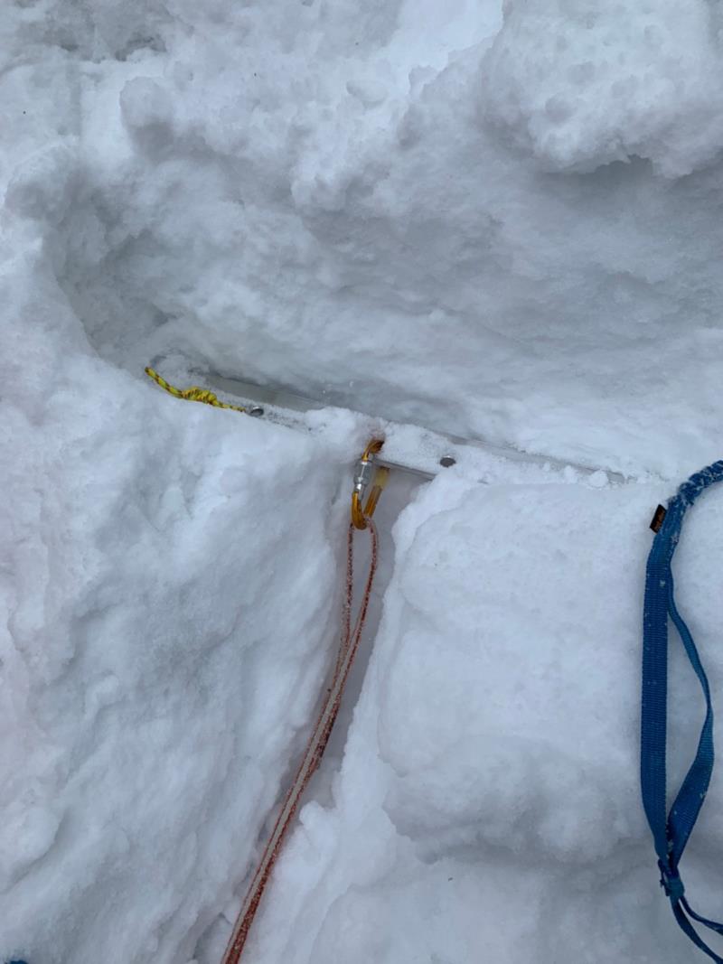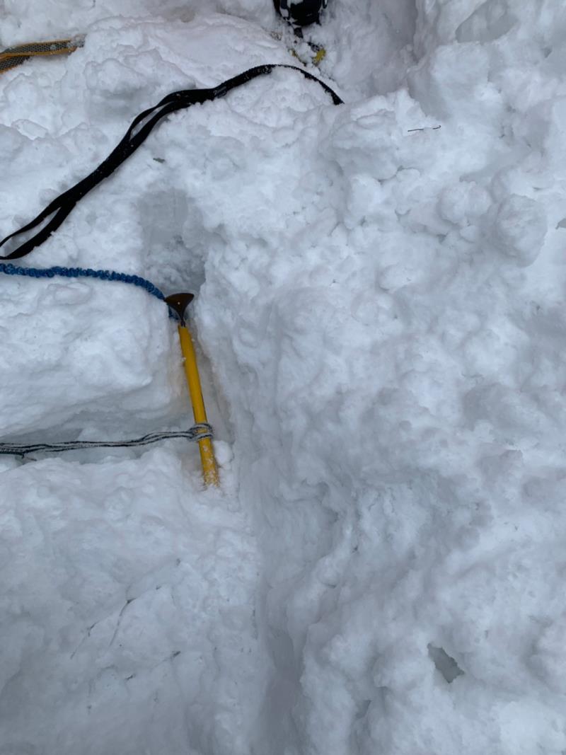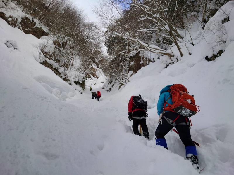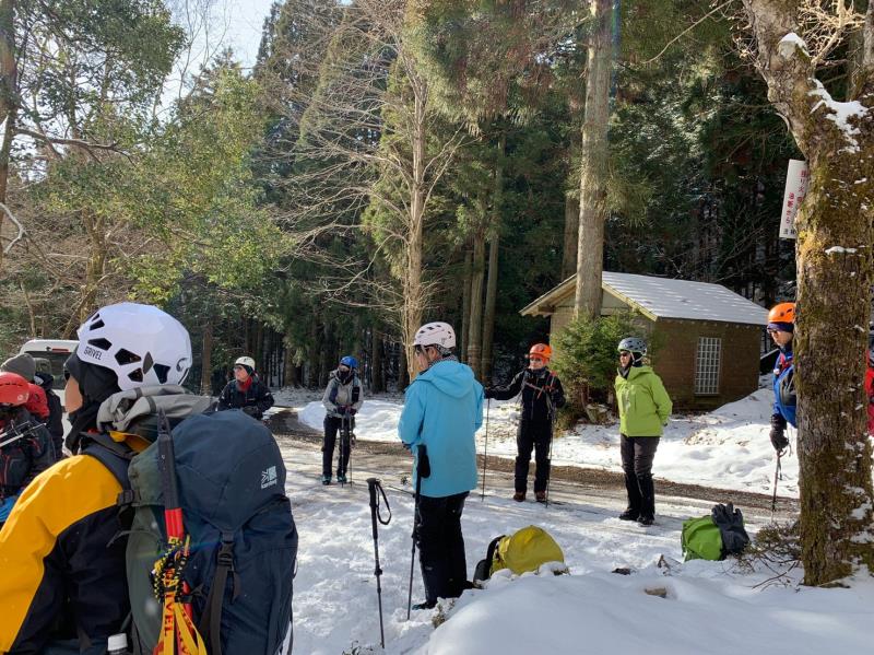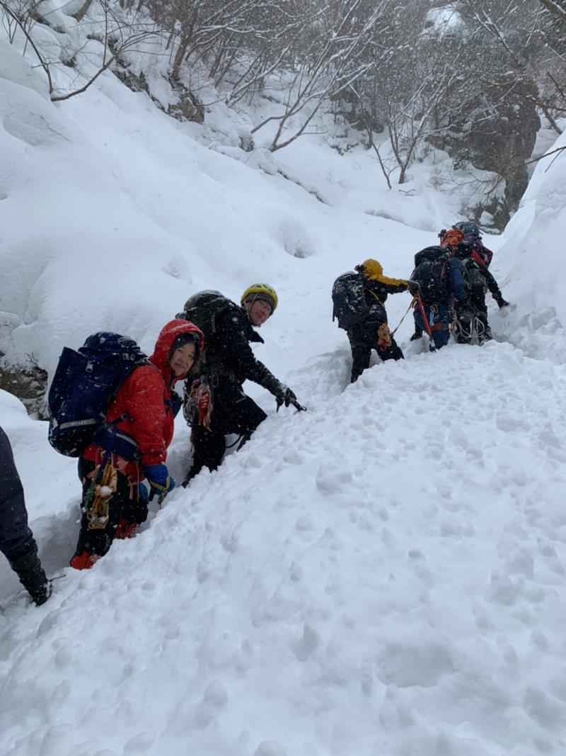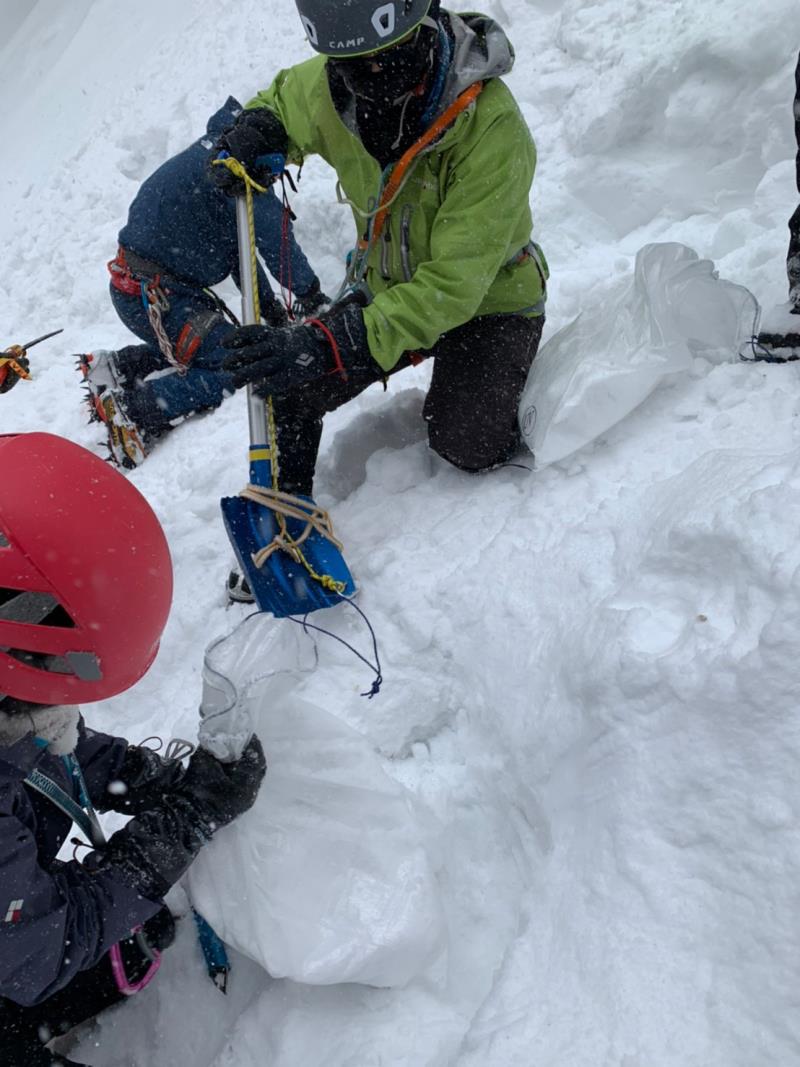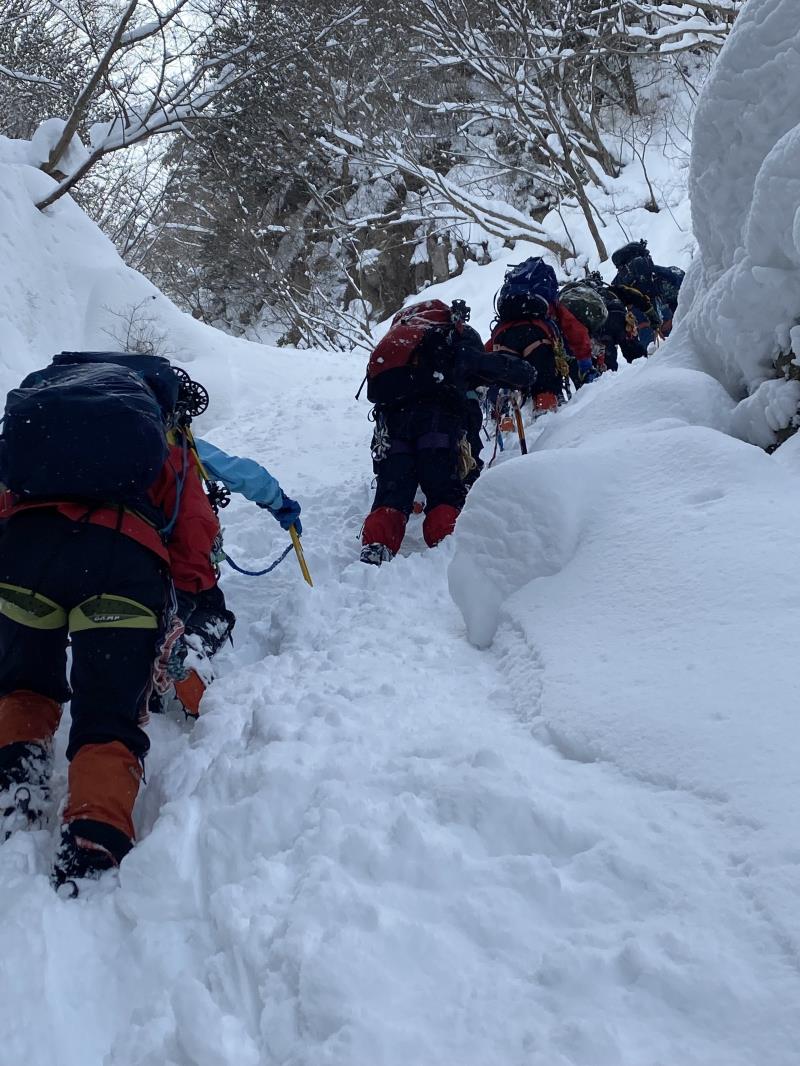 初日は3班に分かれてアイゼン無し・アイゼン有りでの直登下降・傾斜登下降・トラバースの練習。急斜面での登下降、滑落停止、雪上での支点構築法を学んだのち、全員で雪崩時のビーコン・プローブによる捜索の練習を行いました。