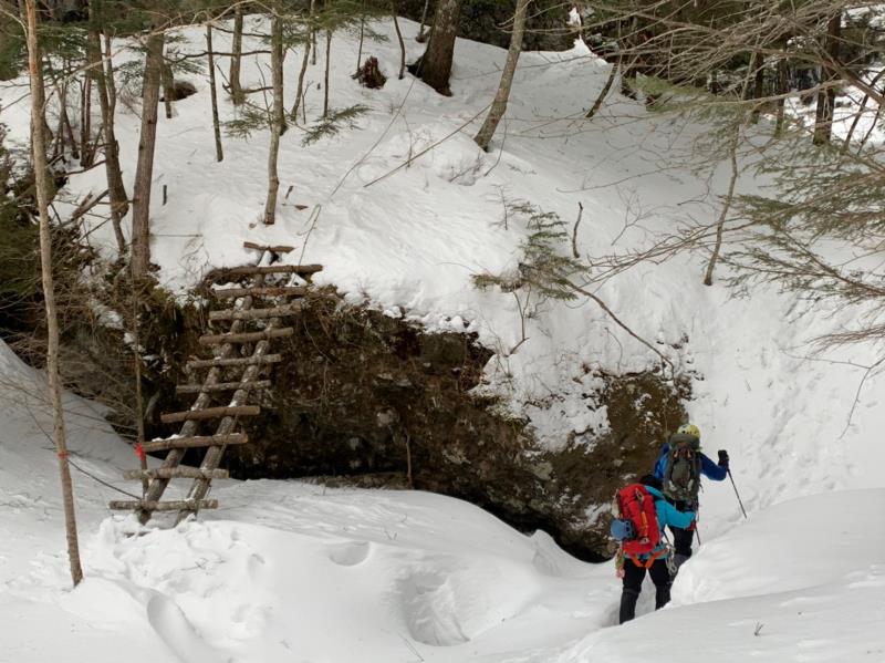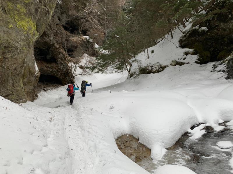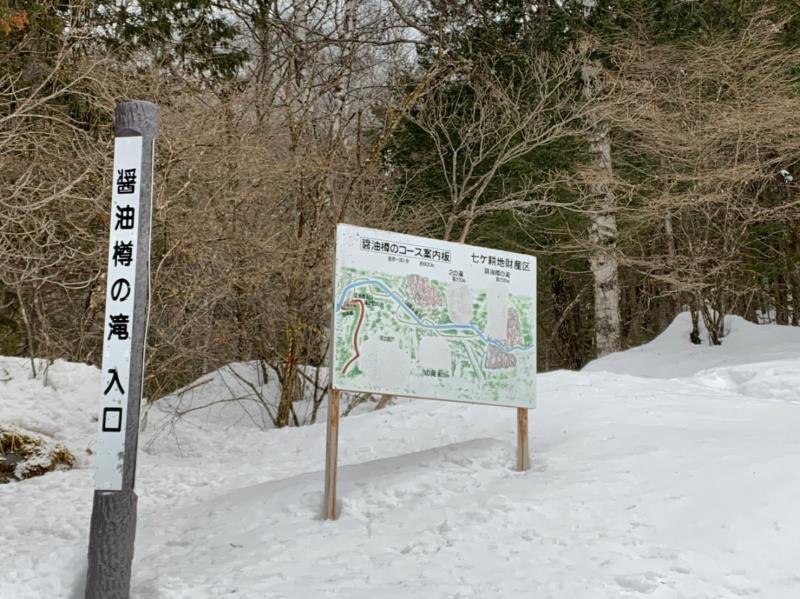 翌日6日早朝より唐沢鉱泉の分岐迄移動したが、雪が多くここに車を置き林道をテクテク2時間程度歩きやっと醤油樽の滝に到着。先行のパーティーがいて少し待って左側の比較的易しいコースを譲って頂く。