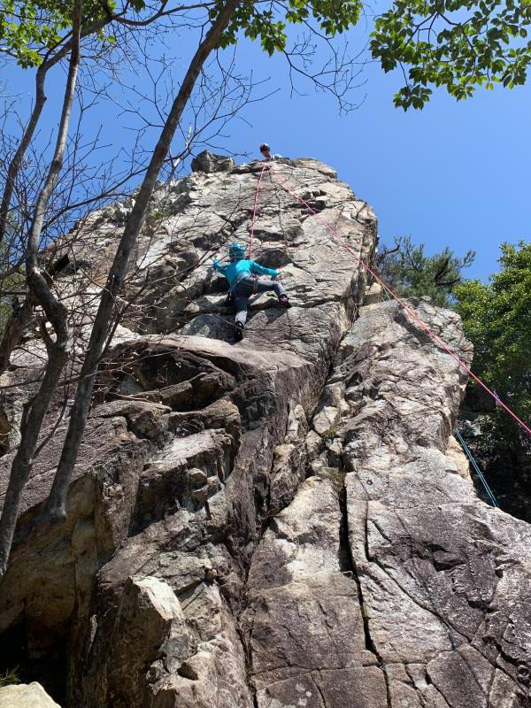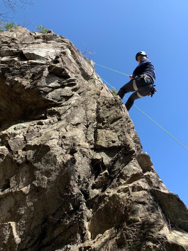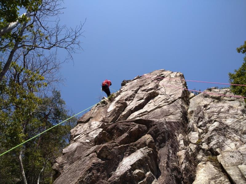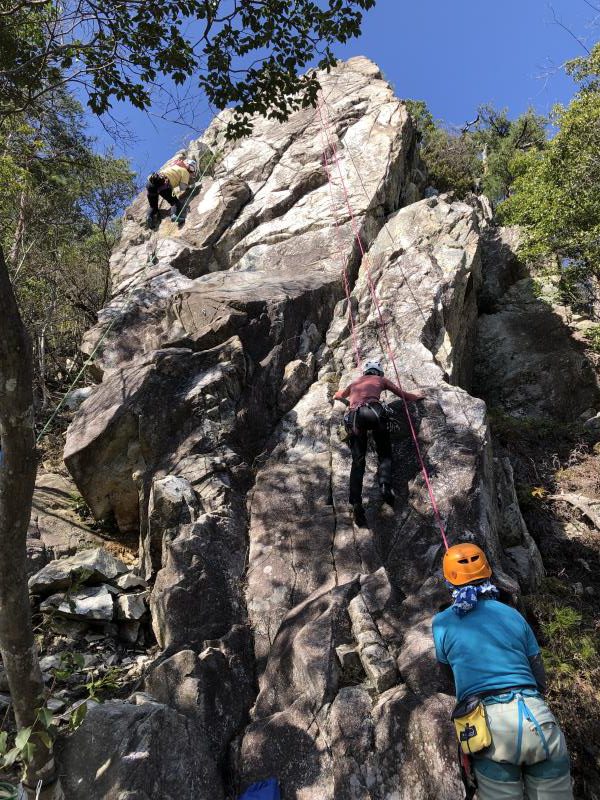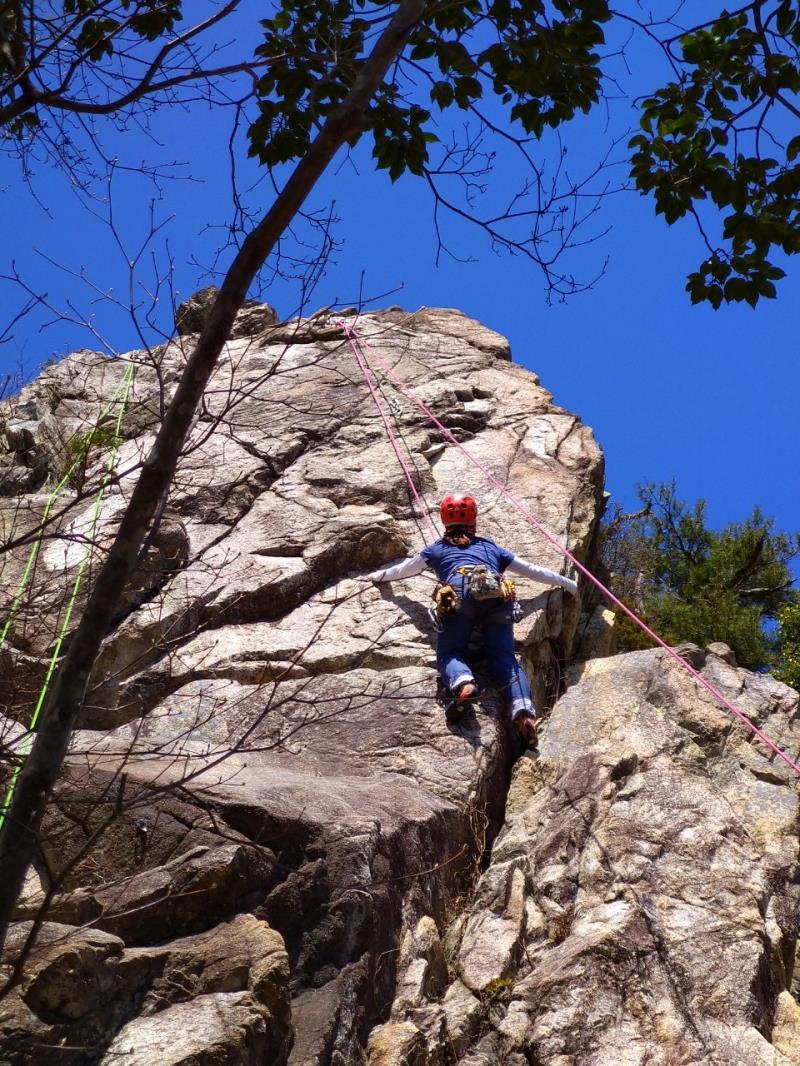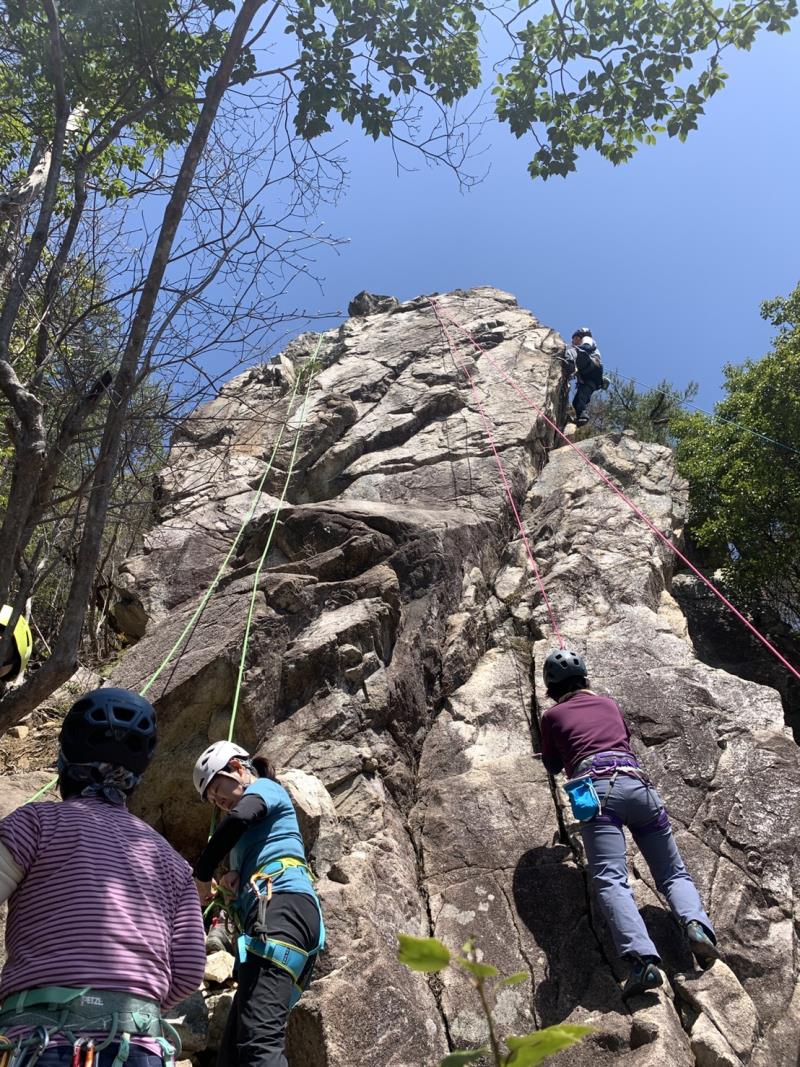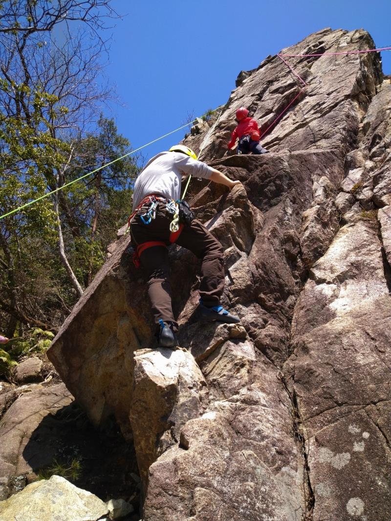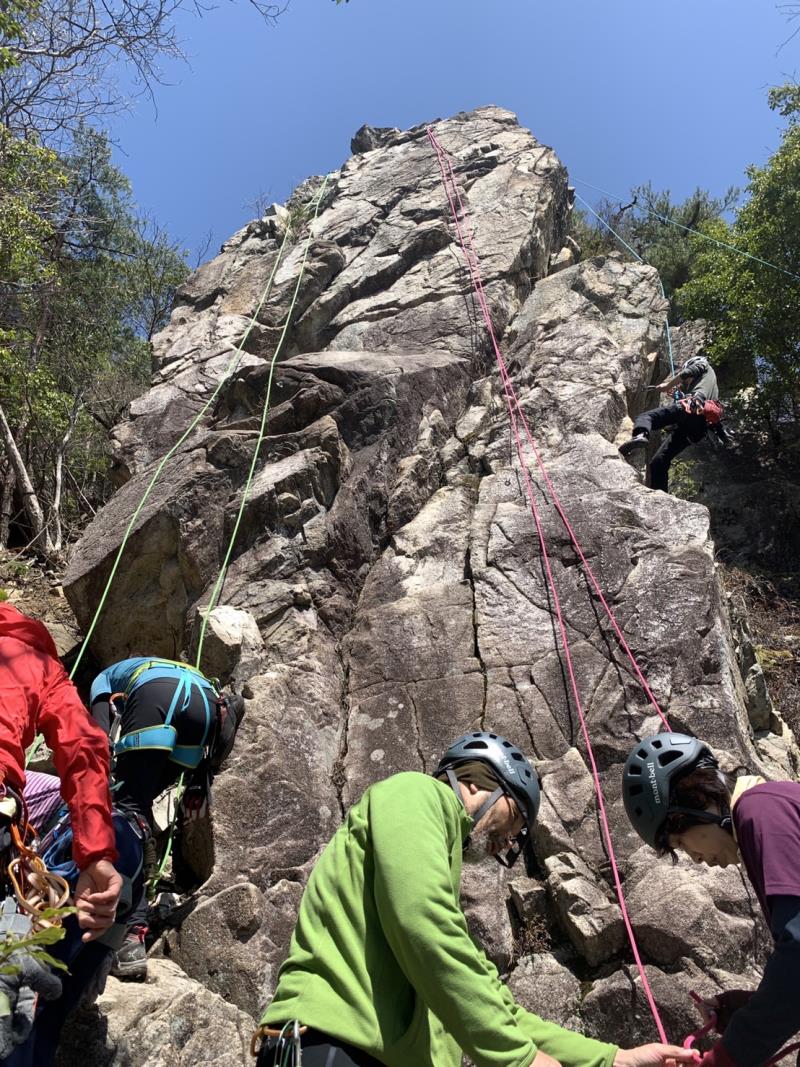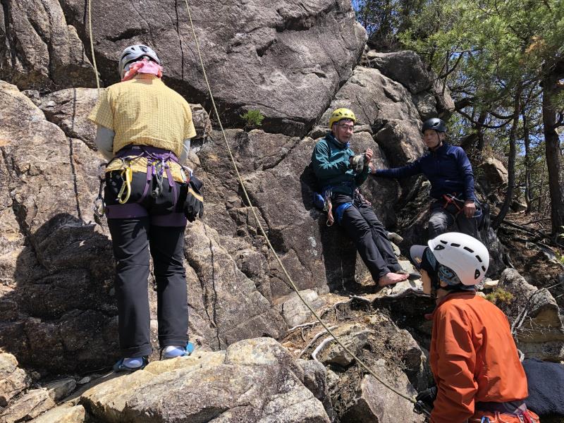 JRの事故による乱れにより1名欠席、14人の参加者。雨が少し残り不安なスタートでしたが東南を向いた岩場はしっかりと乾いており、楊梅の滝の駐車場から20分ほどの激登りで、すでに皆さんたっぷりの汗で岩場に到着します。予想以上に他のパーティも多い中、下部の岩場に2本、上部に1本のトップロープを張ることができ、2グループに分かれ基本の練習からそれぞれの課題などクライミングの練習を繰り返しました。今回初岩場クライミングのKさんにベテランの大先輩が丁寧な指導をされましたが感想はいかがだったでしょうか。                                   長い雪の季節から久々の岩場クライミングの方も多く、一人ひとりロープの感覚を確かめるように春のクライミングを楽しんだ北小松の岩場でした。お疲れ様でした。