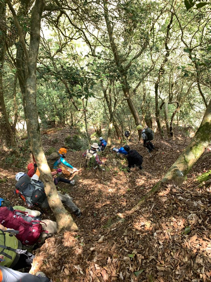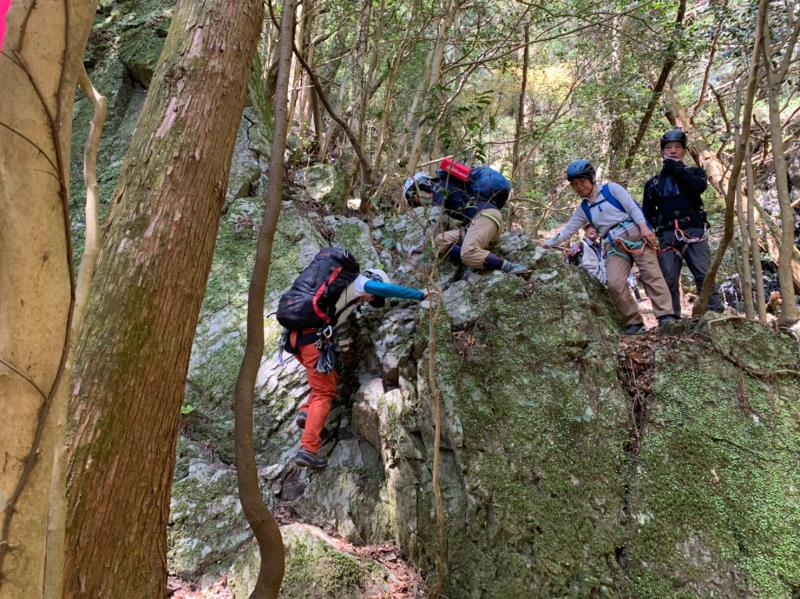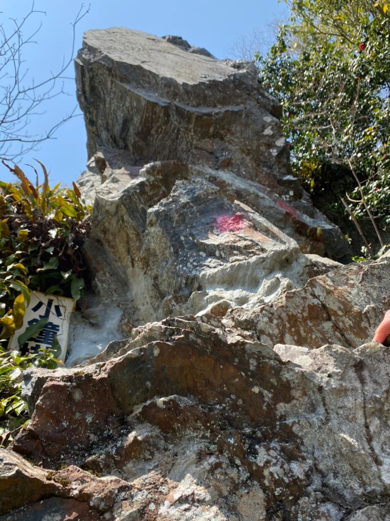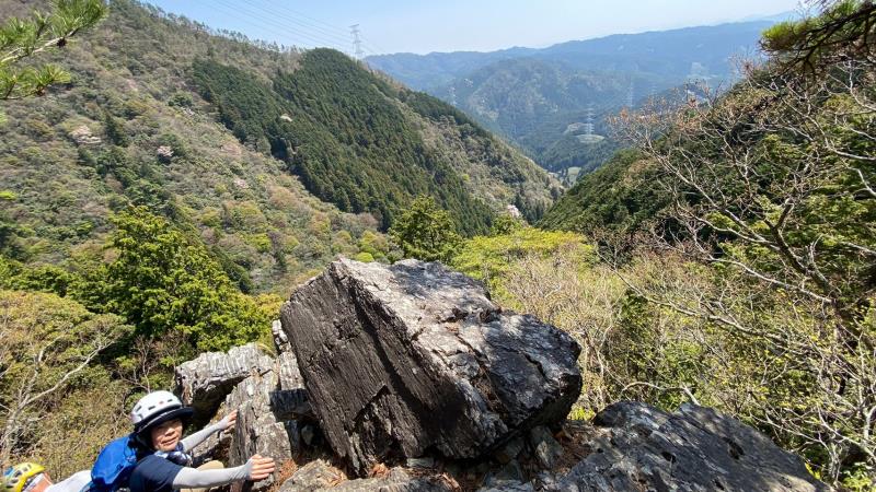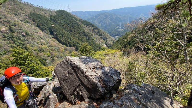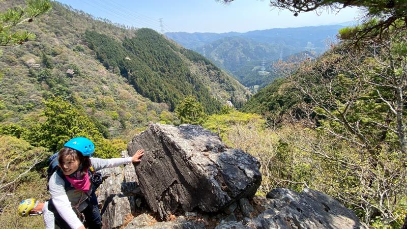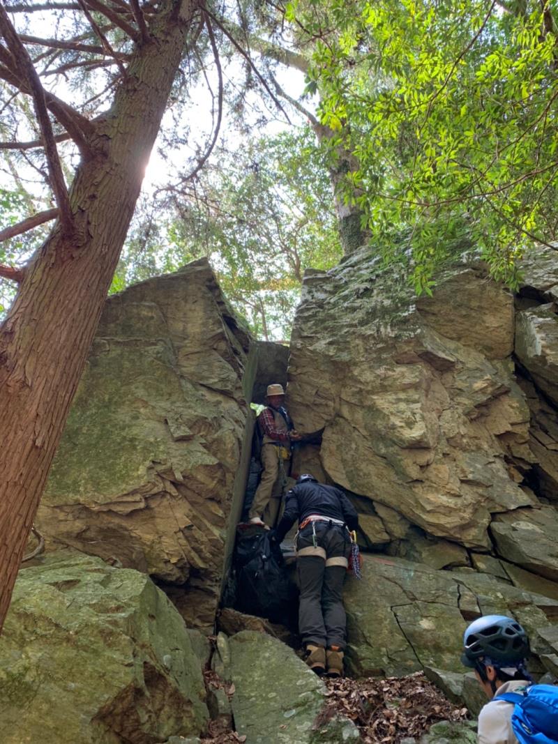初夏を思わせるようなスカッと晴れた中、宇治田原の山奥、鷲峰山金胎寺の行場を巡りました。クライミング経験のある人には楽しいアスレチック感覚で、少し不慣れな人も前方後方からアドバイスされながら、短いながらスリルいっぱいの行場を楽しみ、平等岩から先は2グループに分かれ、クライミング組は平等岩をチャレンジ、ハイキング組は金胎寺本堂裏にある鷲峰山山頂と地図上は釈迦岳山頂にある鷲峰山の一等三角点をタッチしに行きました。(Y・K)