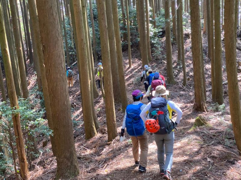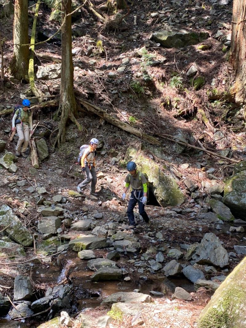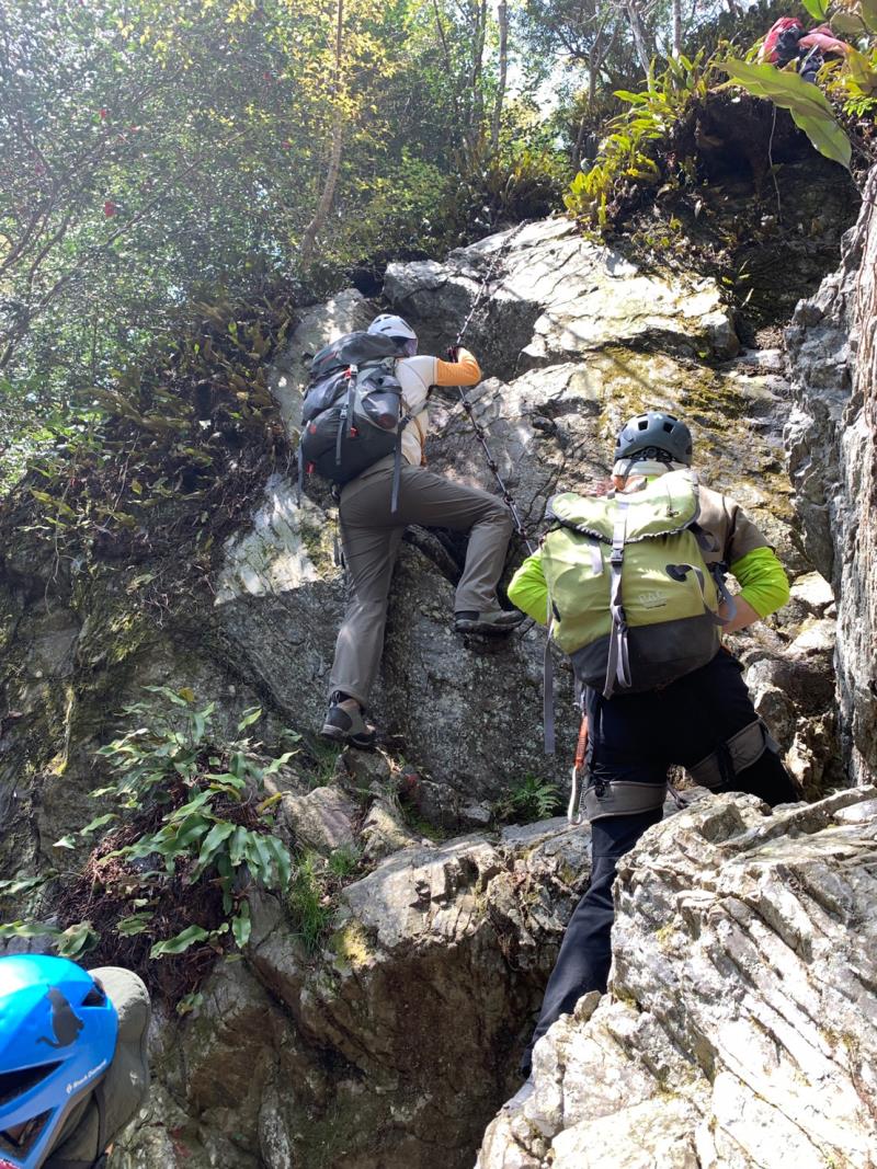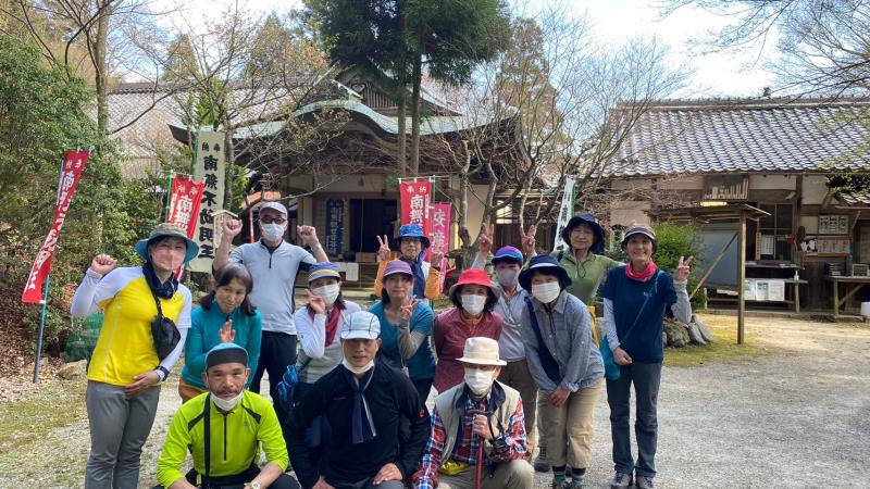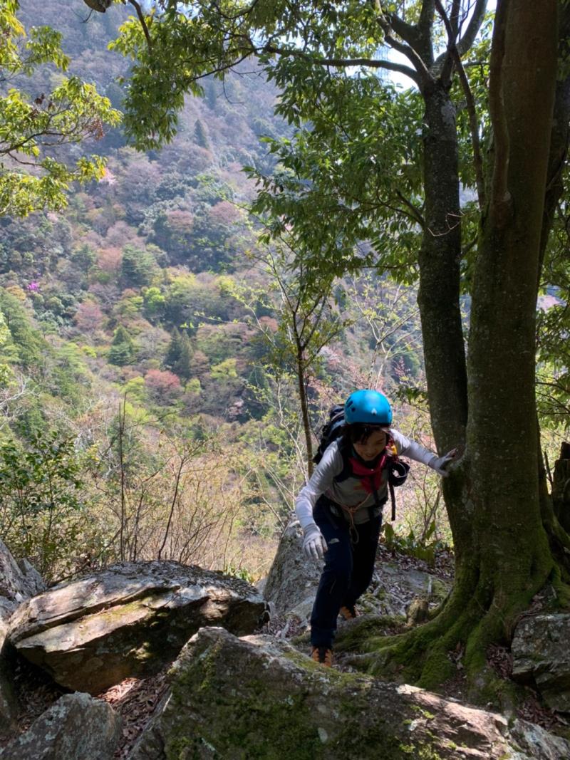 初夏を思わせるようなスカッと晴れた中、宇治田原の山奥、鷲峰山金胎寺の行場を巡りました。クライミング経験のある人には楽しいアスレチック感覚で、少し不慣れな人も前方後方からアドバイスされながら、短いながらスリルいっぱいの行場を楽しみ、平等岩から先は2グループに分かれ、クライミング組は平等岩をチャレンジ、ハイキング組は金胎寺本堂裏にある鷲峰山山頂と地図上は釈迦岳山頂にある鷲峰山の一等三角点をタッチしに行きました。(Y・K)