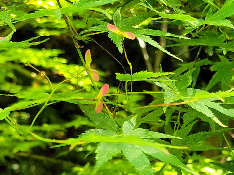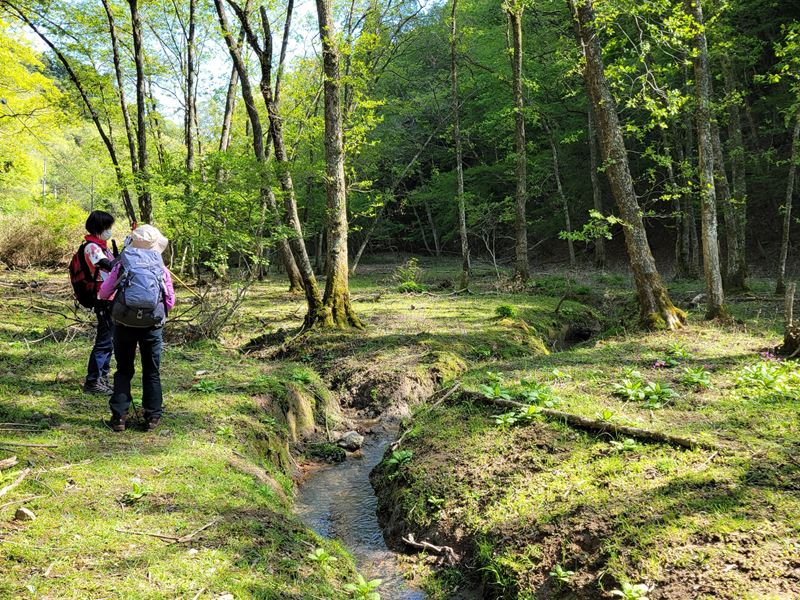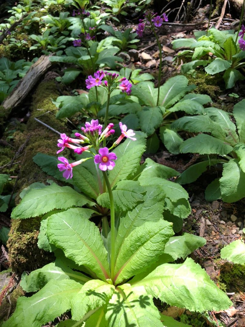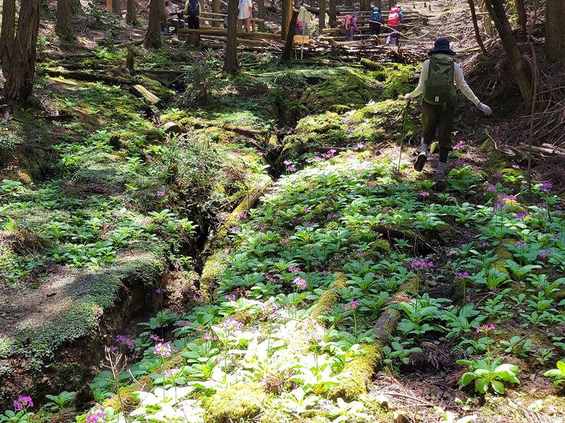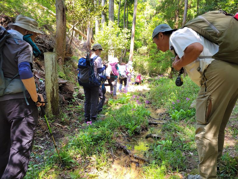 朝9時、光明寺山門前集合。眩いばかりの青モミジの境内から竹藪を抜けて、西山古道をちょっとそれた沢沿いをたどっていくと… あっ、見えました!初クリンソウ!!柔らかな緑に映えるピンクの花が、谷間に注ぐ陽ざしの中でくっきりと咲き揃っていました。次のスポットは大沢峠。高原に咲くお花畑のようなクリンソウに「ここは軽井沢~?!」というメンバーの歓声があがります。3つ目は、ポンポン山東尾根から東海自然歩道に降りたあたりでした。お花の時期は毎年むつかしいと聞くだけに、今回はとっても幸運な出会いでした。