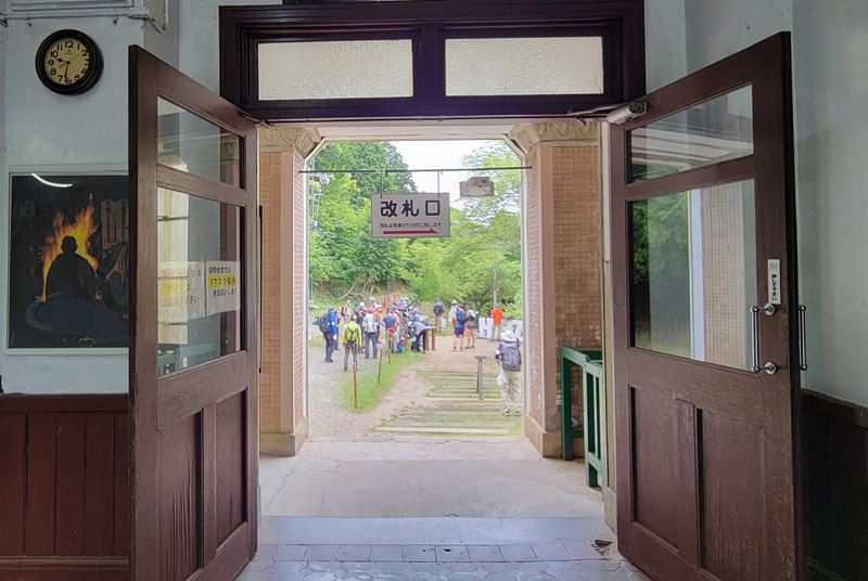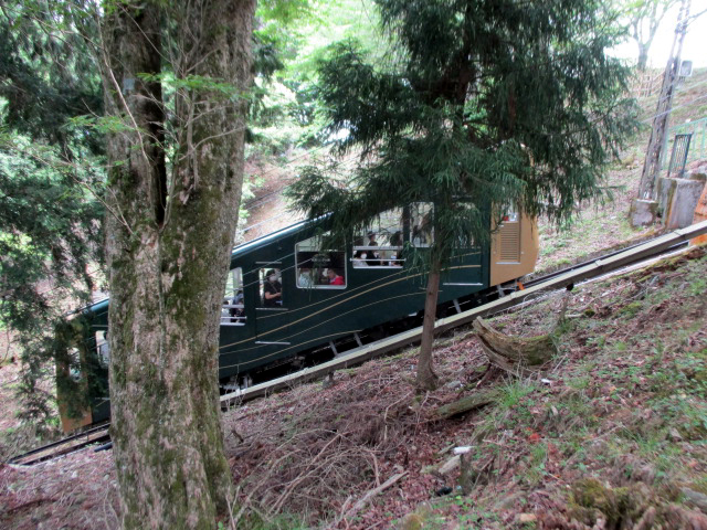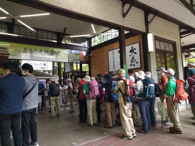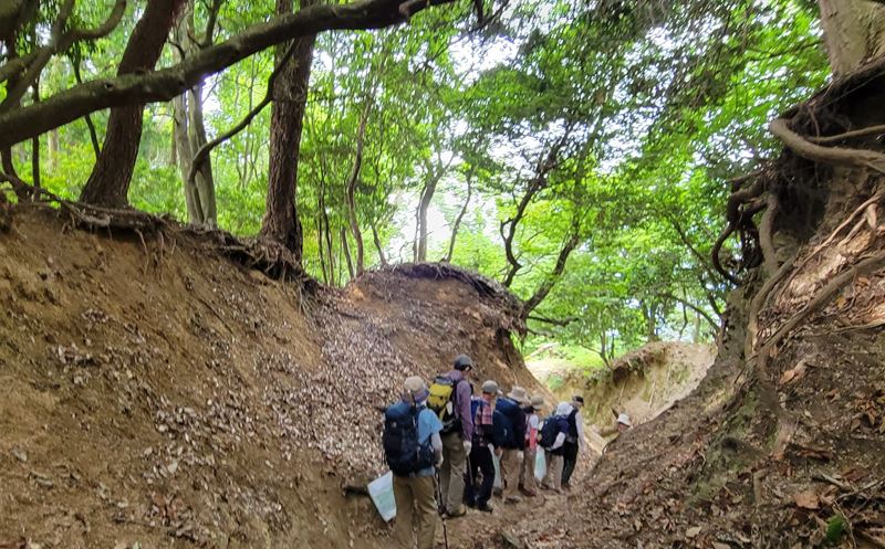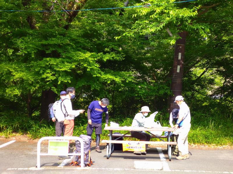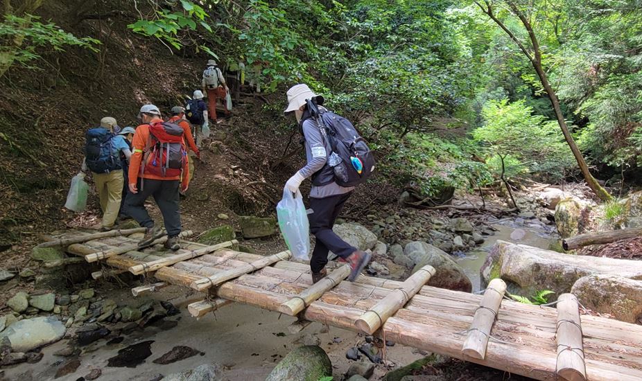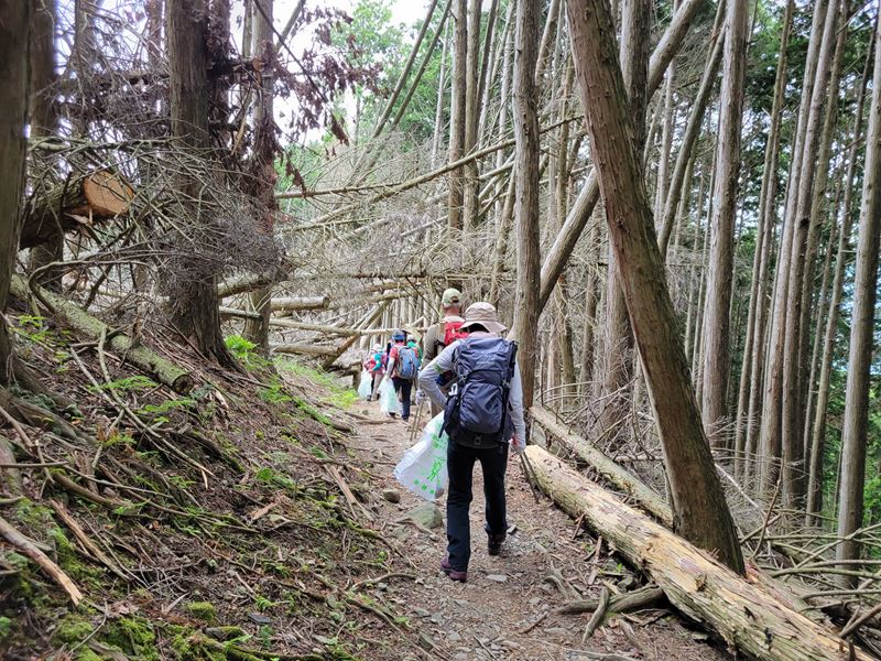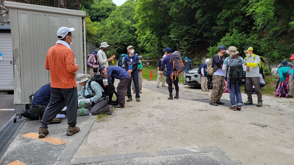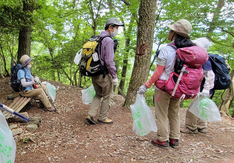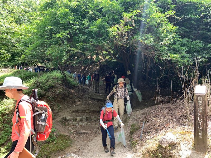 9:25 総勢46人がケーブル山頂駅に降り立った。集合写真を撮り終えると、軍手をはめた手に火ばさみとゴミ袋を持ち、駅舎横の脇道から下っていく。細い根っこ道を10分ほど歩くとトレイルコースに合流する。ここからバプテスト病院まで、ゴミを拾いながらゆっくり下っていく。トレイルコースはよく整備されており、緑陰の稜線は歩きやすい。長い長い人の列となったが、日頃 顔を合わせる機会が少ない会員同士のおしゃべりが列のあちこちで弾んでいる。時たまマスクが落ちていたりするが、ゴミはほとんどない。