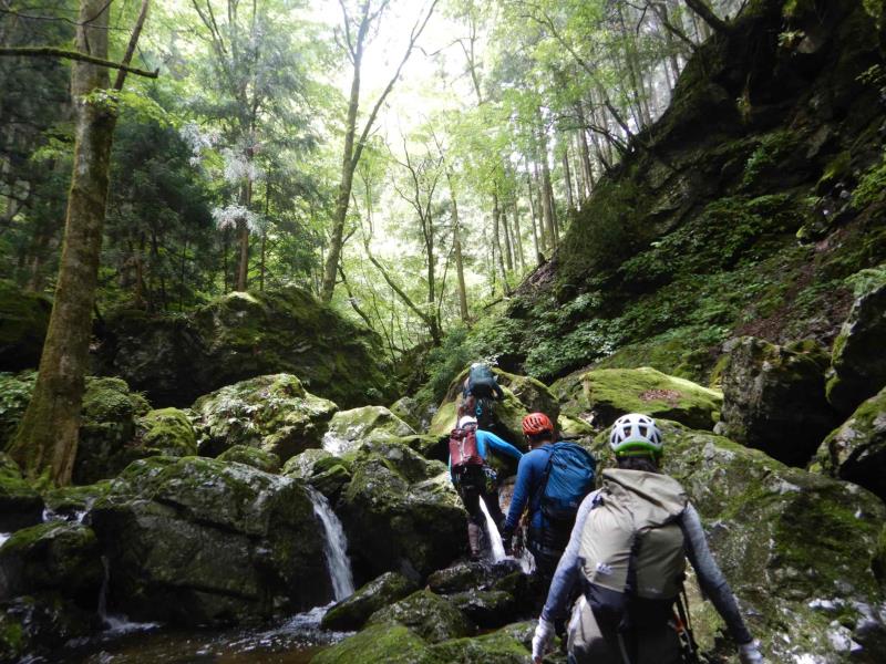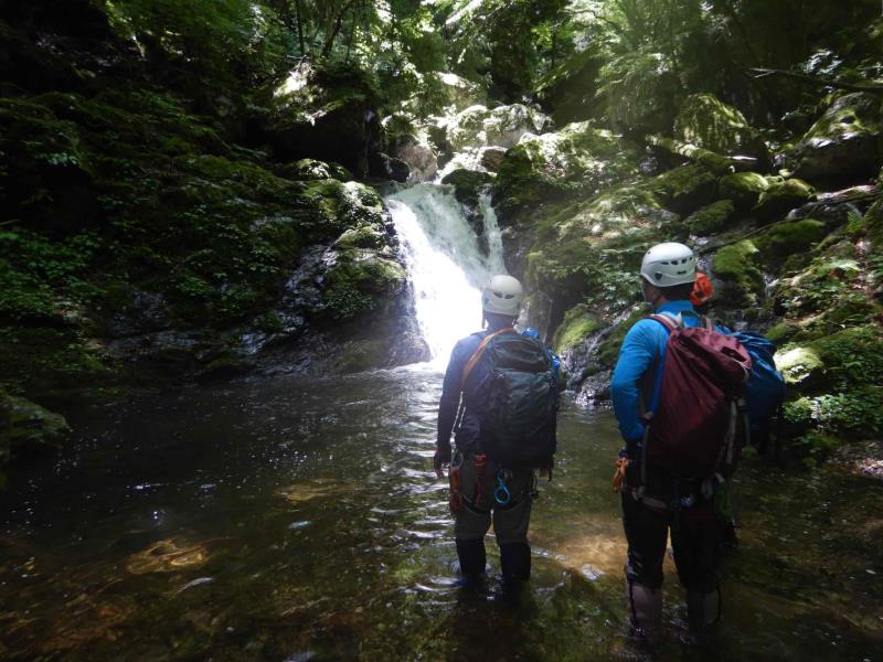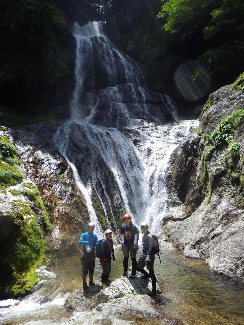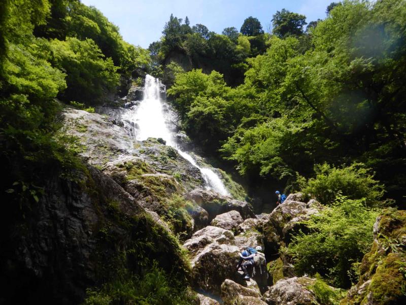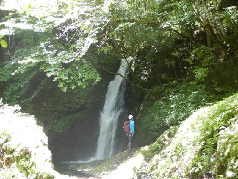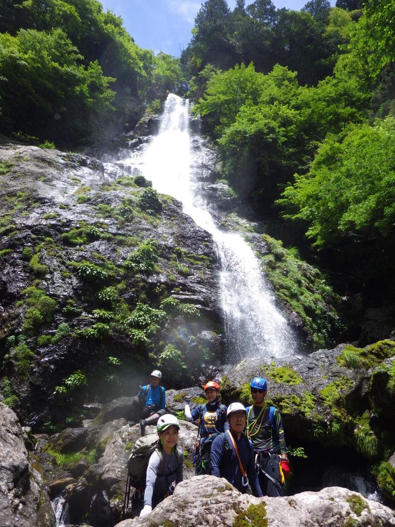 グレードは初級ですが、2段50m琵琶滝や40mの中ノ滝など立派な滝もあり楽しいルートです。7時半頃登山口に到着するも雨。テンションは上がらず小雨になるまで約2時間ほど待機。9時半頃スタート。水量は少しだけ増えましたが、コンディションは良好。