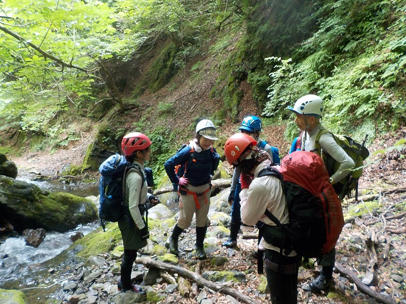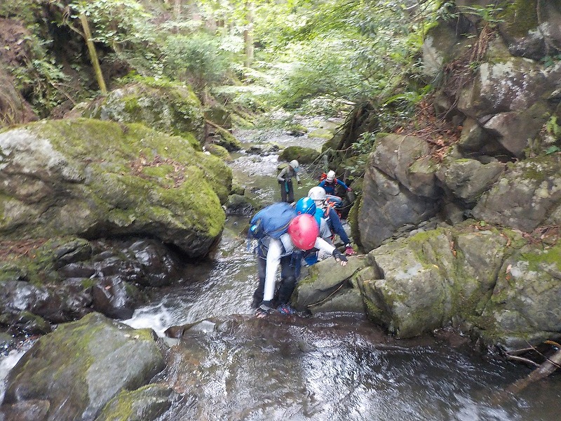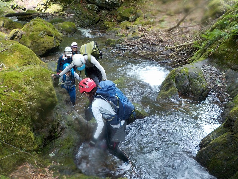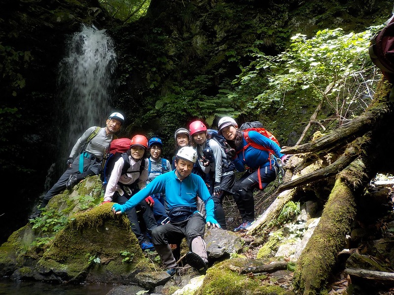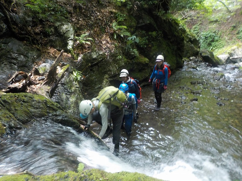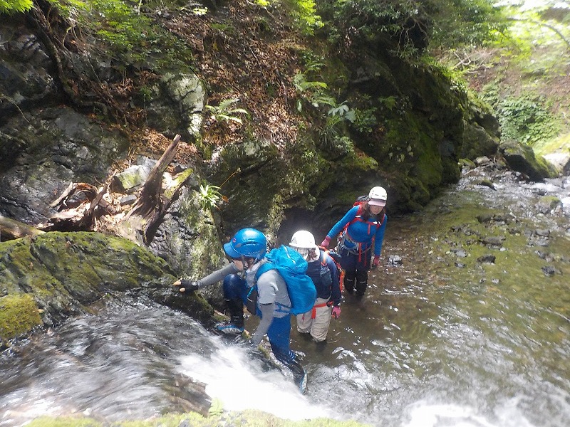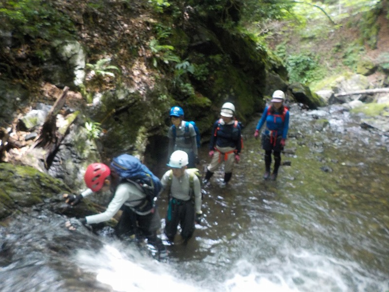 概ね膝丈ぐらいの沢をジャバジャバ歩き時折り現れる小滝はフリーで行ったり、スリングやロープで確保してもらったり、巻いたり、時折キャッ、キャッと黄色い声も聞こえたが全体の技量を見ながらルートを選んでいただいたお陰で楽しく怪我なく一般道へと抜けた。