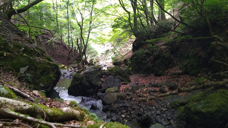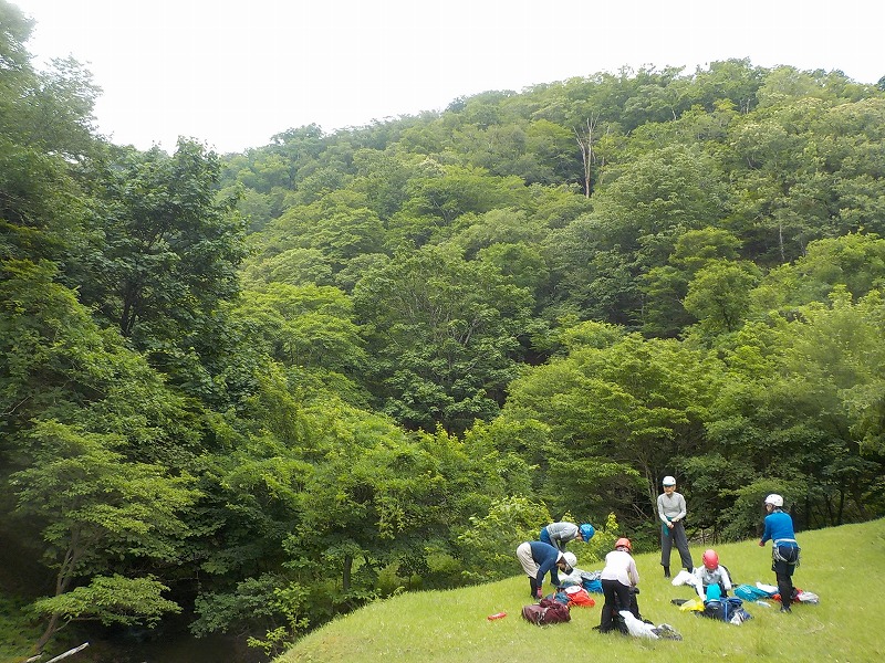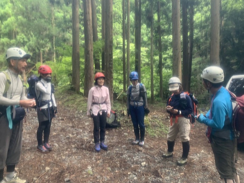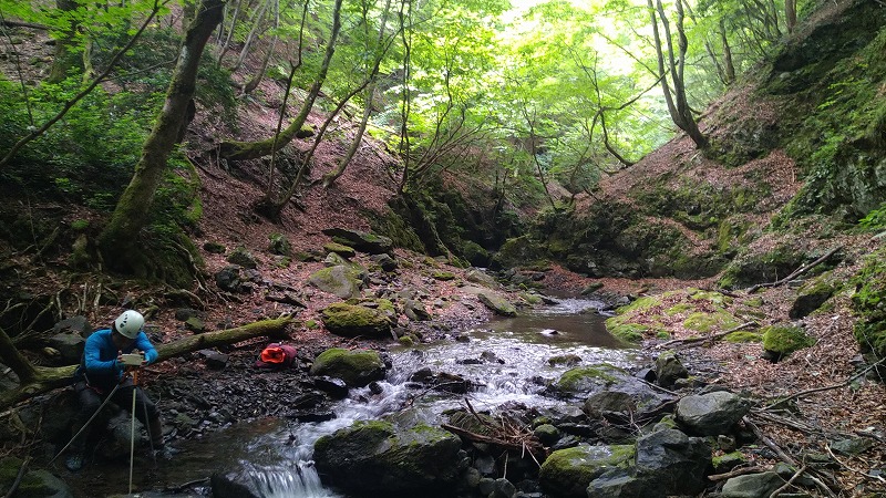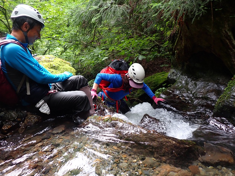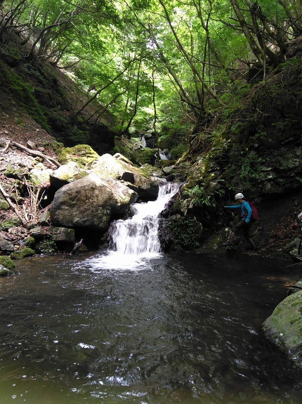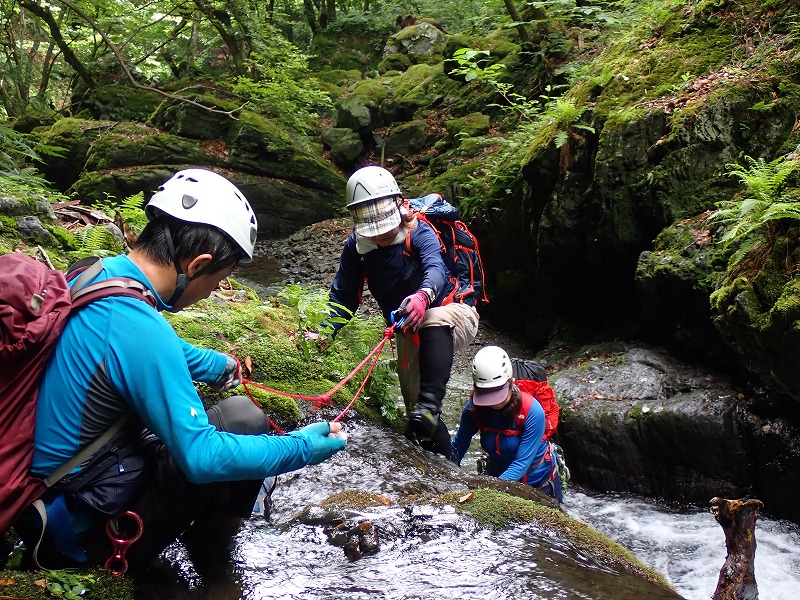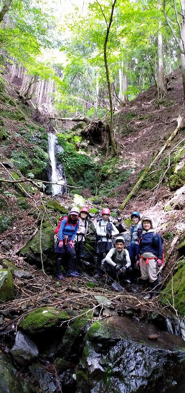 概ね膝丈ぐらいの沢をジャバジャバ歩き時折り現れる小滝はフリーで行ったり、スリングやロープで確保してもらったり、巻いたり、時折キャッ、キャッと黄色い声も聞こえたが全体の技量を見ながらルートを選んでいただいたお陰で楽しく怪我なく一般道へと抜けた。