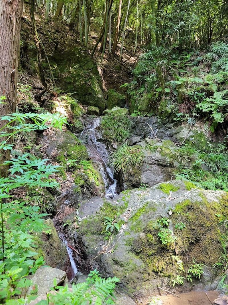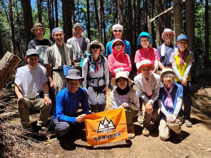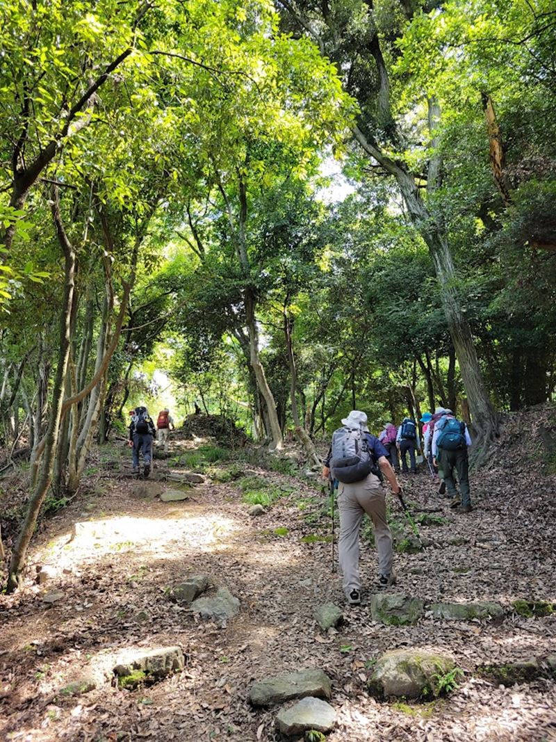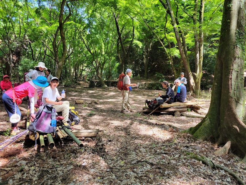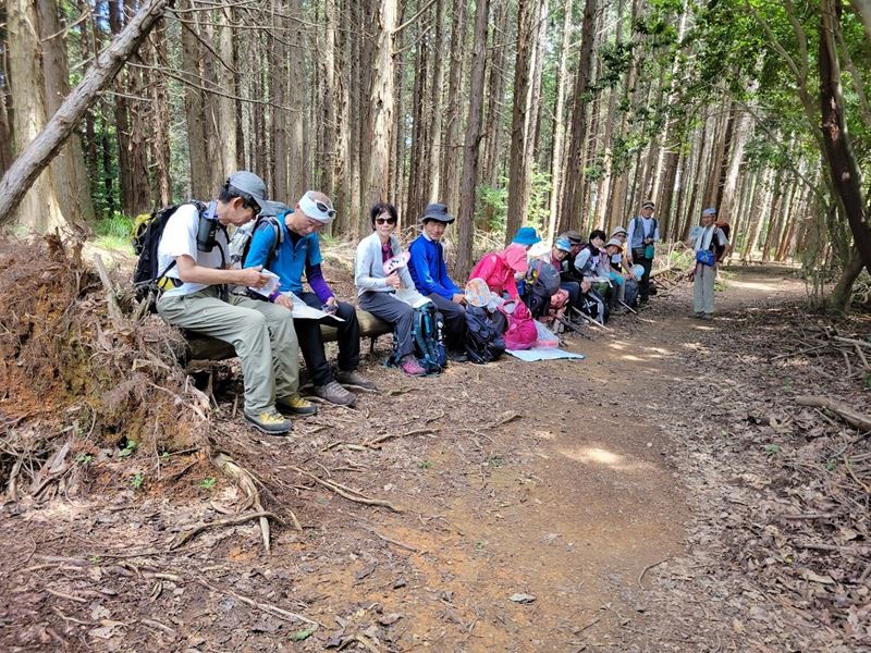 登山道に入ると、滝あり、絶景あり、史跡ありのなだらかな道。今日はSさんの初リーダー例会でしたが、リーダーは先頭をゆっくり歩いて、みんなを引っぱって行ってくれました。若山山頂でお昼休憩をとり、記念撮影もバッチリです。