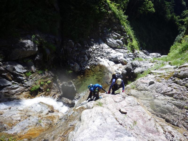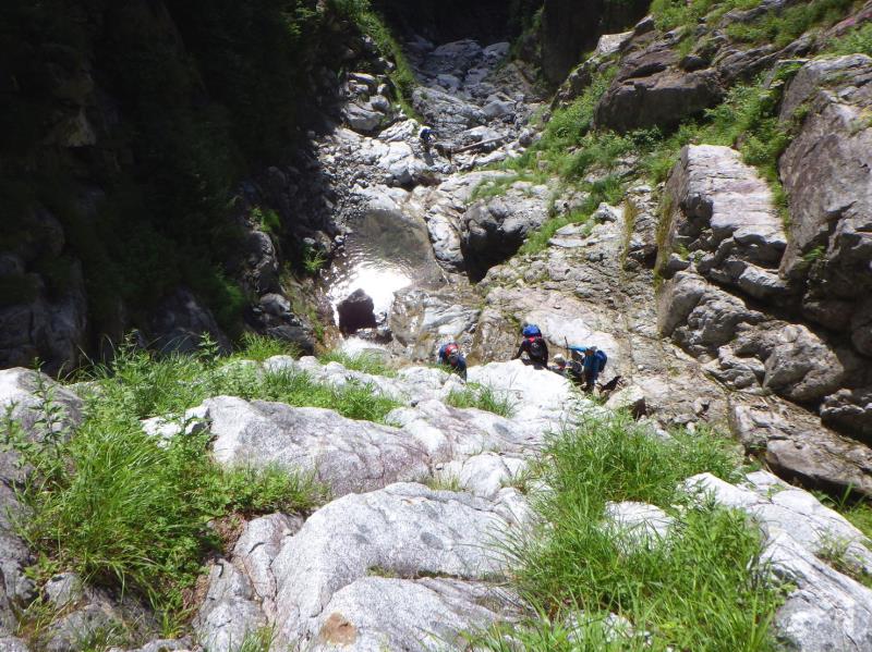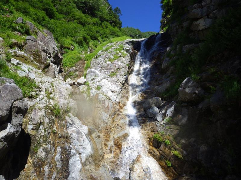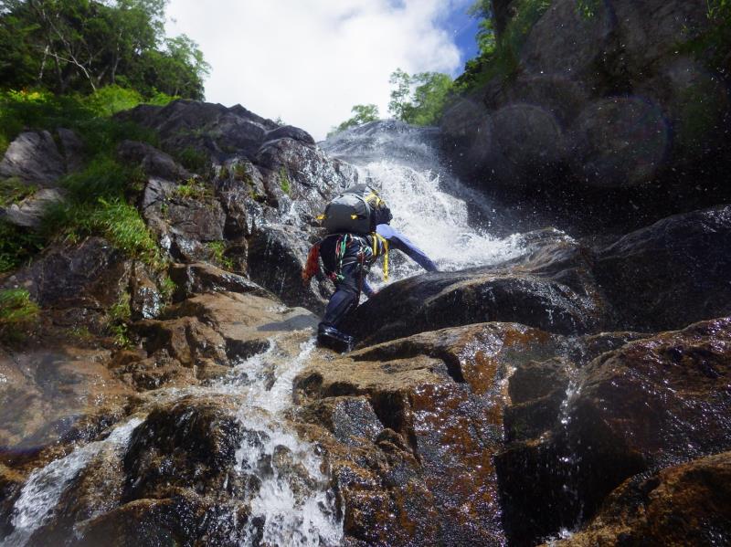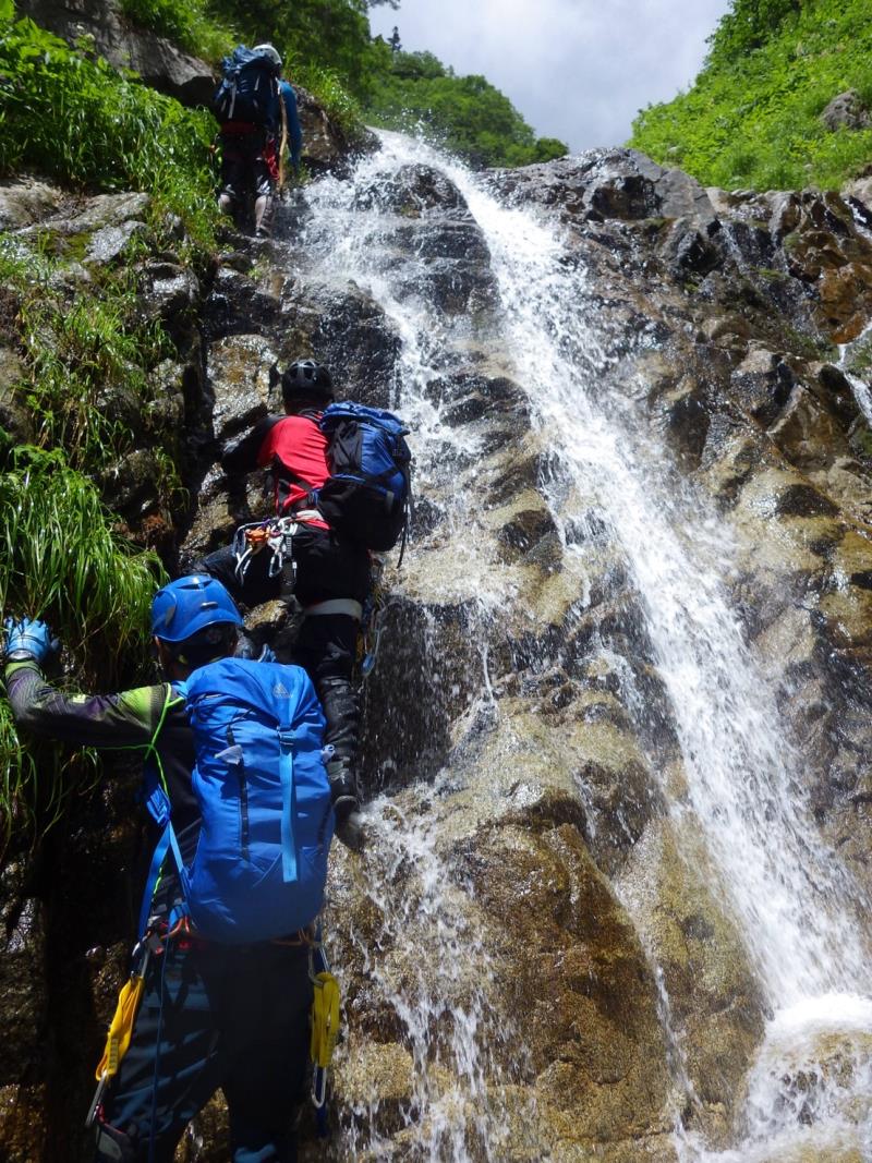 かなりの高度感!ここはロープを出しました。大滝以降も登りごたえのある滝の連続で飽きません。標高2500m近くで流れが細くなり登山道と合流しました。