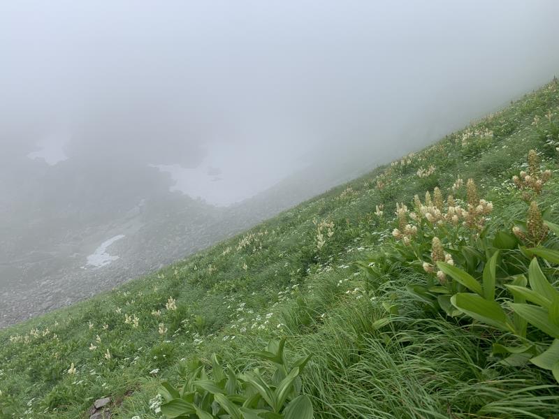 2日目、雨は降らないまでも、どんよりとガスの多い朝となった。晴れていれば素敵なお花畑だろうなと恨めしく思いつつ、北ノ俣岳では強風にあおられ、ゴロゴロした岩場を慎重に通過した。「almost there」って誰かが言ったけど、なかなか黒部五郎岳の肩に着かない。やっとこたどり着き荷物をデポして山頂へ。予想通り山頂でも眺望はない。残念。でも、カールに降りると、少し晴れ間がのぞいて向かいの雲の平がうっすら見えたり、雪渓が見えたりした時はほんの少し元気が出た。それでも、黒部五郎小舎まではまだまだ遠い。結局、11時間近くかかって2日目のテン場に到着した。手際よくテントを設営して、2日目の献立、カレー作りに取り掛かる。N大先輩手作りのぺミカン、初めて見ました。あんずのピューレ、ドライトマトで煮込んだカレーは絶品、デザートにわらびもちも作って下さり、大満足でした。明日はもっと長丁場、お願い、晴れて!!と念じつつ、疲れていたからか、いつの間にか眠ってしまった。
