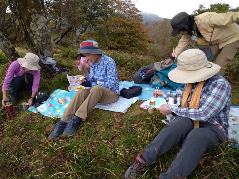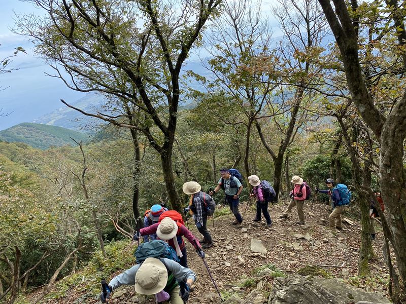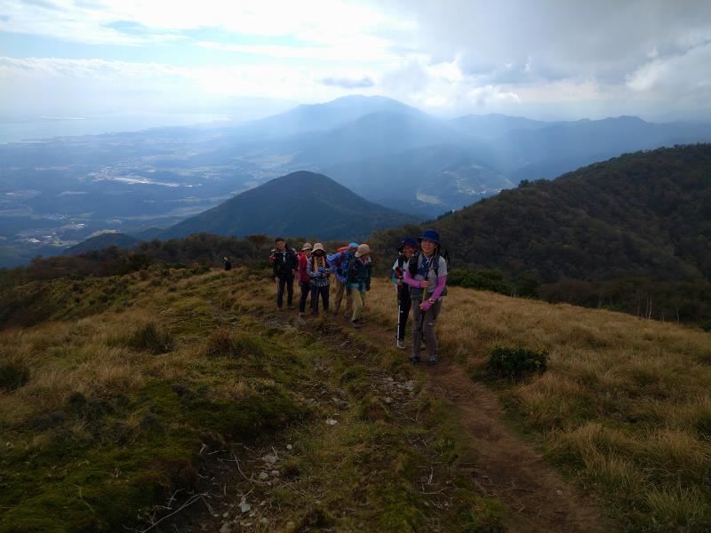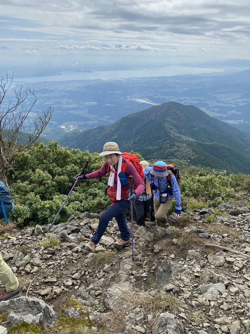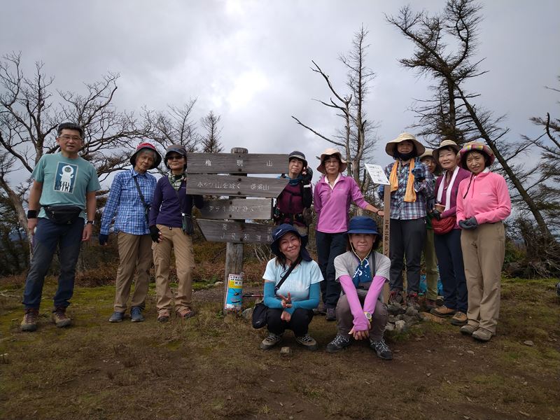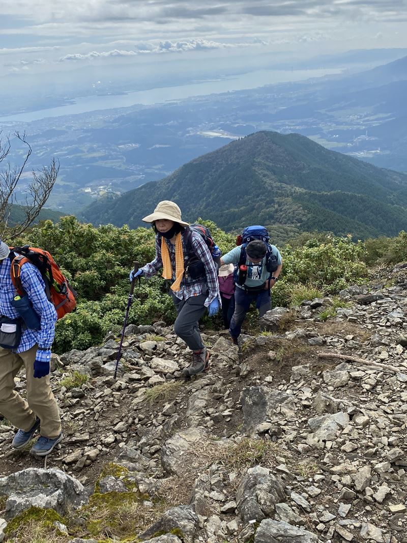 京都趣味登山会恒例の集中登山です。今年目指す山頂は比良の蓬莱山。霊仙山コースは和邇駅から登山口まで車で移動し、12名で三角形の端正な独立峰のように見える霊仙山に向け出発です。基本急こう配ですが、権現山までは樹林帯。流れる滝汗も高度を上げるにつれ谷からの風で落ち着きます。「ズコノバンって何?」と話していた栗原と上がってきた道と合流する林道がその場所でした。そこから権現山迄かなりの急登になりますが時折のぞく琵琶湖に励まされ稜線へ。権現山で昼食を摂ったのち小女郎池でしばし「カフェタイム」。他のコースの皆さんとお久しぶりのあいさつを交わしながら蓬莱山ゴールです。体験山行のTさんもみんなと足を合わせて歩かれ入会を決められ、楽しい山行を終えることができました。(Y・J)