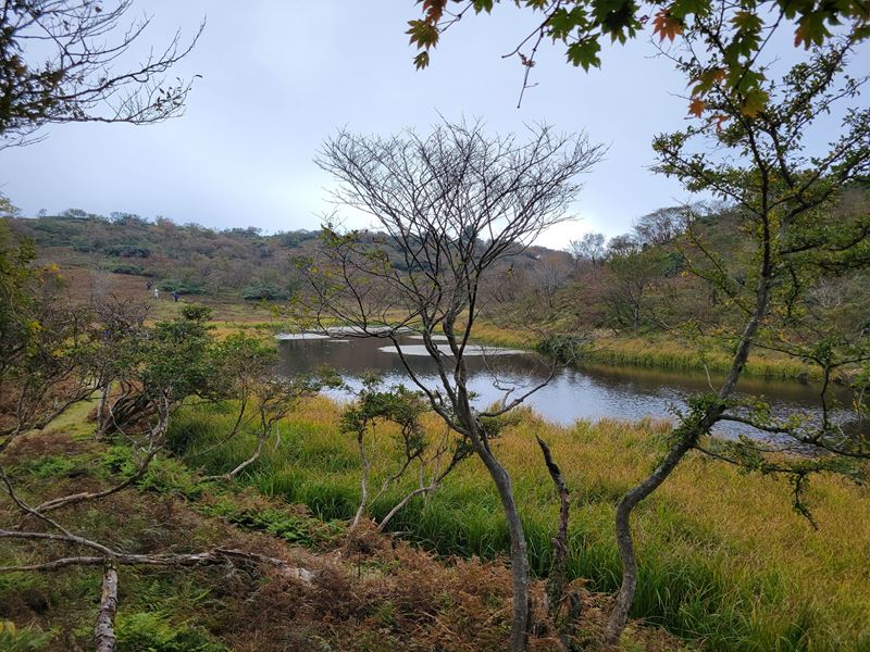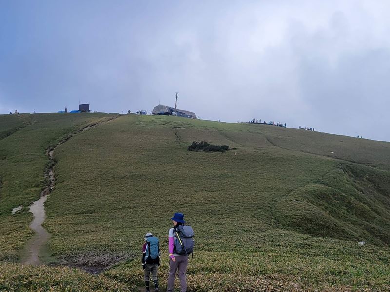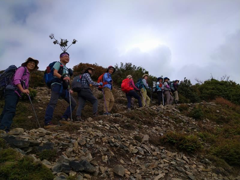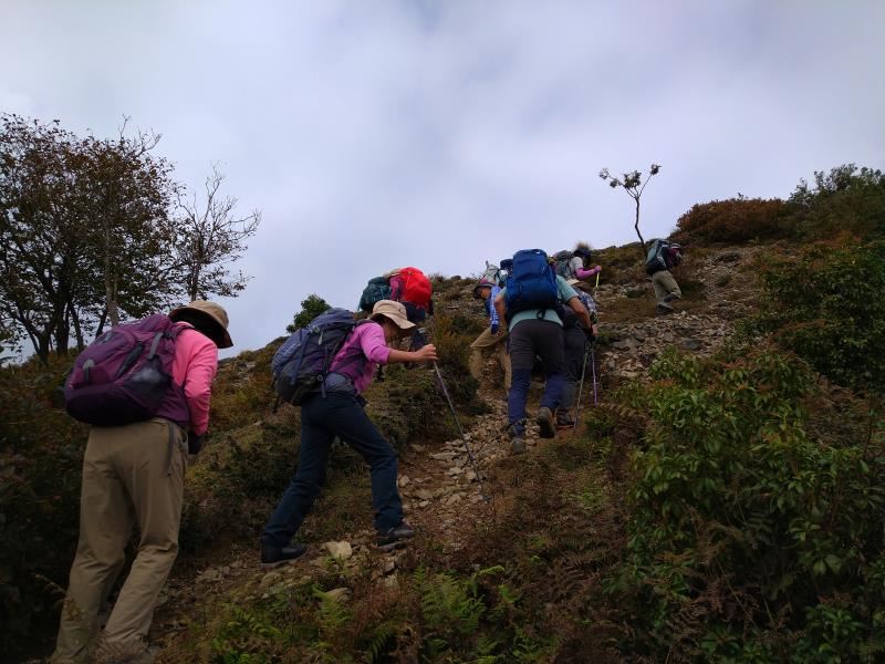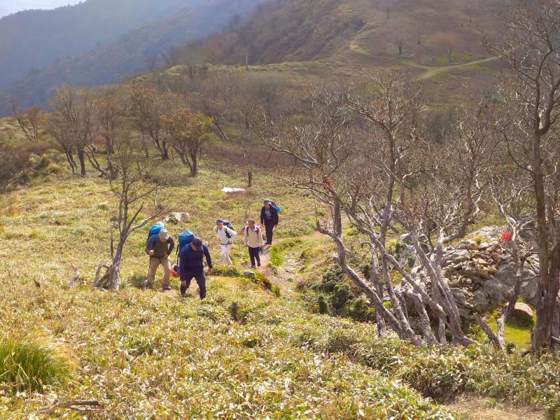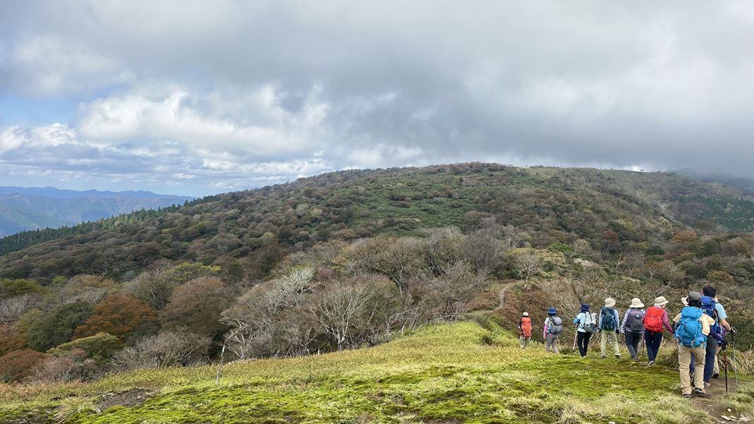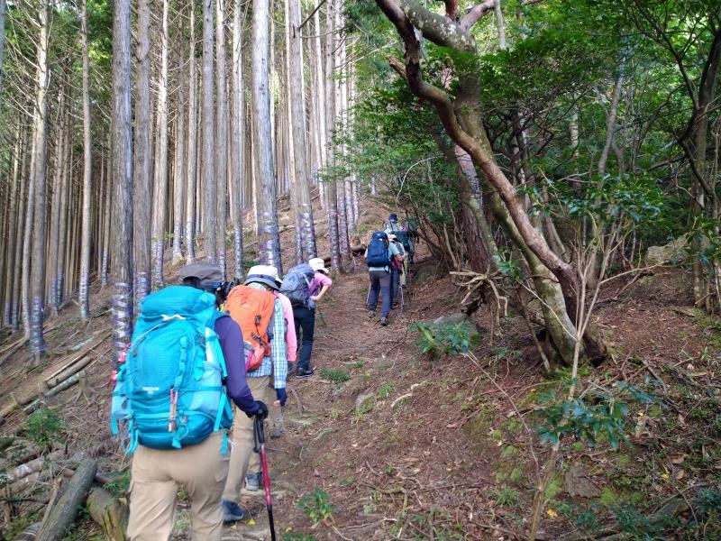 京都趣味登山会恒例の集中登山です。今年目指す山頂は比良の蓬莱山。霊仙山コースは和邇駅から登山口まで車で移動し、12名で三角形の端正な独立峰のように見える霊仙山に向け出発です。基本急こう配ですが、権現山までは樹林帯。流れる滝汗も高度を上げるにつれ谷からの風で落ち着きます。「ズコノバンって何?」と話していた栗原と上がってきた道と合流する林道がその場所でした。そこから権現山迄かなりの急登になりますが時折のぞく琵琶湖に励まされ稜線へ。権現山で昼食を摂ったのち小女郎池でしばし「カフェタイム」。他のコースの皆さんとお久しぶりのあいさつを交わしながら蓬莱山ゴールです。体験山行のTさんもみんなと足を合わせて歩かれ入会を決められ、楽しい山行を終えることができました。(Y・J)