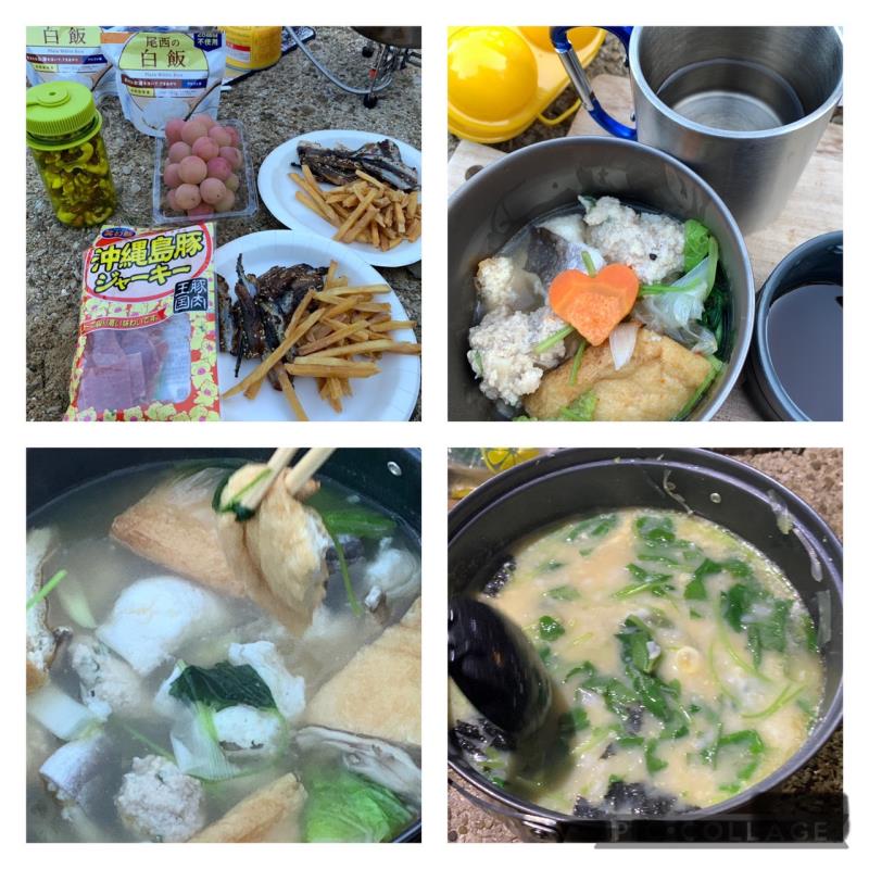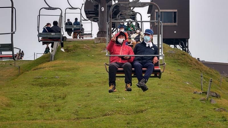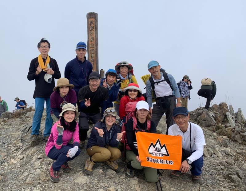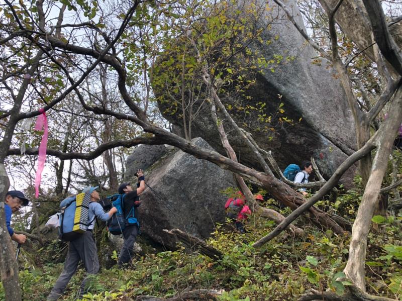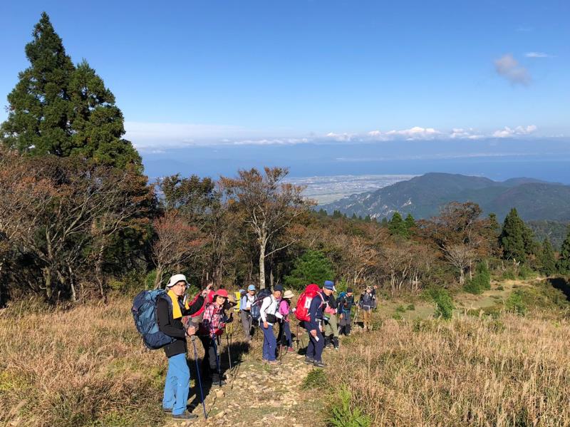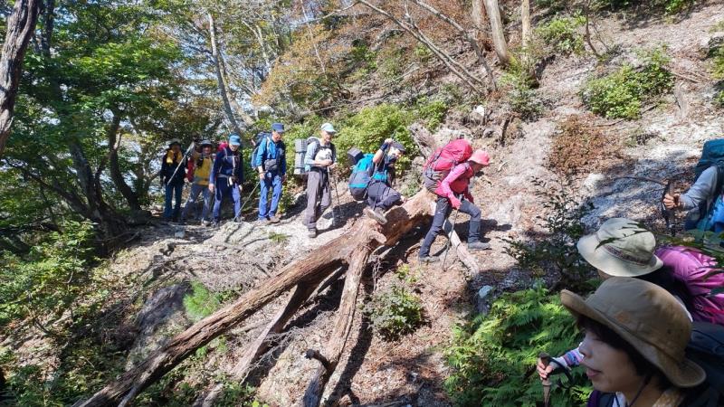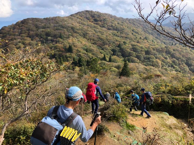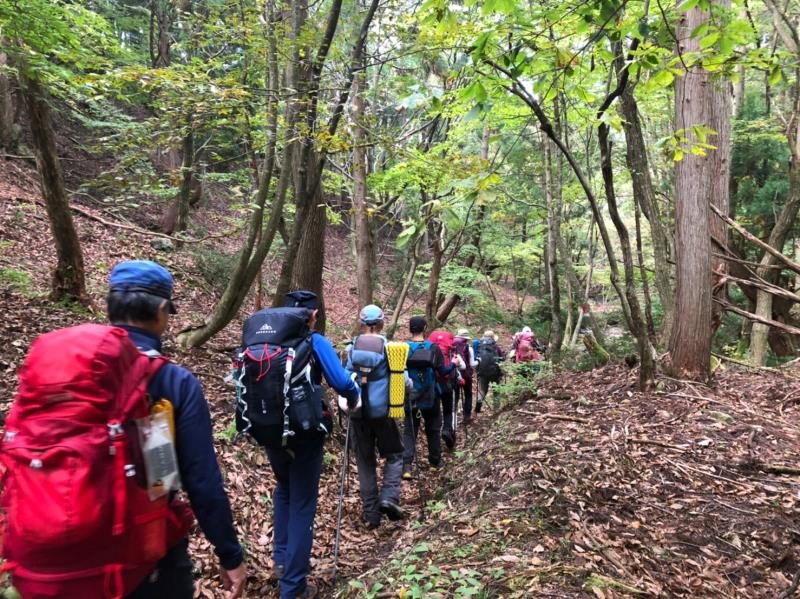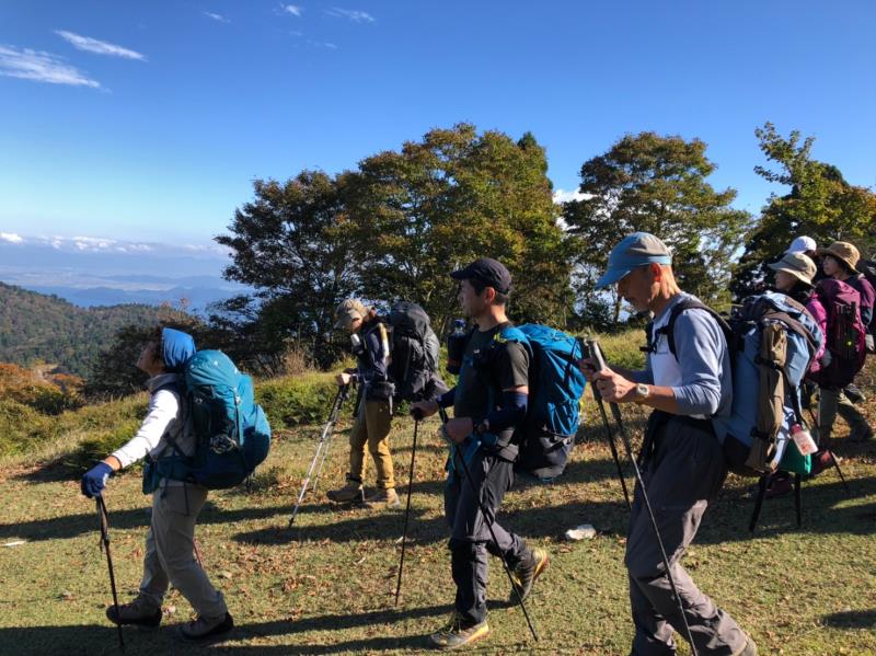 夕食は食担の大先輩Tさんの特製お鍋。エビ入りのつみれ、ふわふわの鱧、お揚げといった具沢山のごちそうに、参加者みなお腹いっぱい、話も弾んで、和やかなひと時を過ごし、早めに就寝。2日目も天気良く、出発までたっぷり時間があたので、Iサブリーダーのロープワークの講習をしてくださいました。その後、集合場所の蓬莱山目指して出発、打見山で重いザックをデポして、迷わずリフトで集合場所である蓬莱山にらくらく到着、他のパーティと合流したのでした。