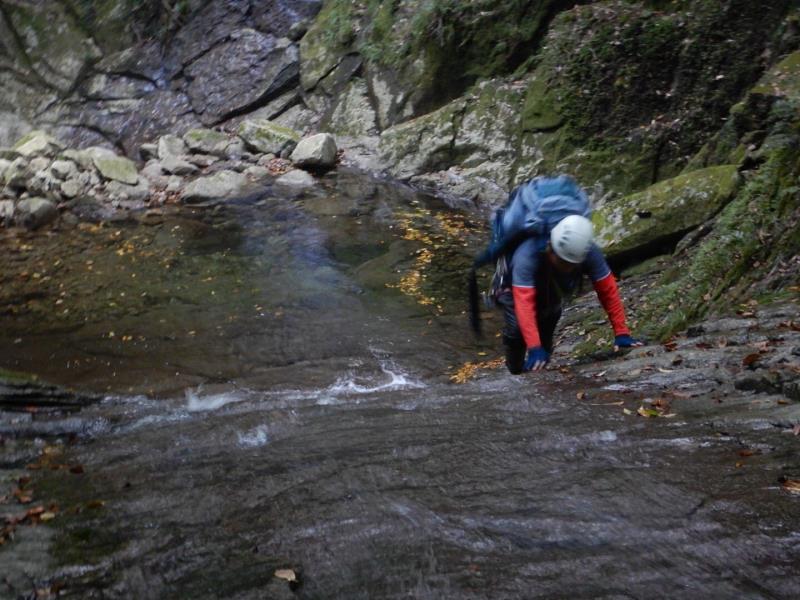 30m級の大滝は2箇所、核心はこの滝の巻きであったかと。 高度感のある 岩壁の縁のトラバースは緊張感たっぷりで、おまけにアンバランスな梯子まであった。地図を入念に読んでくれたリーダーとサブ、分かりにくいルートにもかかわらず目標の 沢床への復帰は天晴れだった。その先には長いナメロードのご褒美あり。Sさんは、ウォータースライダーでハイテンション。