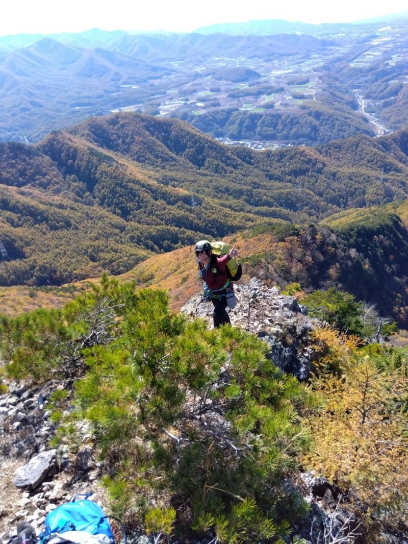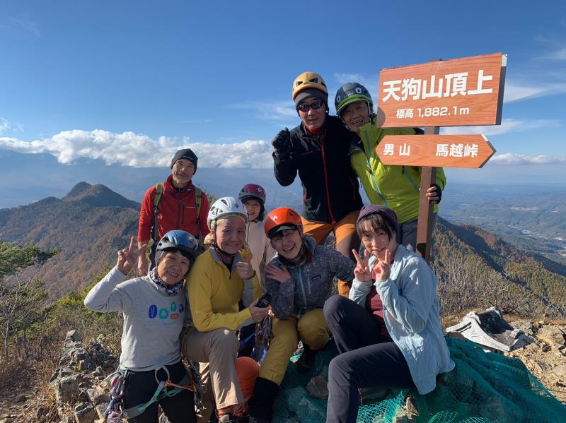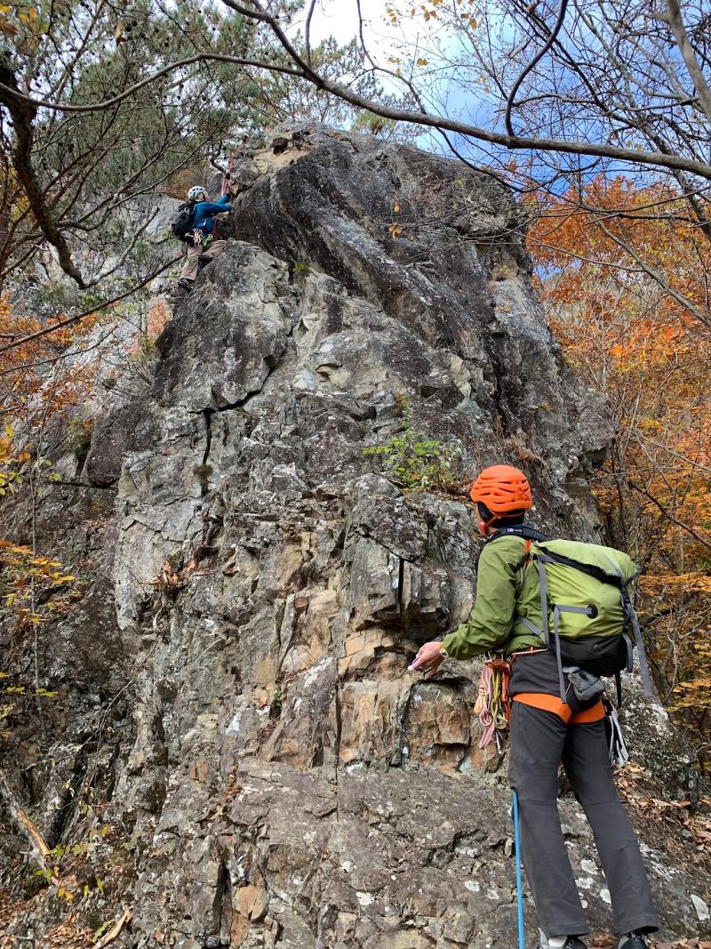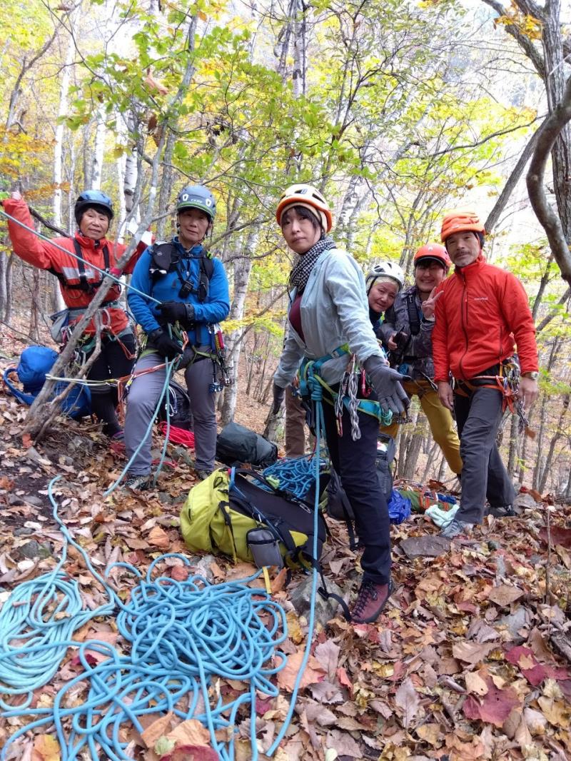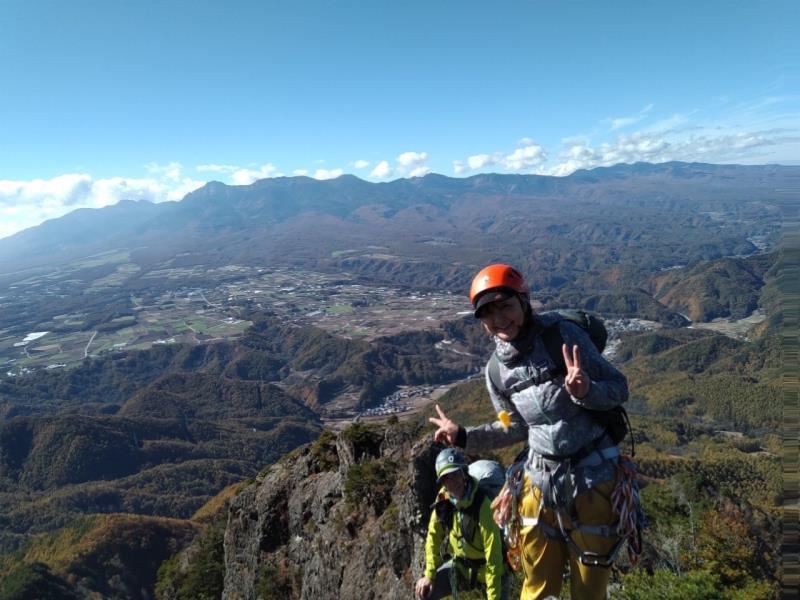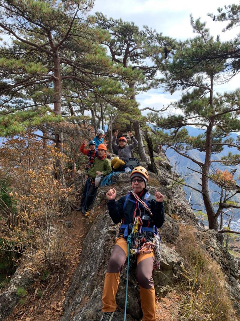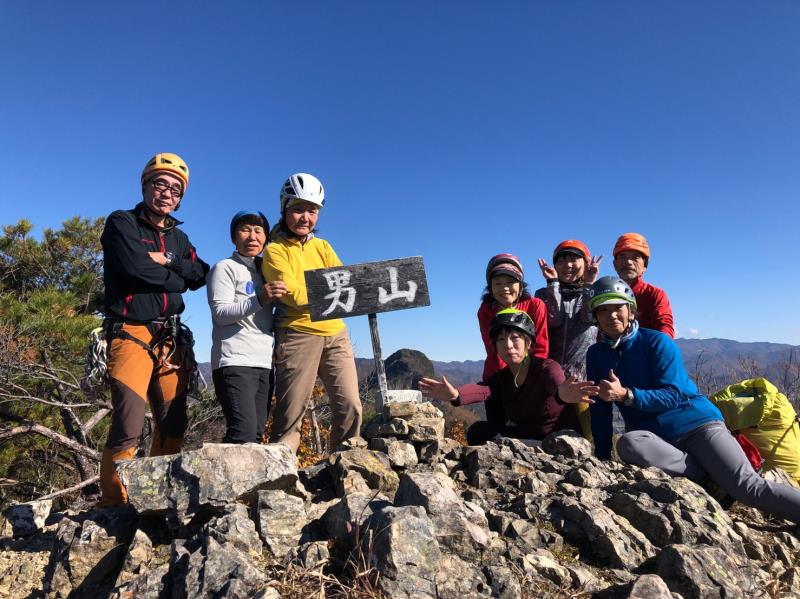 のある三段岩壁。所々脆い岩があったり浮石だらけでロープによる巻き込みに注意を払いながら全員無事に登攀。眼下に広がるカラマツの黄葉を愉しみながらのクライミングは最高だった。最終日は千曲川沿いの橋を渡って男山への登山口から取り付きまで約2時間。3ピッチ登ったあと、両側の切れ落ちた岩稜帯を進んで山頂へ。青空のもと、ギザギザの瑞牆山から富士山、南アルプス、八ヶ岳連峰、浅間山、北アルプスなどが一望できた。技術的には、カムやナチュラルプロテクションのセットやルーファイも含め、アルパインクライミングに必要な総合的なテクニックを学ぶ良い機会になったと思う。よく食べ、よく飲み、語り合い、登った2泊3日。参加の皆さん、ありがとうございました。(S.I.)