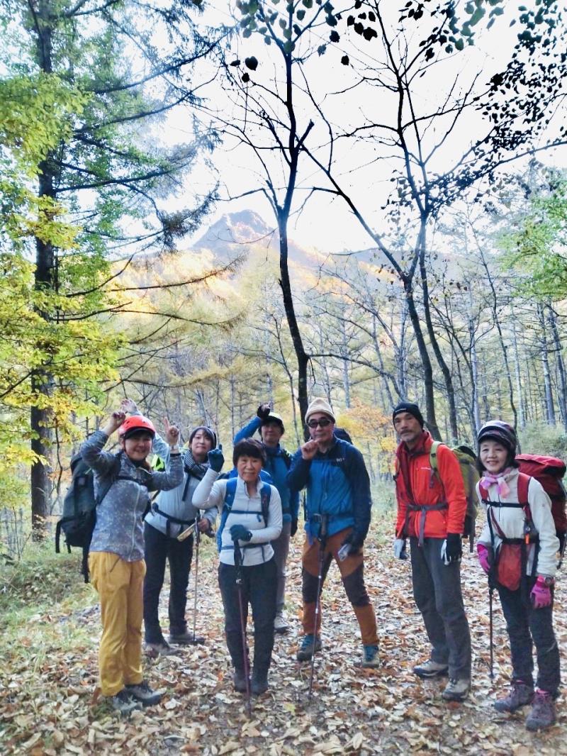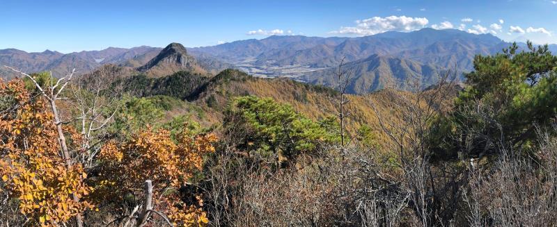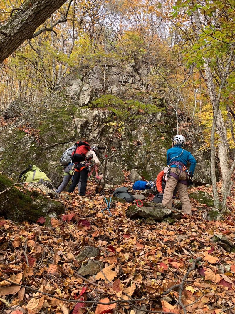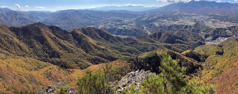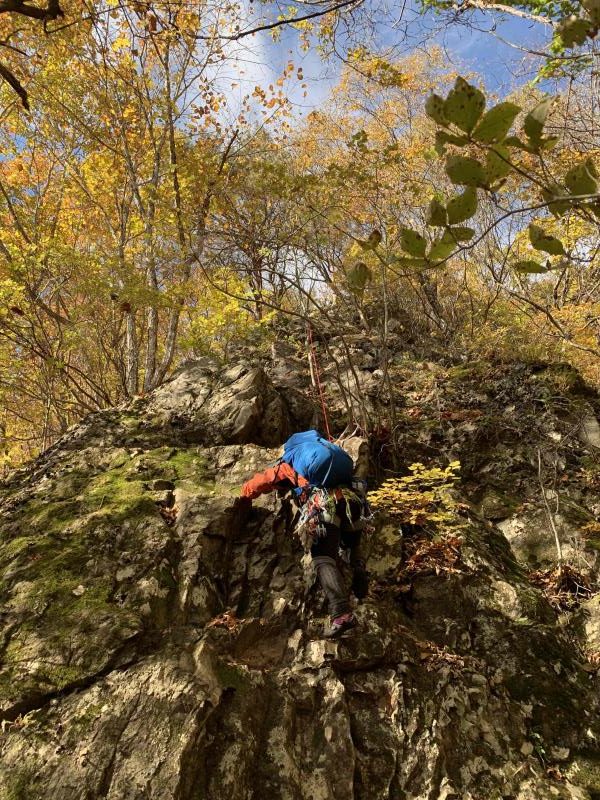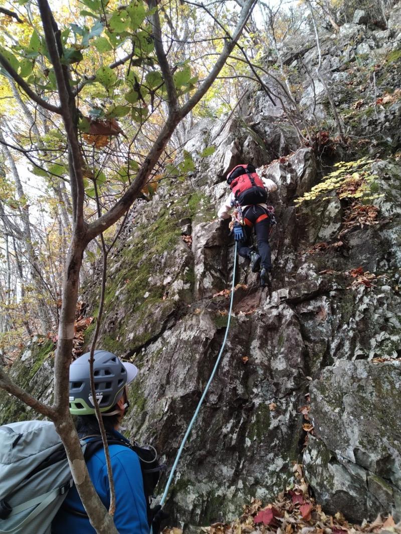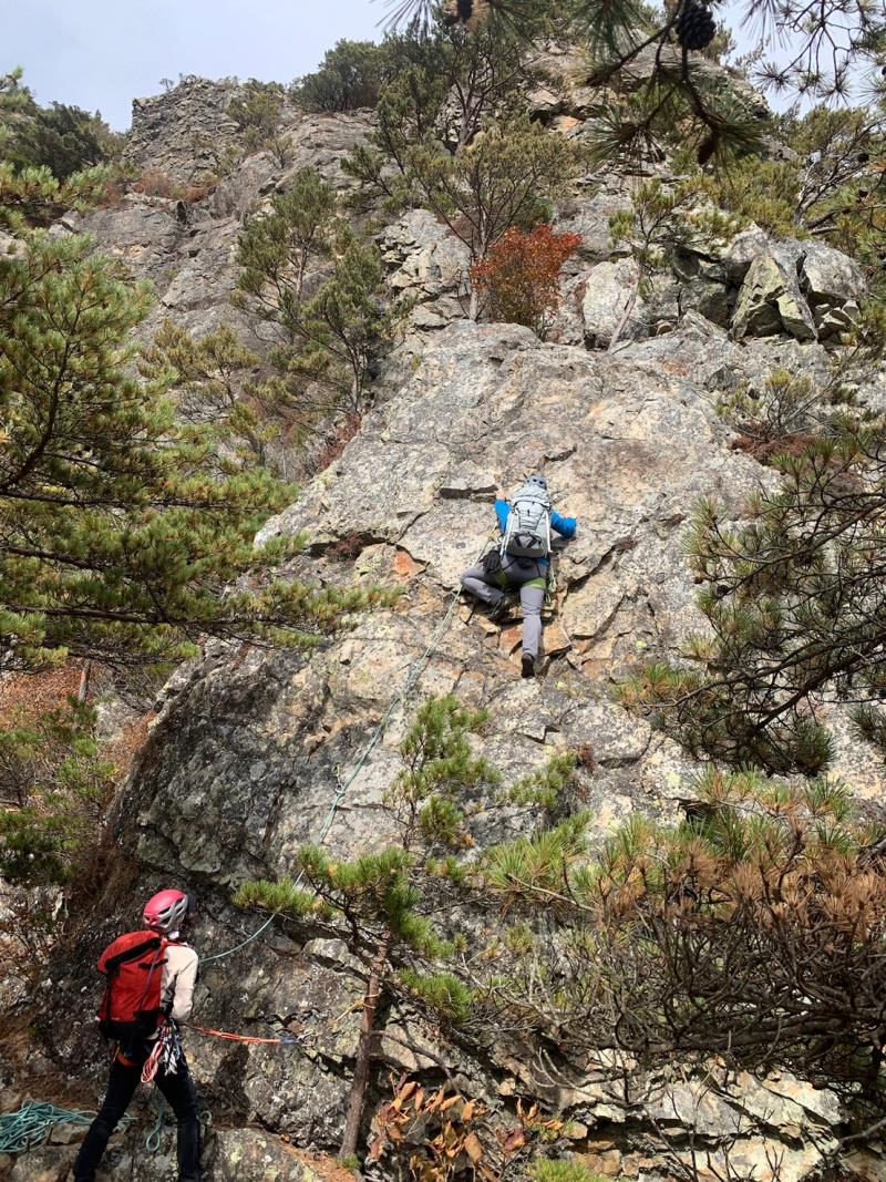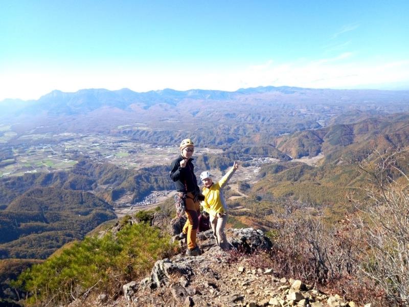 のある三段岩壁。所々脆い岩があったり浮石だらけでロープによる巻き込みに注意を払いながら全員無事に登攀。眼下に広がるカラマツの黄葉を愉しみながらのクライミングは最高だった。最終日は千曲川沿いの橋を渡って男山への登山口から取り付きまで約2時間。3ピッチ登ったあと、両側の切れ落ちた岩稜帯を進んで山頂へ。青空のもと、ギザギザの瑞牆山から富士山、南アルプス、八ヶ岳連峰、浅間山、北アルプスなどが一望できた。技術的には、カムやナチュラルプロテクションのセットやルーファイも含め、アルパインクライミングに必要な総合的なテクニックを学ぶ良い機会になったと思う。よく食べ、よく飲み、語り合い、登った2泊3日。参加の皆さん、ありがとうございました。(S.I.)