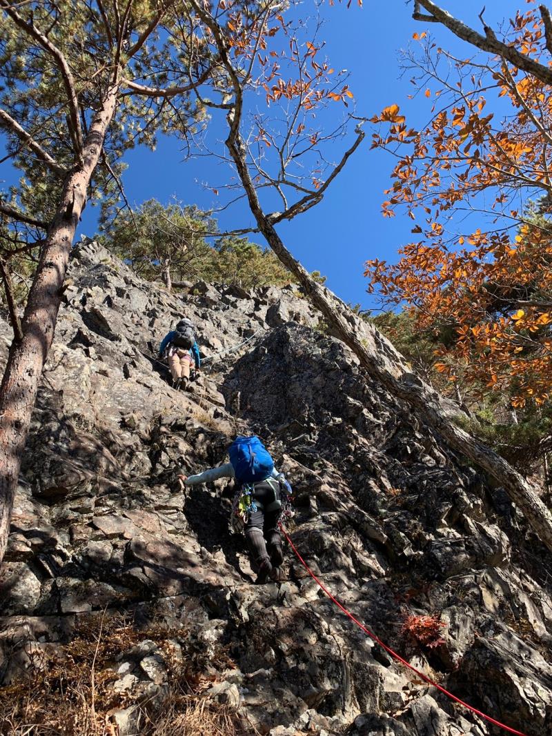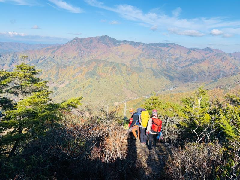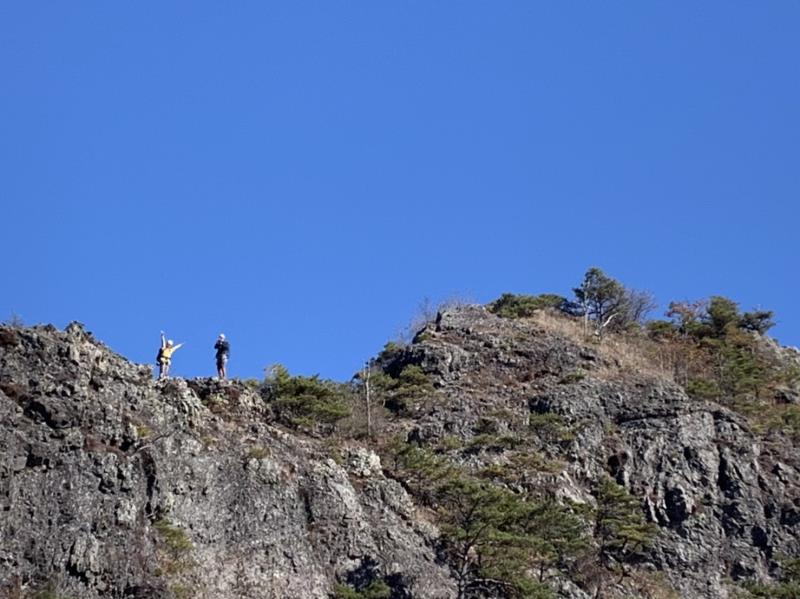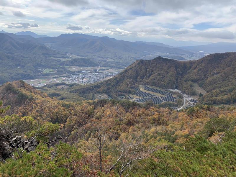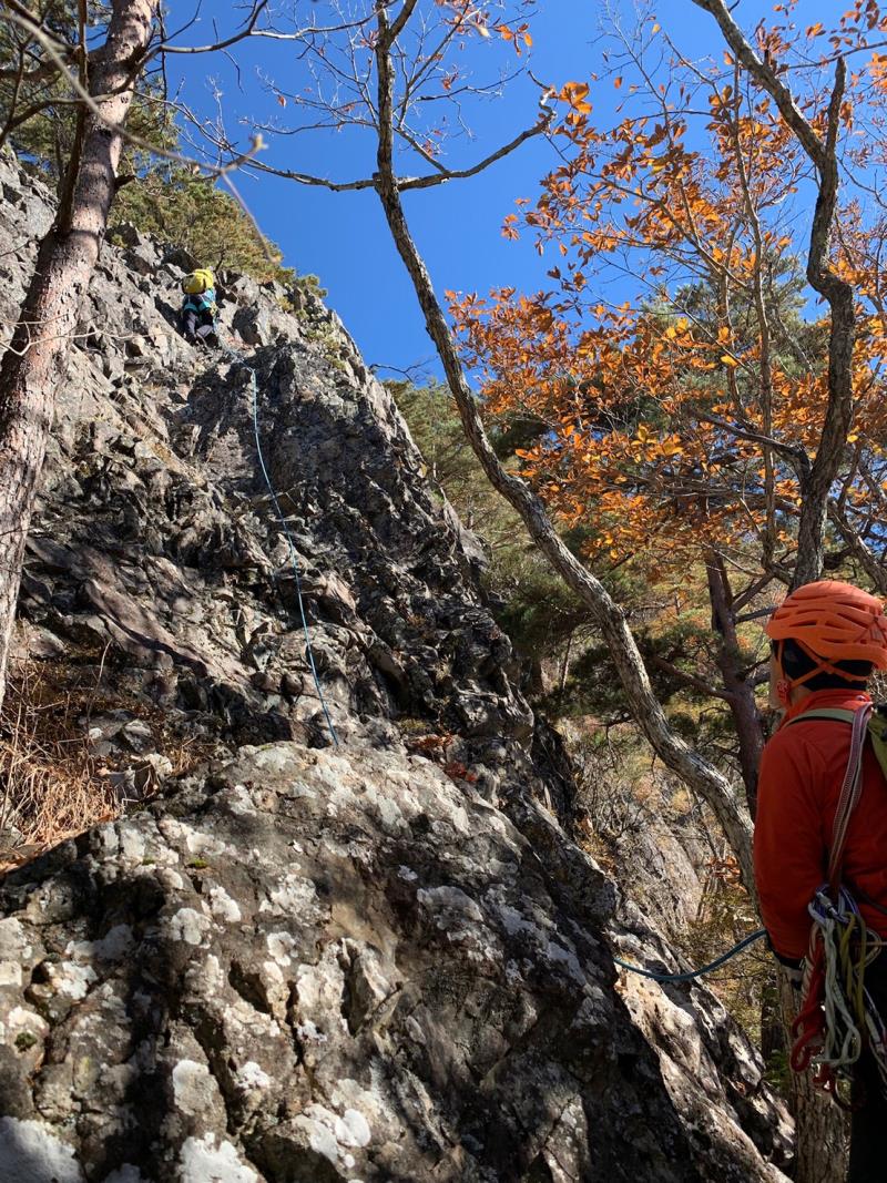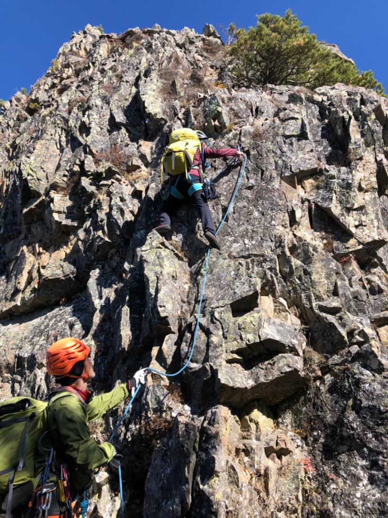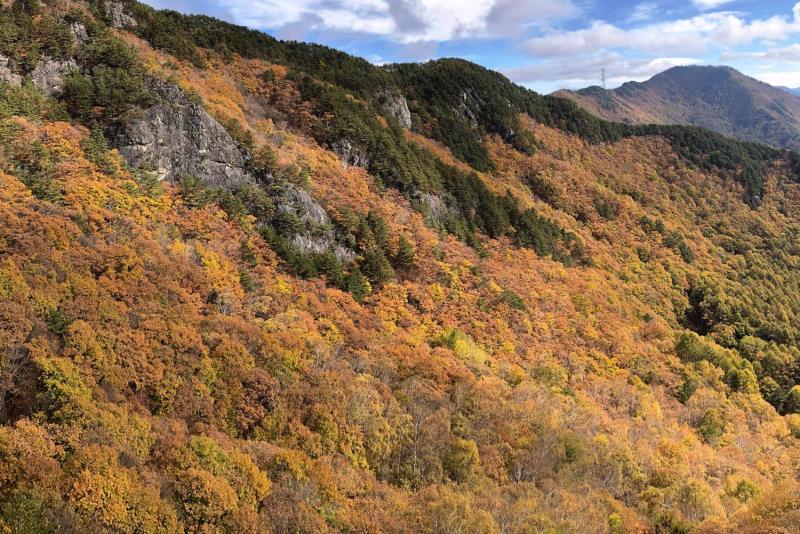 のある三段岩壁。所々脆い岩があったり浮石だらけでロープによる巻き込みに注意を払いながら全員無事に登攀。眼下に広がるカラマツの黄葉を愉しみながらのクライミングは最高だった。最終日は千曲川沿いの橋を渡って男山への登山口から取り付きまで約2時間。3ピッチ登ったあと、両側の切れ落ちた岩稜帯を進んで山頂へ。青空のもと、ギザギザの瑞牆山から富士山、南アルプス、八ヶ岳連峰、浅間山、北アルプスなどが一望できた。技術的には、カムやナチュラルプロテクションのセットやルーファイも含め、アルパインクライミングに必要な総合的なテクニックを学ぶ良い機会になったと思う。よく食べ、よく飲み、語り合い、登った2泊3日。参加の皆さん、ありがとうございました。(S.I.)