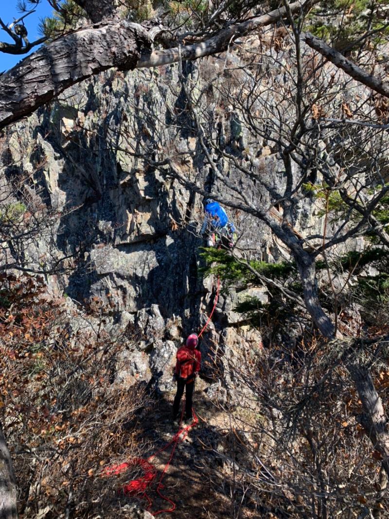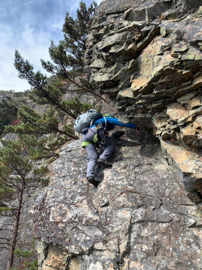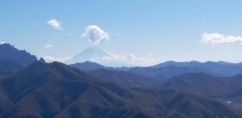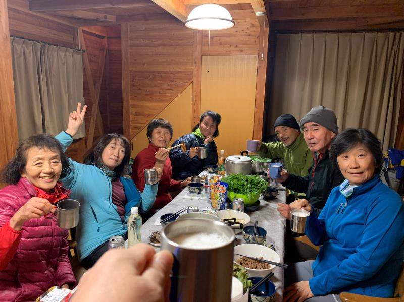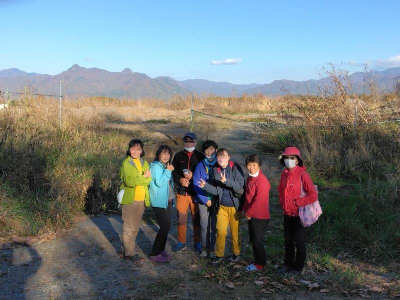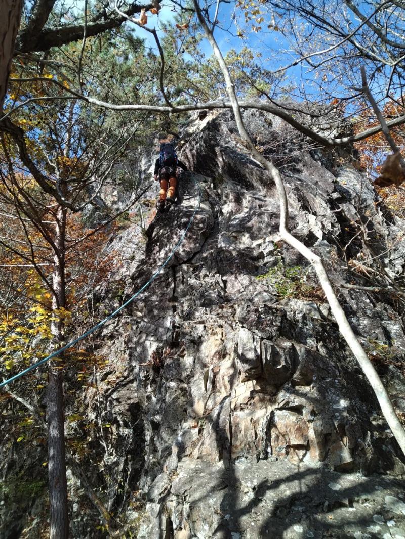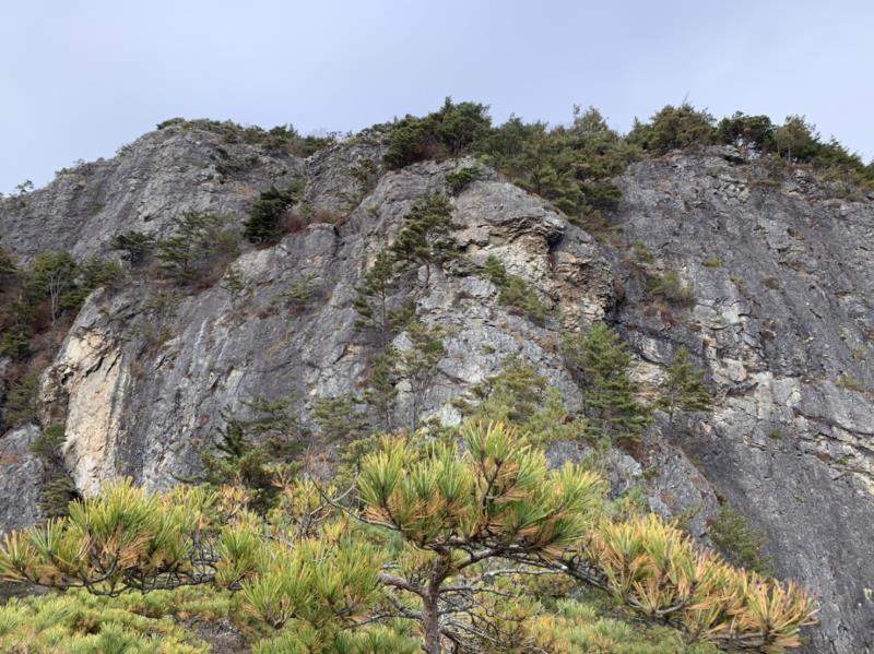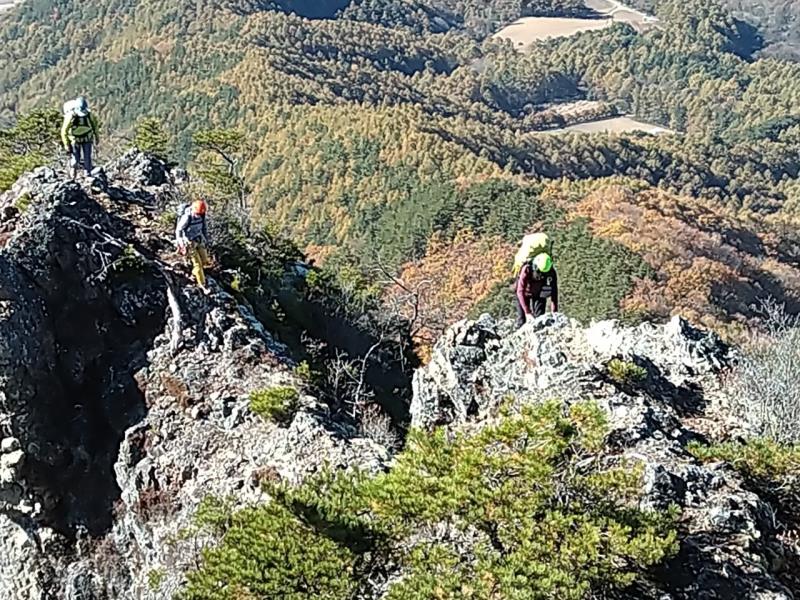 のある三段岩壁。所々脆い岩があったり浮石だらけでロープによる巻き込みに注意を払いながら全員無事に登攀。眼下に広がるカラマツの黄葉を愉しみながらのクライミングは最高だった。最終日は千曲川沿いの橋を渡って男山への登山口から取り付きまで約2時間。3ピッチ登ったあと、両側の切れ落ちた岩稜帯を進んで山頂へ。青空のもと、ギザギザの瑞牆山から富士山、南アルプス、八ヶ岳連峰、浅間山、北アルプスなどが一望できた。技術的には、カムやナチュラルプロテクションのセットやルーファイも含め、アルパインクライミングに必要な総合的なテクニックを学ぶ良い機会になったと思う。よく食べ、よく飲み、語り合い、登った2泊3日。参加の皆さん、ありがとうございました。(S.I.)