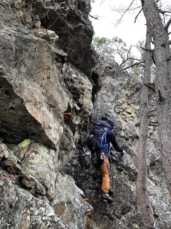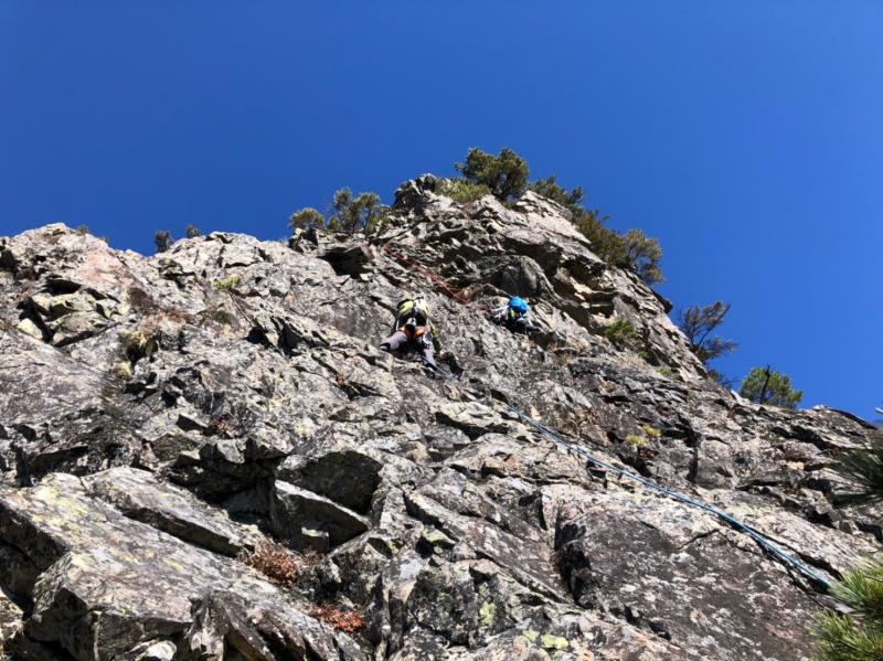 2年前、小川山へクライミング例会に行った際、麓の川上村から眺めた顕著な岩山、天狗山と男山を直登するマルチピッチルートを登ってきた。10年ほど前に山岳ガイドが開拓した、比較的新しいルートだ。初日は、川上村のスーパーで食材を買い出ししてから立原高原キャンプ場へ。テント泊の予定が急きょコテージ泊となり、快適な空間で例会のスタートを切ることになった。2日目、天狗山ダイレクトの12ピッチ(岩稜歩きを含む)をペア4組で登る。核心部は山頂直下の迫力