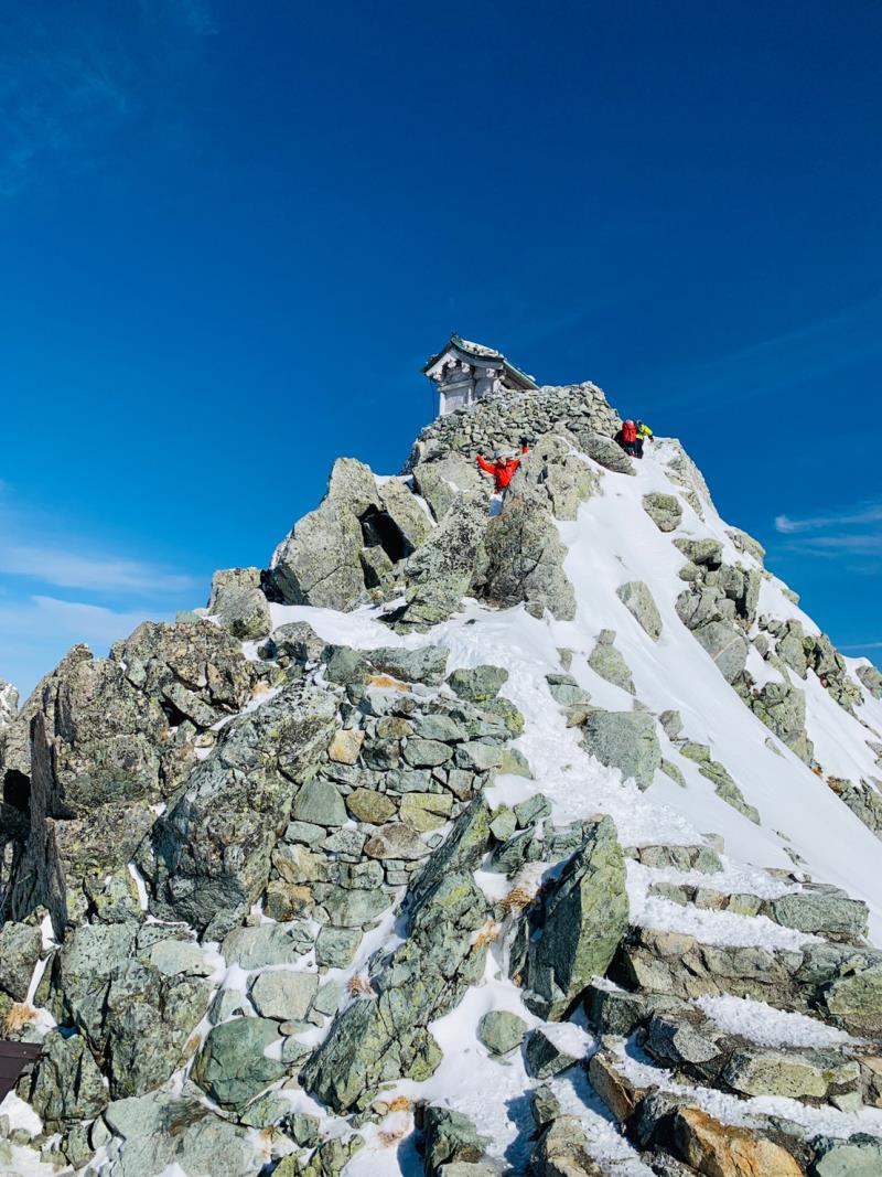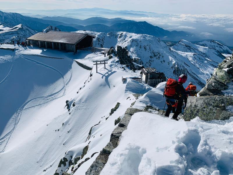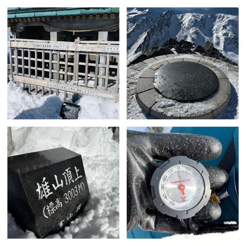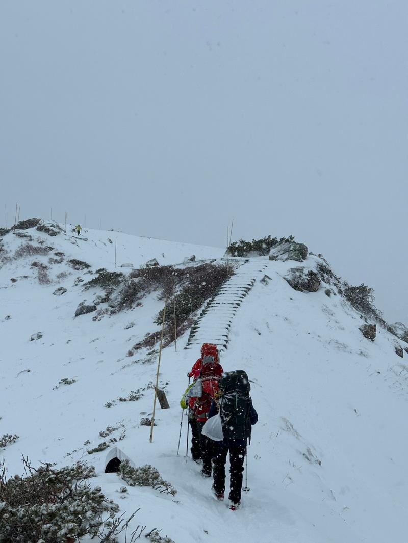 雄山まではせっかくなので、12本爪アイゼンを装着し、アイゼン歩行の練習をしました。SさんとOさんのお二人は、バリエーション想定であえて壁を登られていました。熱心!全員無事に雄山に登頂し、下山。