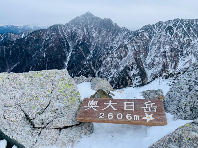 ところが、薄曇りで星も見えるし、風もない。これはピークまで行けるかも、と言いながら、順調に歩を進めました。皆さん力強く歩いてくれたおかげで、無事に奥大日岳に到着!剱岳も堂々とした姿を見せてくれました。