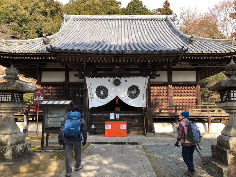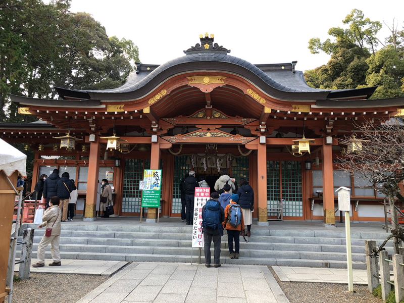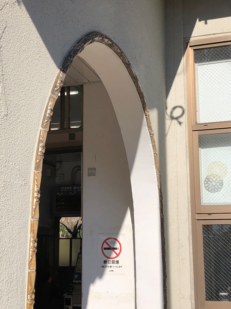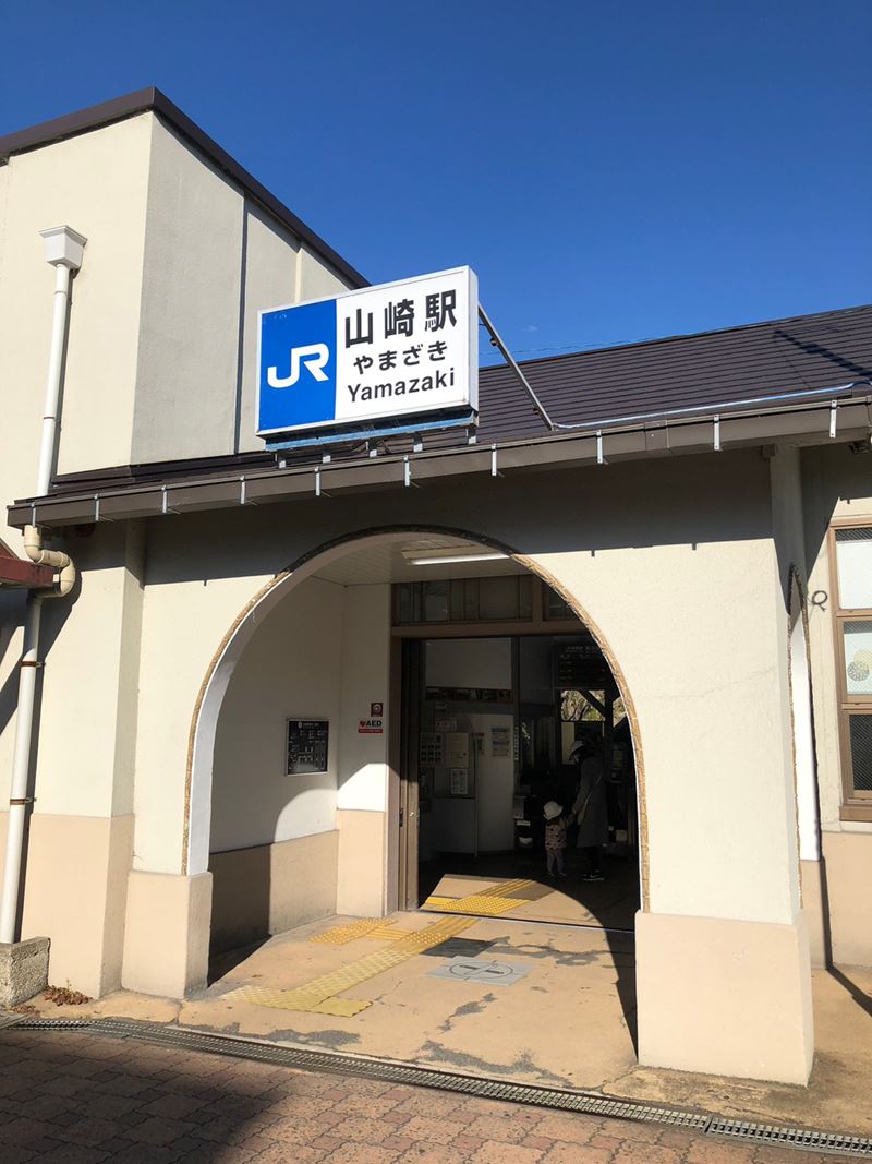 JR山崎駅は鉄道開始150年前の4年後、明治9年に開業。何代目かの今の駅舎もなかなかのレトロ感。駅前の離宮八幡宮で、宮司さんよりいろいろ説明いただき、ご利益登山の始まり。「幕末の禁門の変で近藤勇たちがやってきて、この八幡宮も火災に遭い、拝殿前の石畳、茶色い色のはその時のものを用いている」とか。