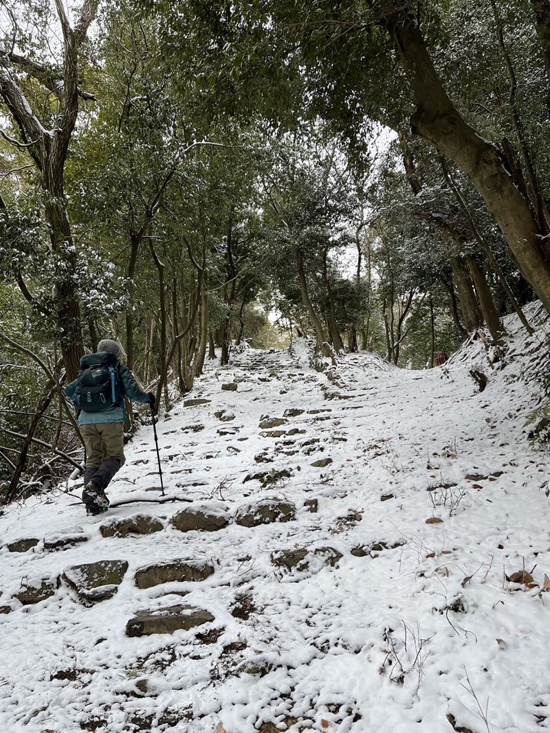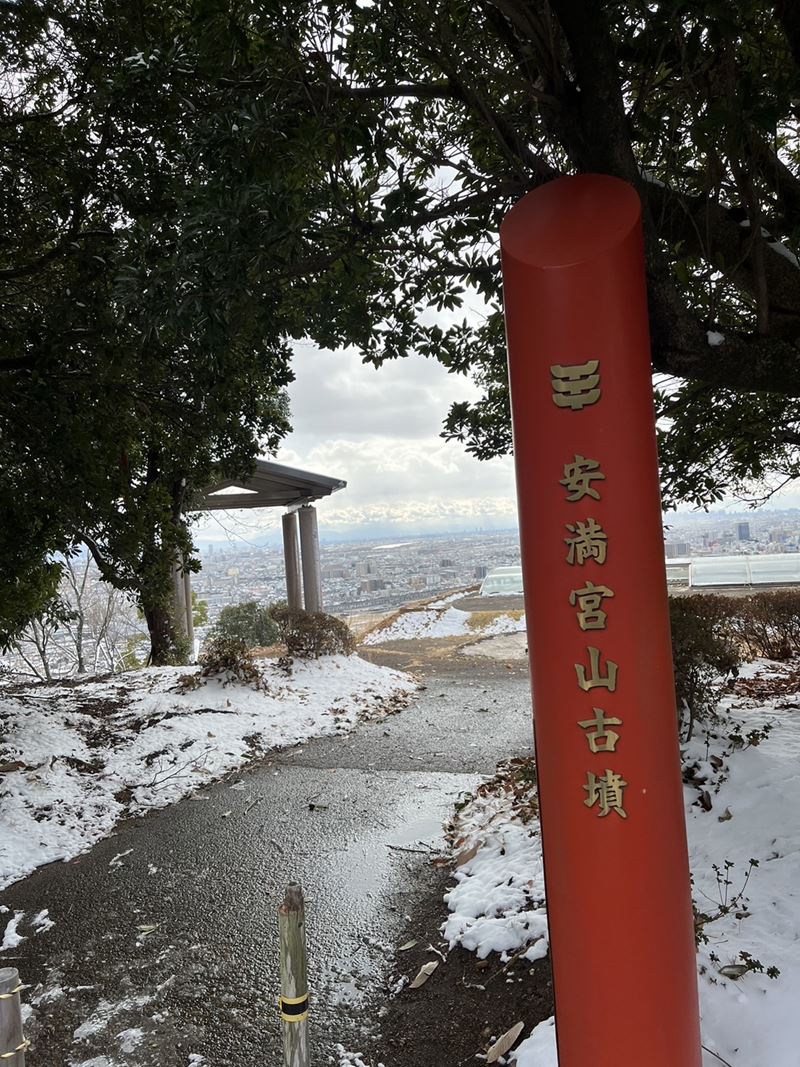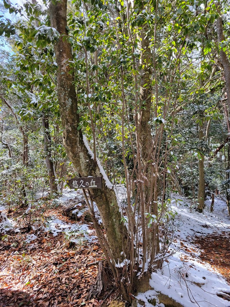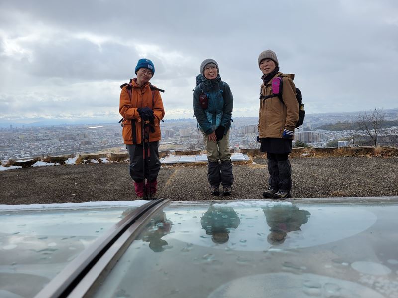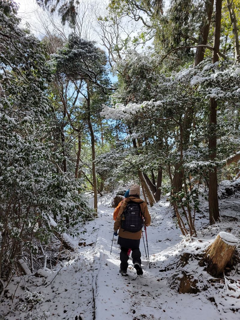 磐手橋行のバスは約1時間遅れでしたが来てくれたので、凍った舗装道路を歩かなくてすんでラッキーでした。今日はアイゼンをつけてラッセルも覚悟、くらいに構えて山に入りましたが、登山道は拍子抜けするくらい雪が少なく、日が高くなるにつれ青空も見えてきて、キラキラ美しい雪景色を楽しむことができました。歩き始めた時間が遅かったので、若山三角点には寄れませんでしたが、悠久の丘や安満宮山古墳からの眺望も良く、下山後はお楽しみの旧京大農場本館レストランでおいしいランチをいただきました。(H.K)