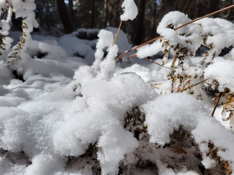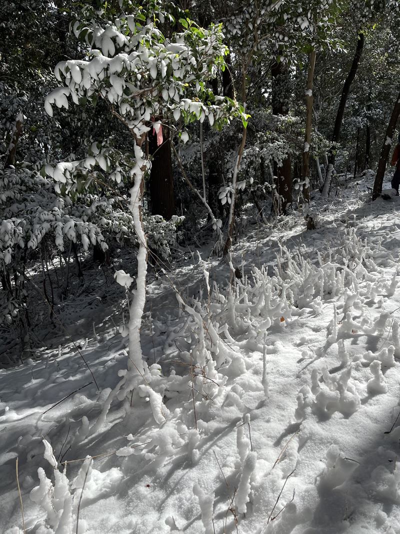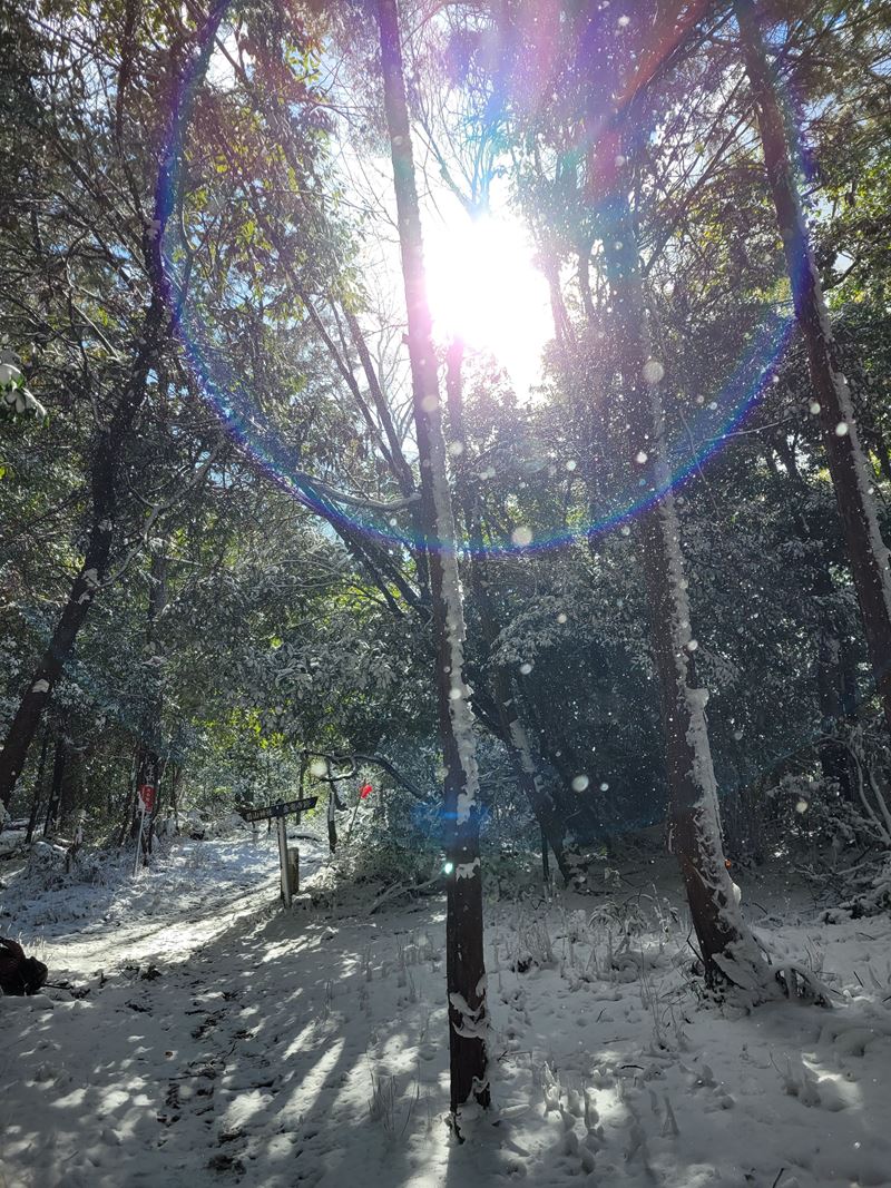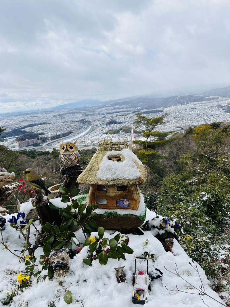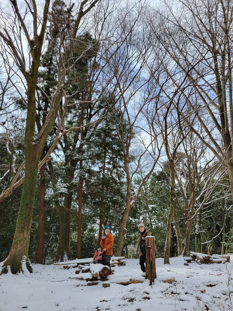 磐手橋行のバスは約1時間遅れでしたが来てくれたので、凍った舗装道路を歩かなくてすんでラッキーでした。今日はアイゼンをつけてラッセルも覚悟、くらいに構えて山に入りましたが、登山道は拍子抜けするくらい雪が少なく、日が高くなるにつれ青空も見えてきて、キラキラ美しい雪景色を楽しむことができました。歩き始めた時間が遅かったので、若山三角点には寄れませんでしたが、悠久の丘や安満宮山古墳からの眺望も良く、下山後はお楽しみの旧京大農場本館レストランでおいしいランチをいただきました。(H.K)