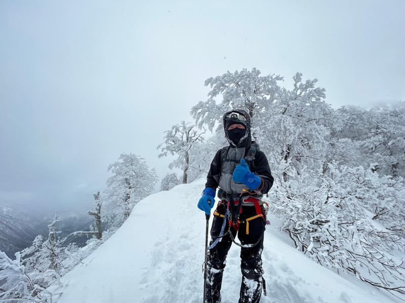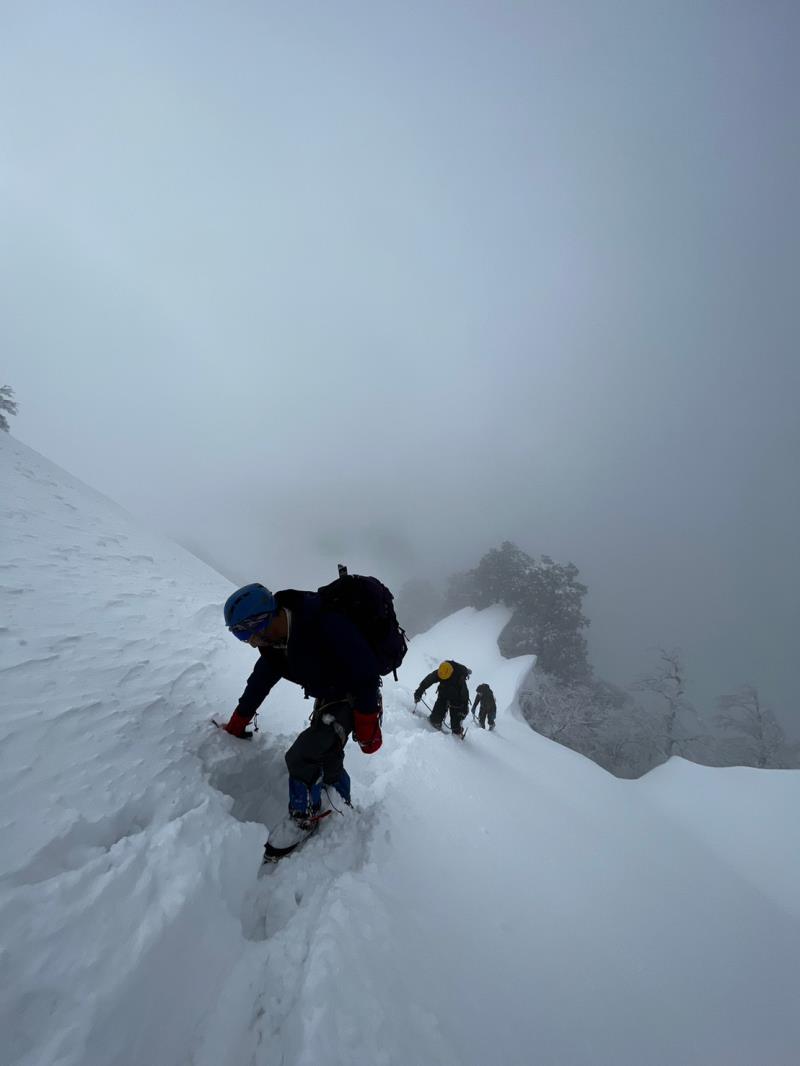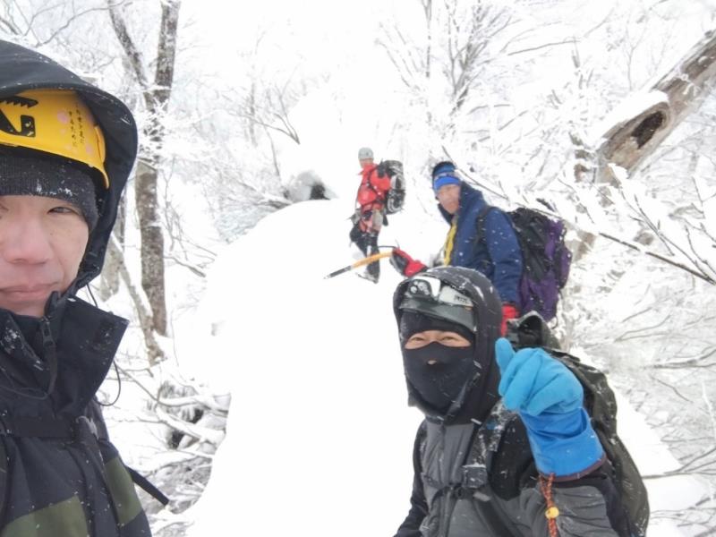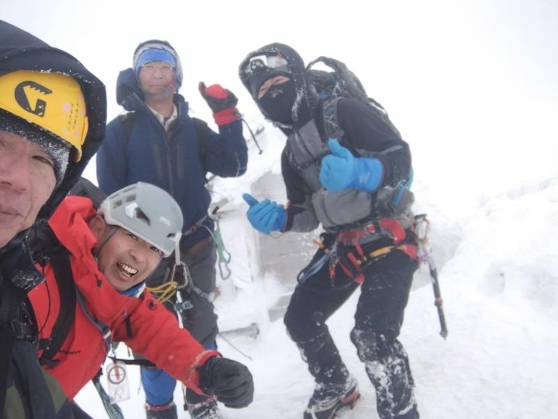 ようやくイージーな雪稜かと思いきや、強風の中、巨大な雪庇が張り出した細尾根を通過。この辺りからホワイトアウトに近い状態で風雪が強くなる。山頂稜線までは少し緩んだ雪と強風。何とかピークに到着すると50代から60代のおっさん達が喜びのハグ。