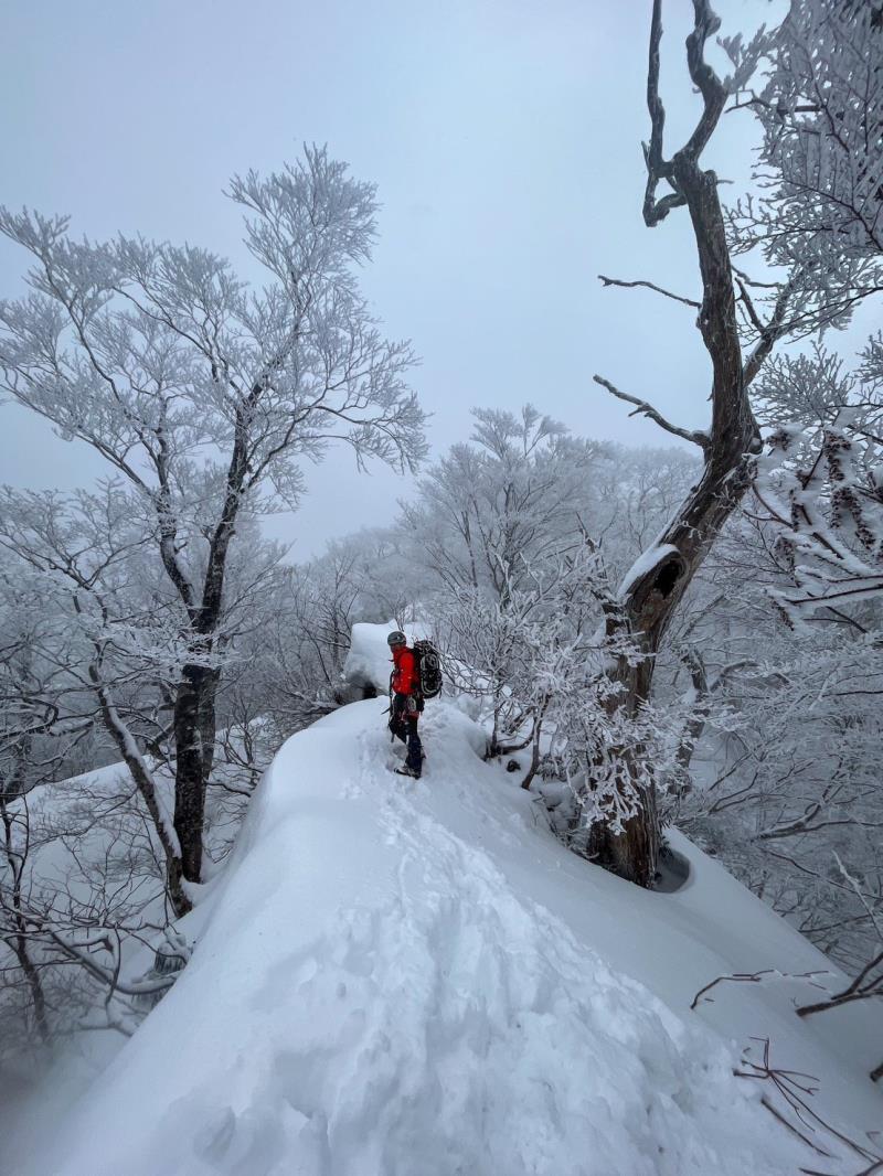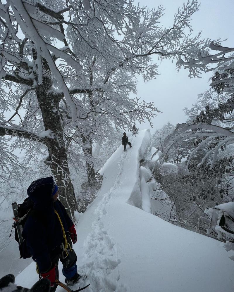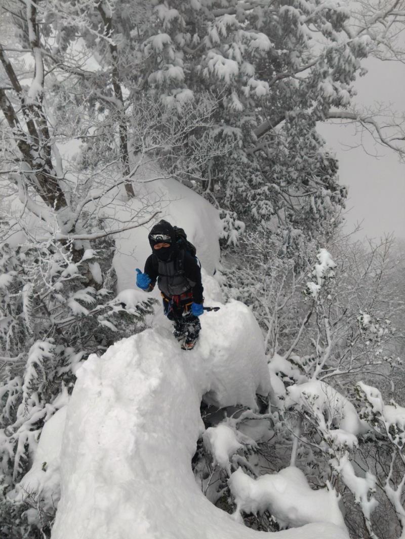 そのあとは雪壁、細尾根やナイフリッジ、キノコ雪、時々落とし穴という具合で気の抜ける場所がほぼない状態が続きヒメマチに到着。