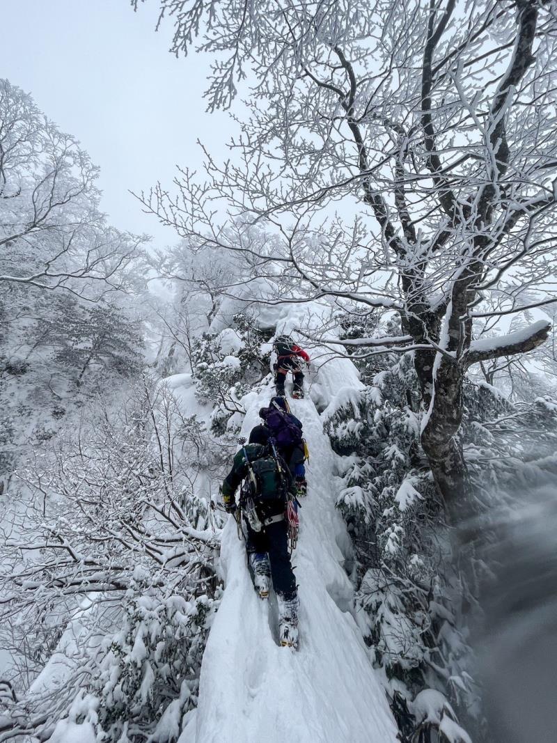 あと少しで取付きというところで雪が切れて滝が出てきた。撤退か?というところで先行パーティーが巻道を見つけてくれたおかげで取付きに到着。