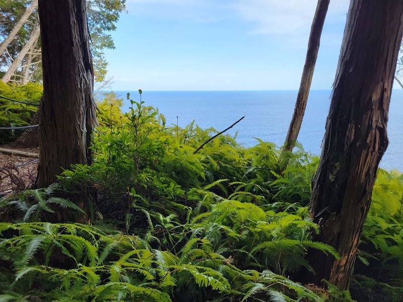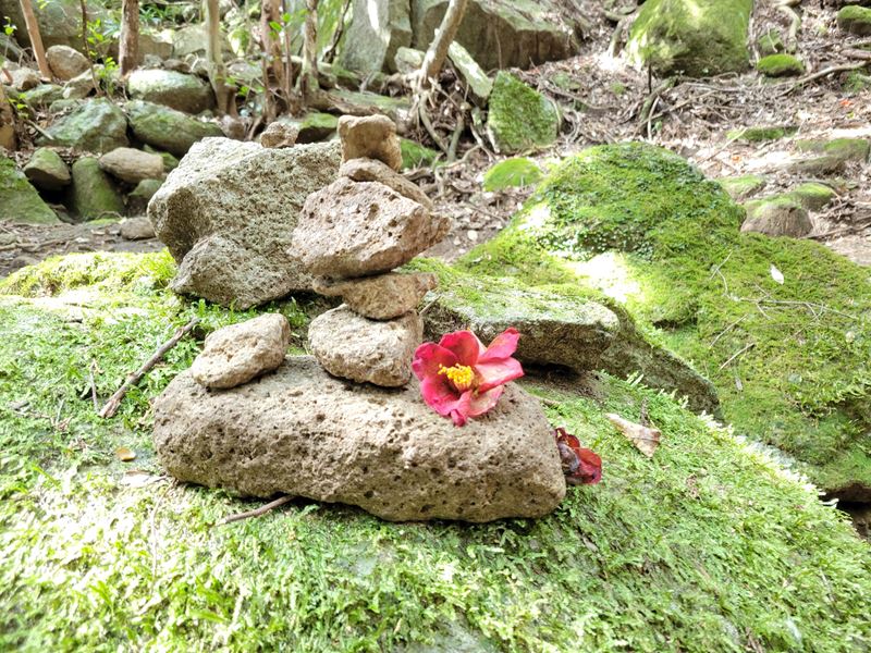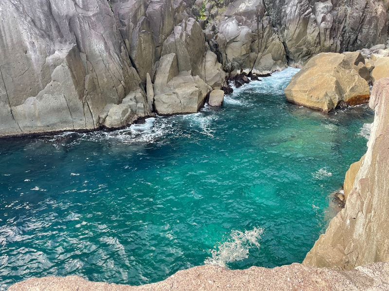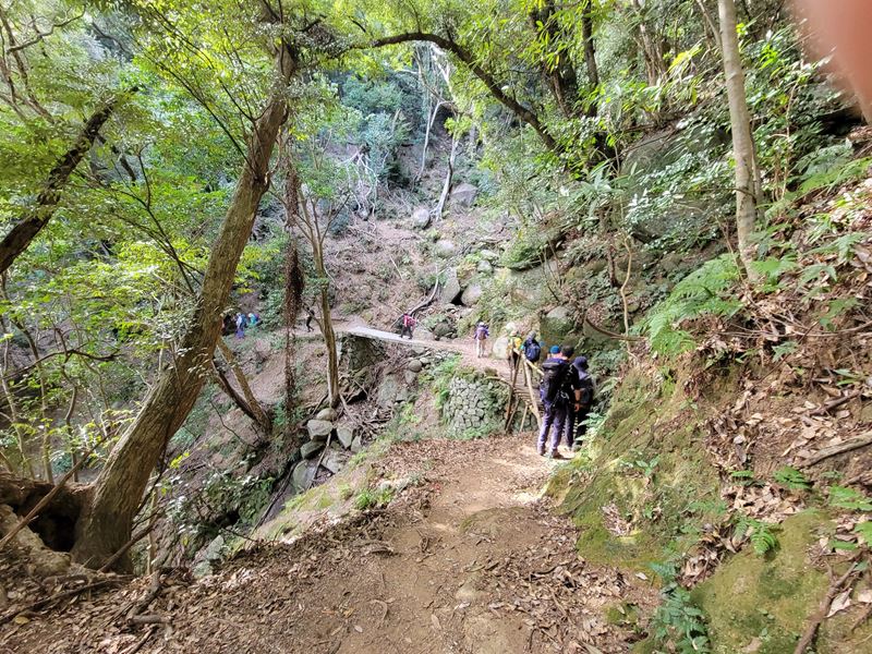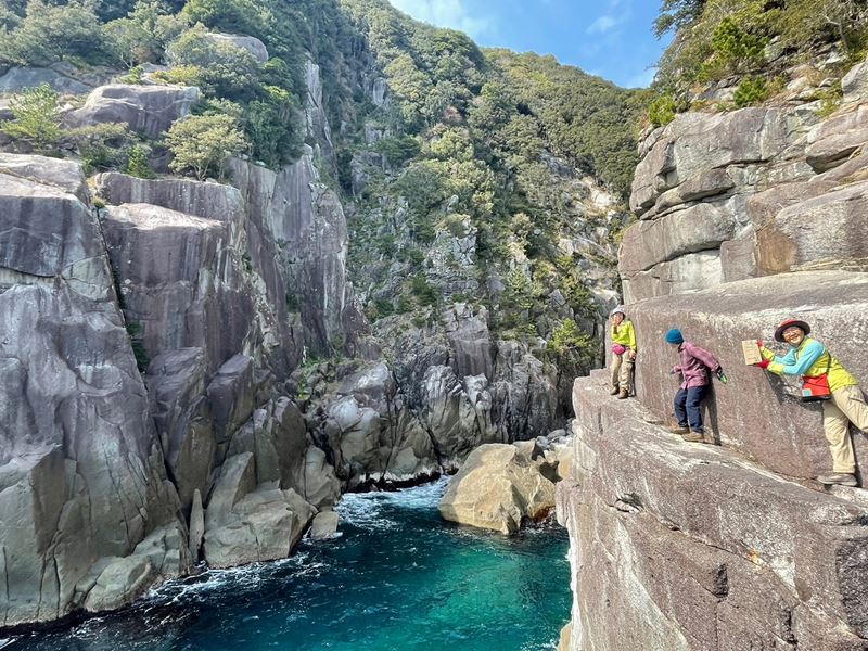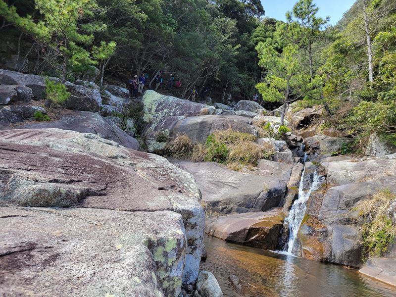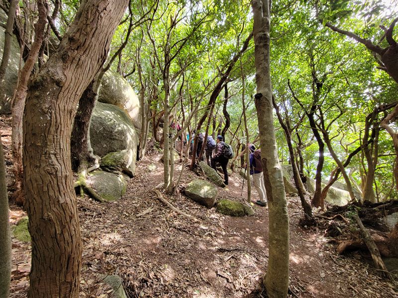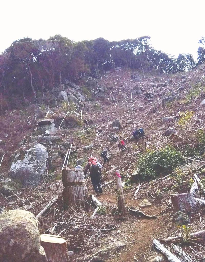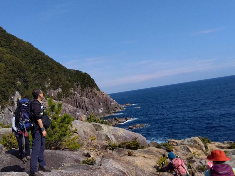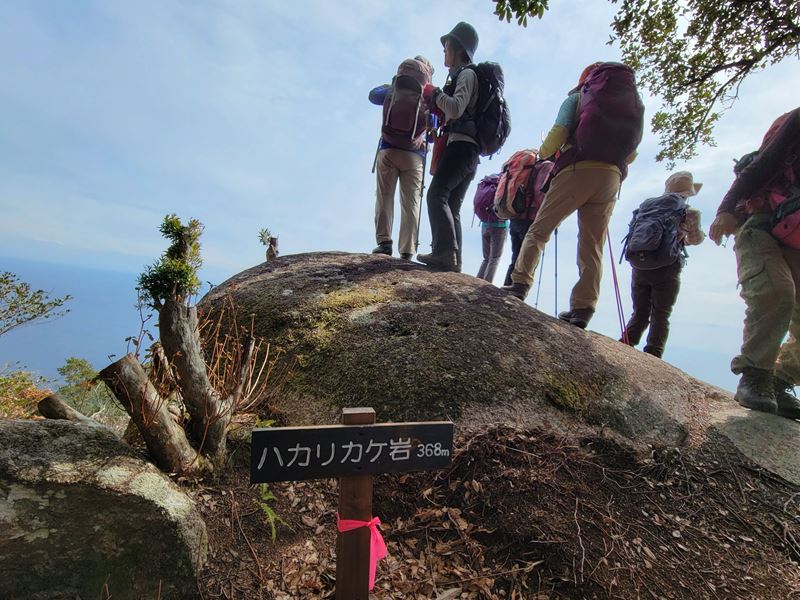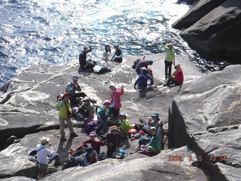 登山口10時頃出発 階段道からゴロゴロ岩の道に変わり、やがて視界の広がる伐採された山肌に。 振り返ると奥の方まで続く山々と小島が浮かぶ海の景色が有りました。ここで小休止。 再び登って頂山を踏みハカリカケ岩迄来てランチタイム。 待望のオハイで時間が取れるようLの配慮で先を急ぎます。 谷筋を降りてくると広がる岩盤に歓声の声が上がる。 天気は最高、風は穏やかオハイブルーです。 各々にポーズをとり写真に納めたり、ティータイムを楽しんだり。 暫く散策の時間も取れてとても素敵な時間がもてました。 後ろ髪を引かれながらも整備された山を周回し漁船の並ぶ街に4時頃に到着。 山行中ずっと誰もの笑い声が絶えず楽しい山旅でした。 遠い道のりを長時間の安全運転はほんとにお疲れ様です。有難うございました。