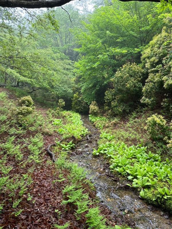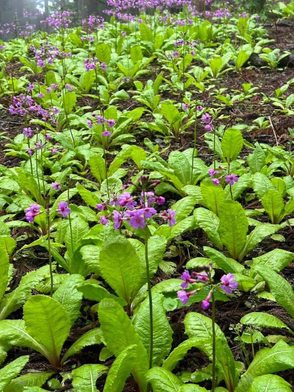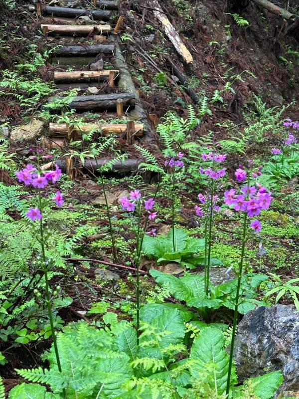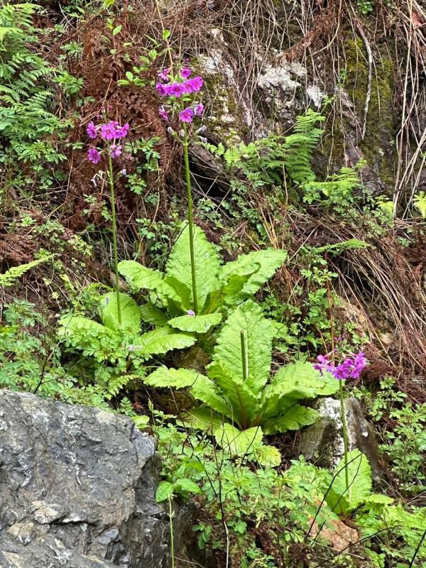 天気予報は,一日雨予報のため 急遽雨天訓練としての例会に変更。参加者2名で予定通りのルートで決行しました。神社トイレ手前のクリンソウは一段目のみ開花。上段はつぼみ。ボランティアさんのおかげで毎年花の面積が広がっています。地蔵山ピストン後、谷筋のクリンソウの群生地は沢山の株があれど 花はちらほらで期待外れ。梨の木谷の下りは雨で濡れているため要注意。谷のところどころにクリンソウが可憐に微笑んでくれました。この辺りのの下段はもう散っており上段のみ。雨は思ったより降らず、ほぼ雨具いらずの例会でしたが雨天トレーニングには適した一日でした。