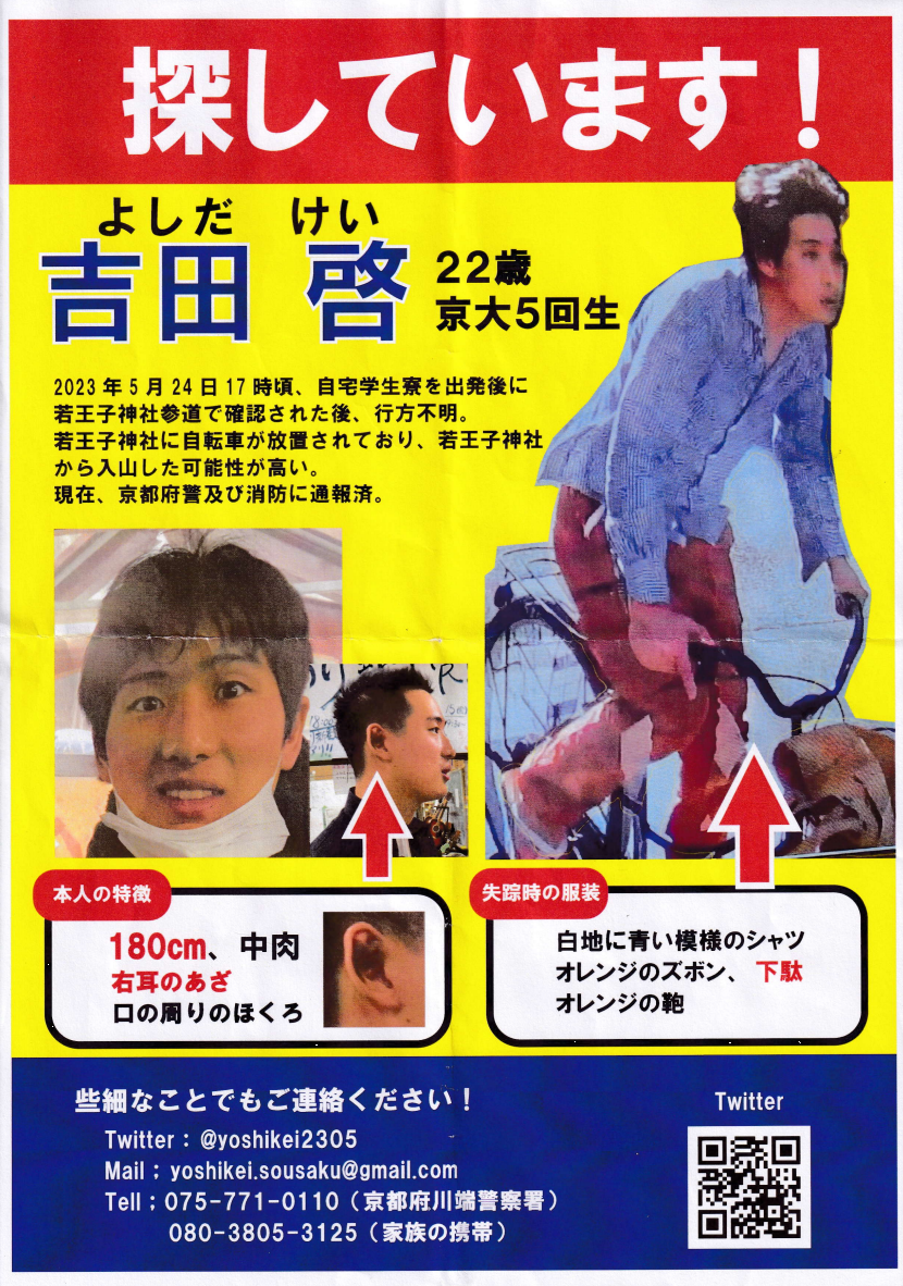 *[アルバムの最後の写真] 将軍塚の公園で、行方不明になった友人を探しておられる方に会いました。お心当たりがありましたら、些細なことでも警察などへの連絡をお願いします。(HP部 H.K)